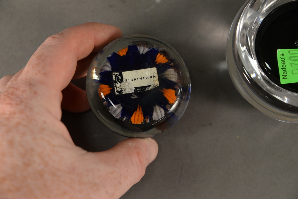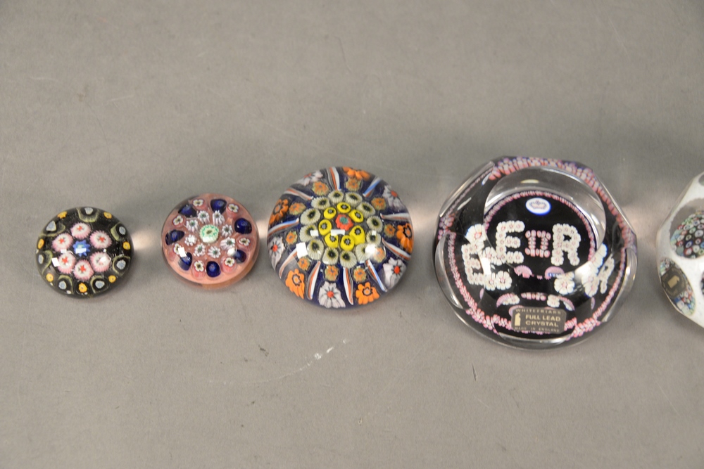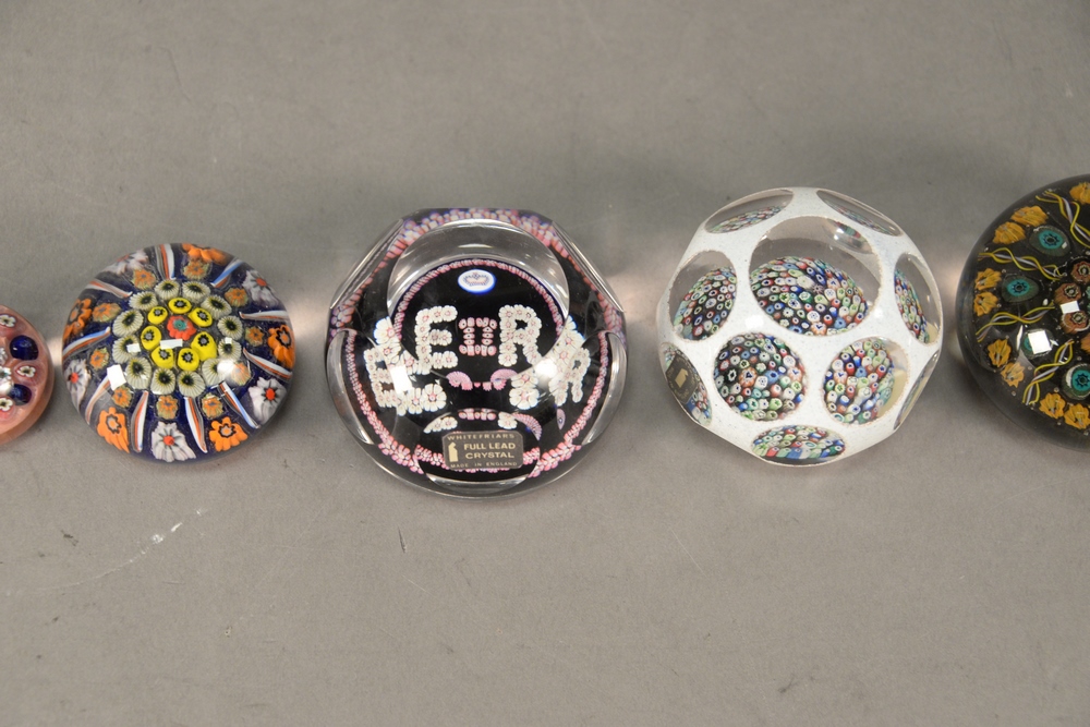 Seven Piece Group of Strathearn and Whitefriars Millefiori Glass Paperweights, to include two Whitefriars dated 1972 and 1977, along with five Strathearn, each with labels adhered. Provenance: Estate of James Wadhams.