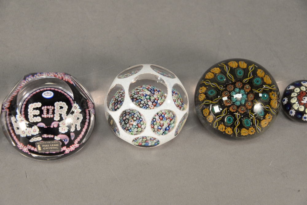 Lot 319: Seven Piece Group of Strathearn and Whitefriars Millefiori Glass Paperweights, to include two Whitefriars dated 1972 and 1977, along…