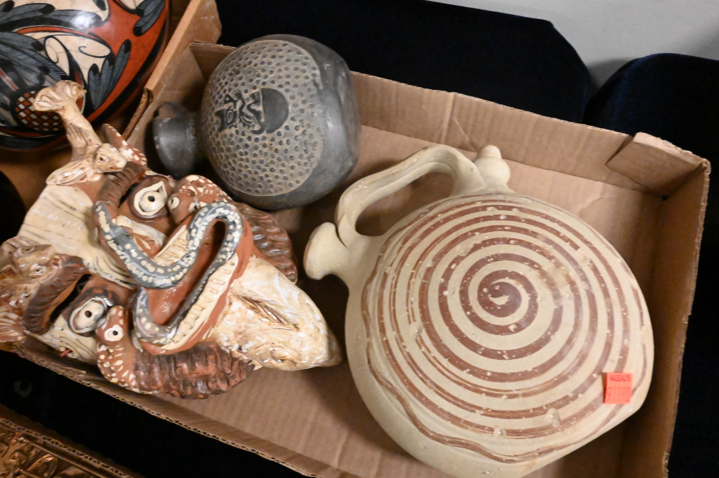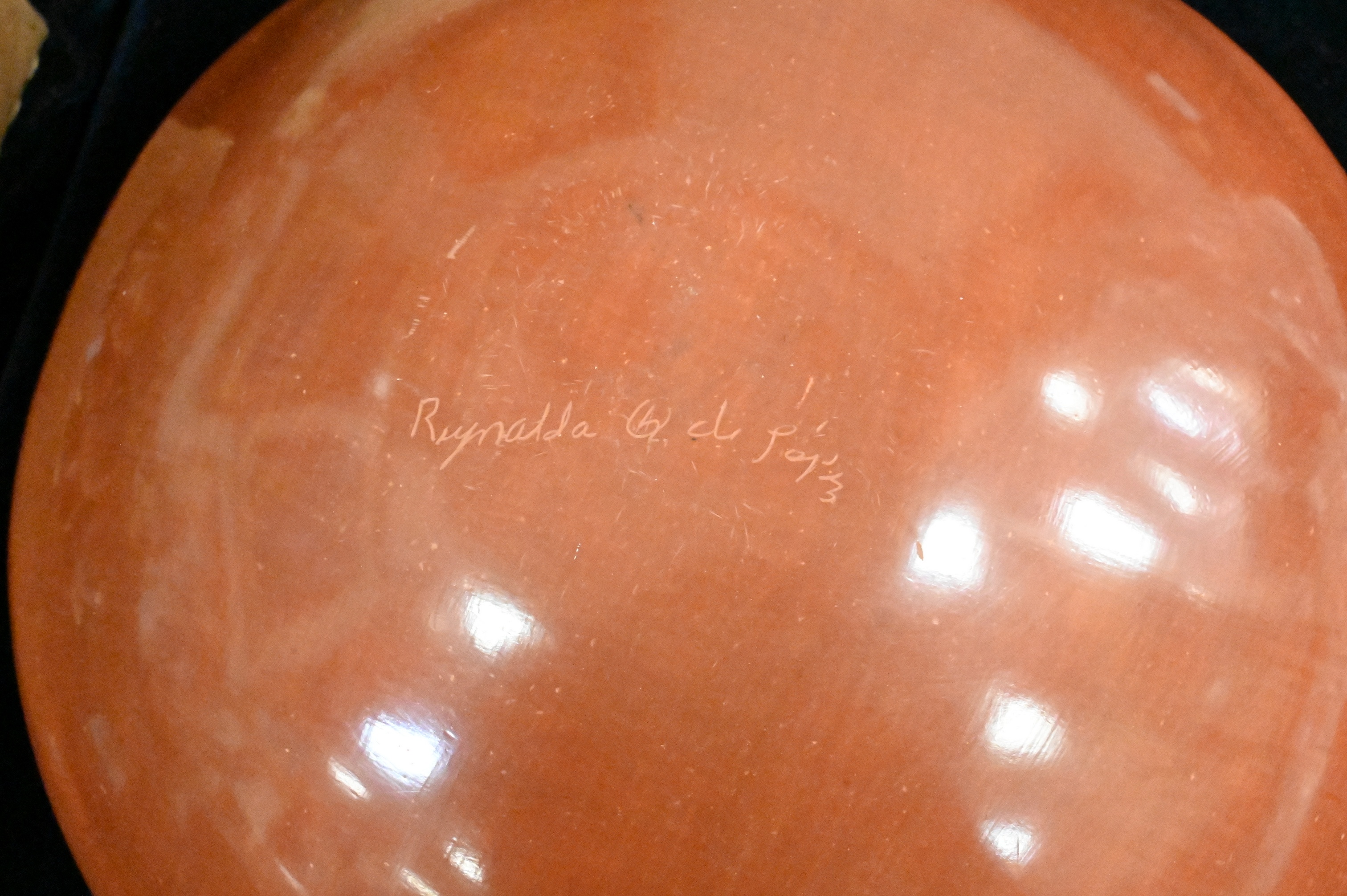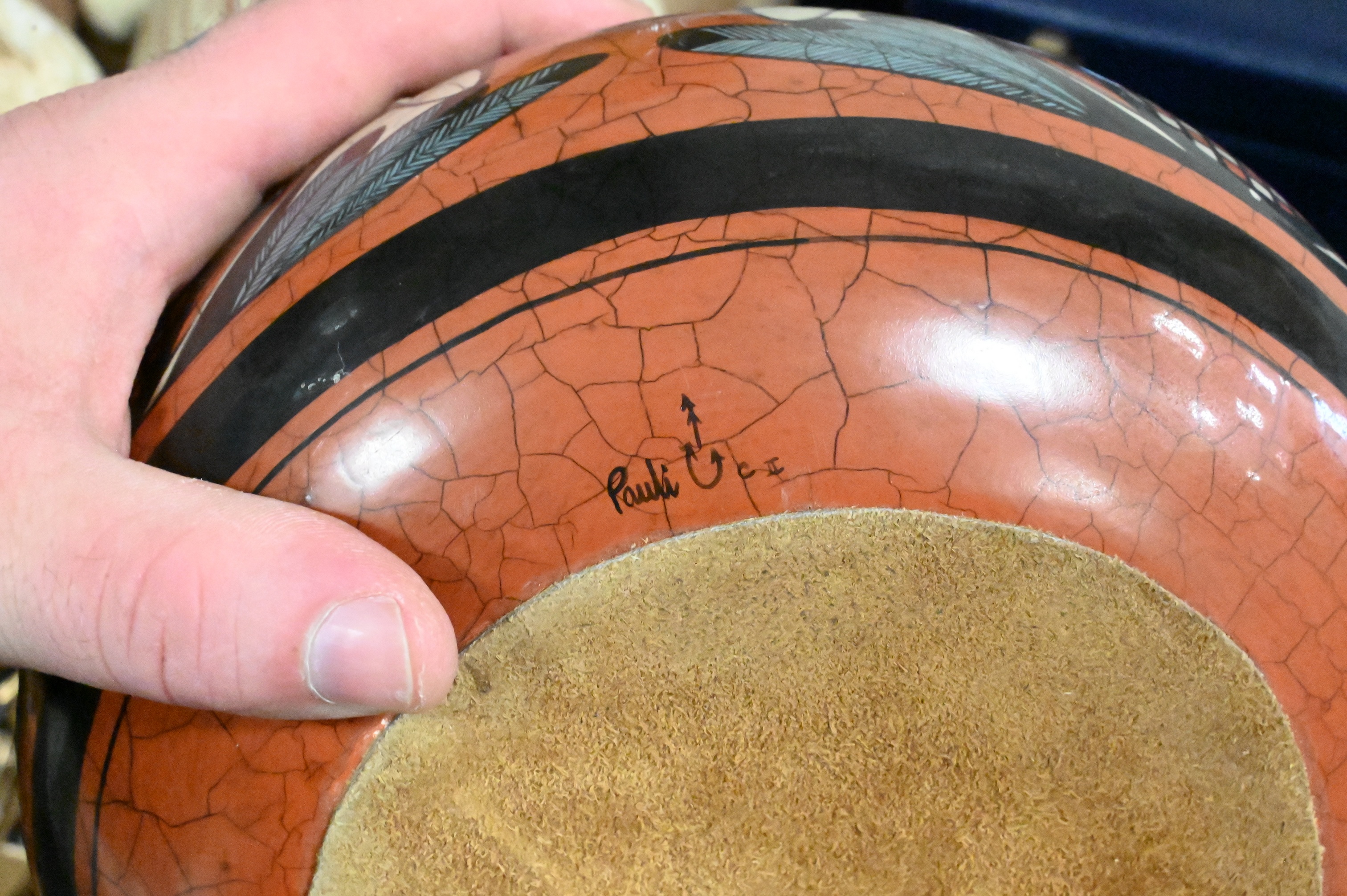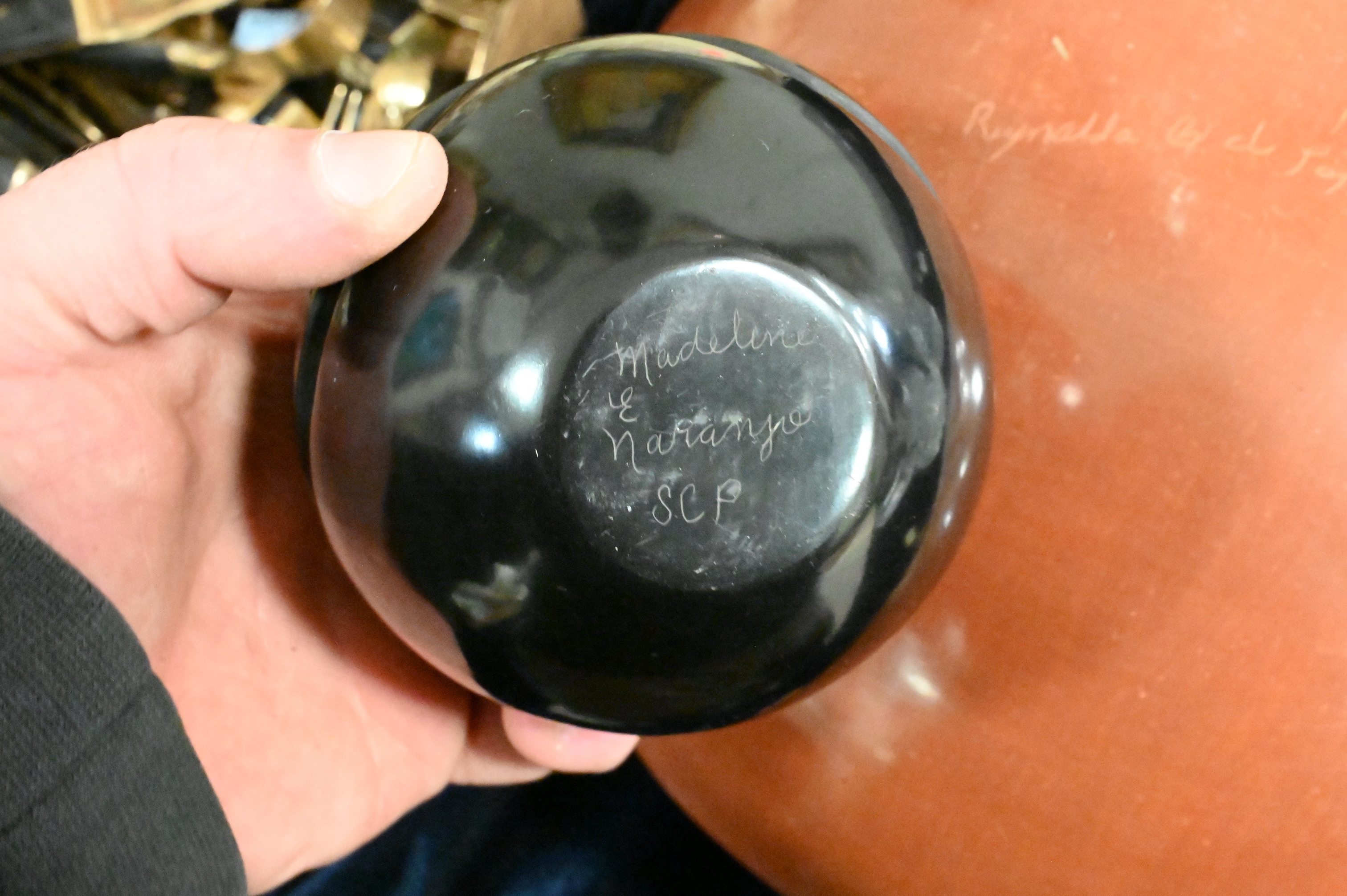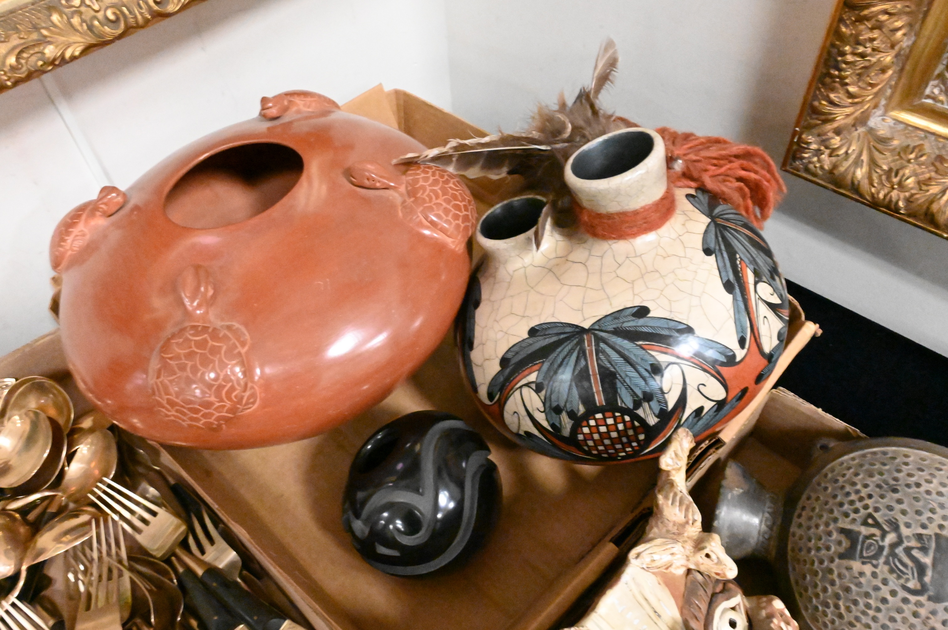 Reynalda Quezada de Lopez pottery vase having raised turtle/tortoise motif, diameter 12 inches, Madeline Naranjo Santa Clara blackware vase, 1970’s Navajo crackle vase signed Pat Pauli, signatures to underside, Chimu blackware vessel with double handle and figural motif and stirrup flask or pilgrim canteen