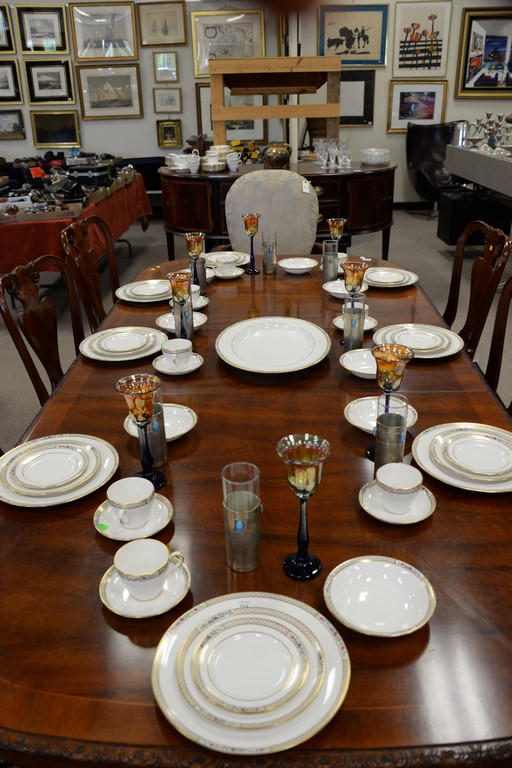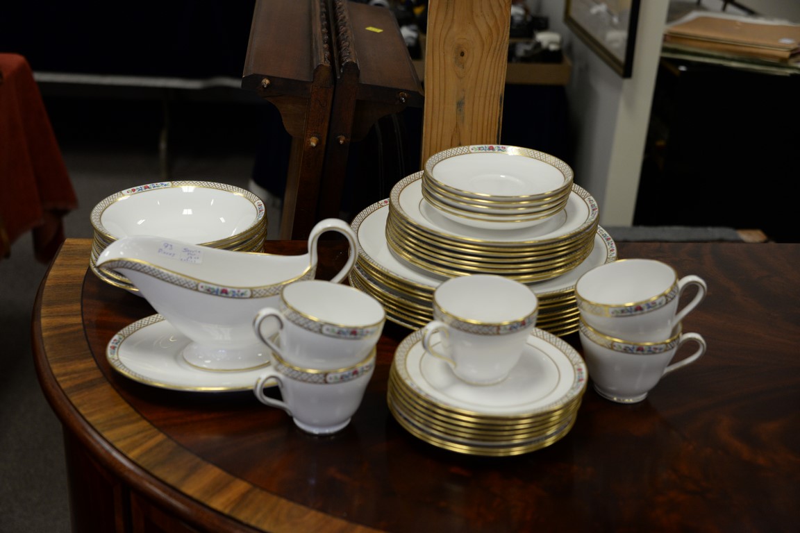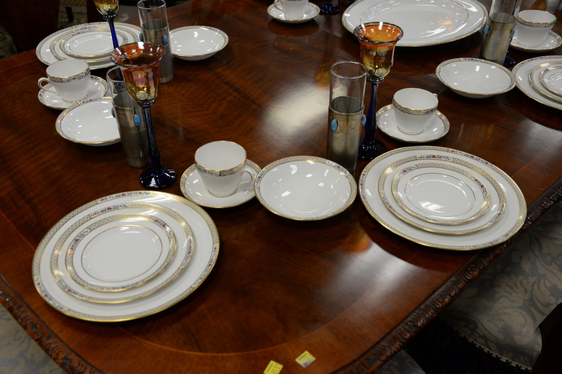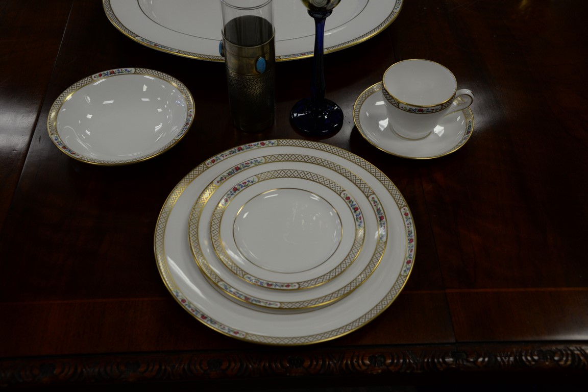Lot 319: Spode fine bone china dinner set, marked Spode Fine Bone China England 18405-1 Golden Trellis, 93 total pieces, service for 13 plus …