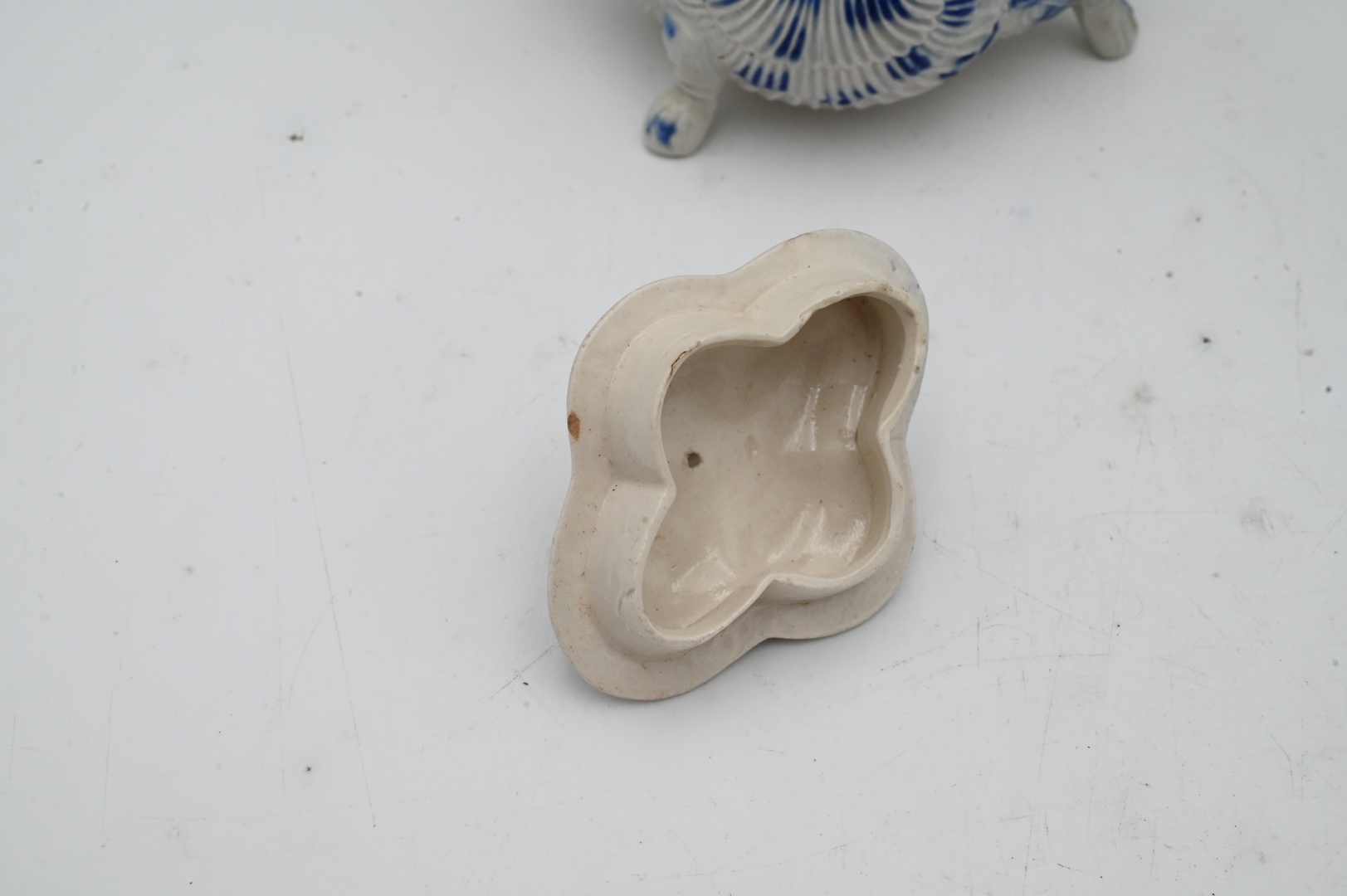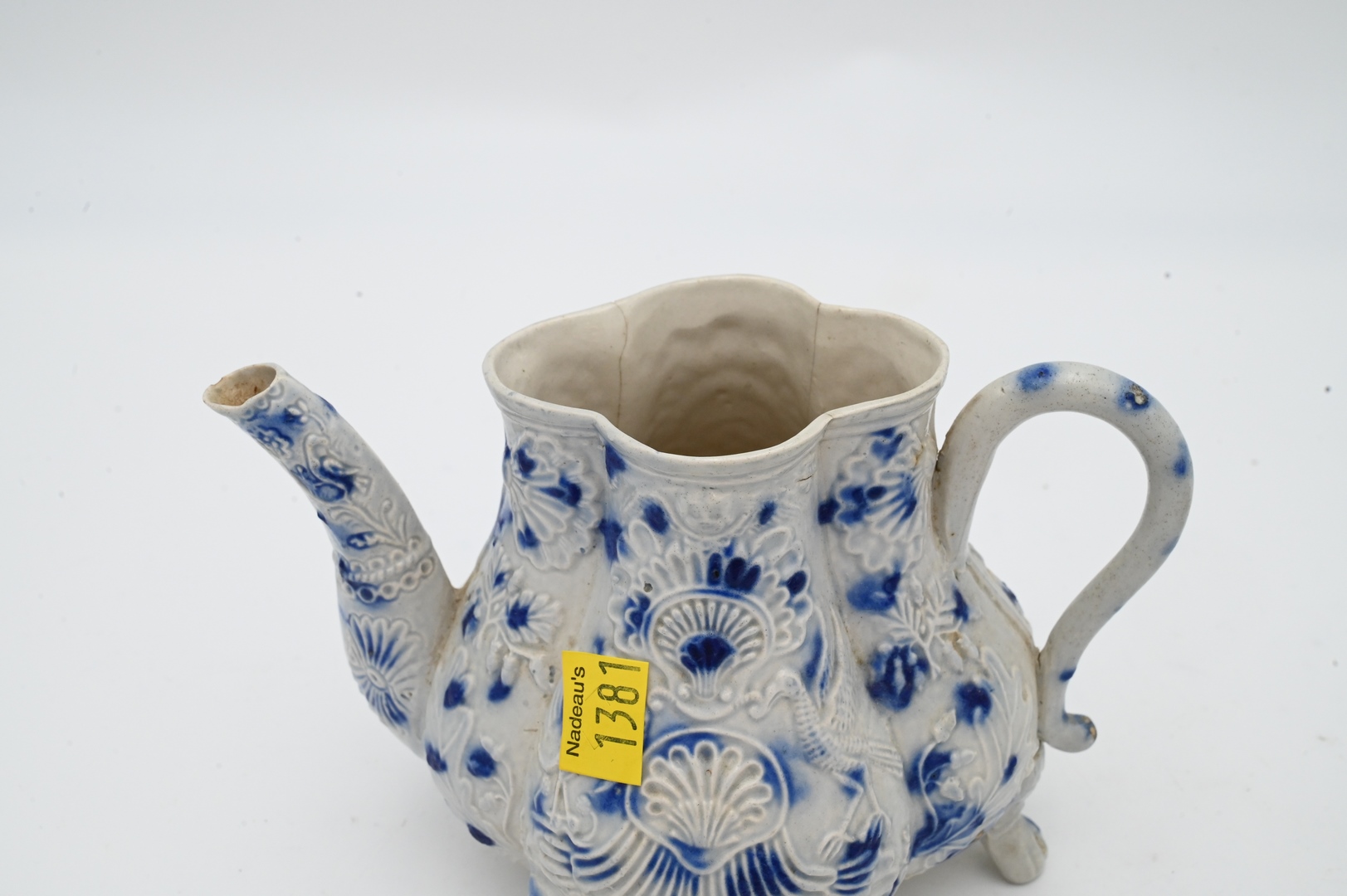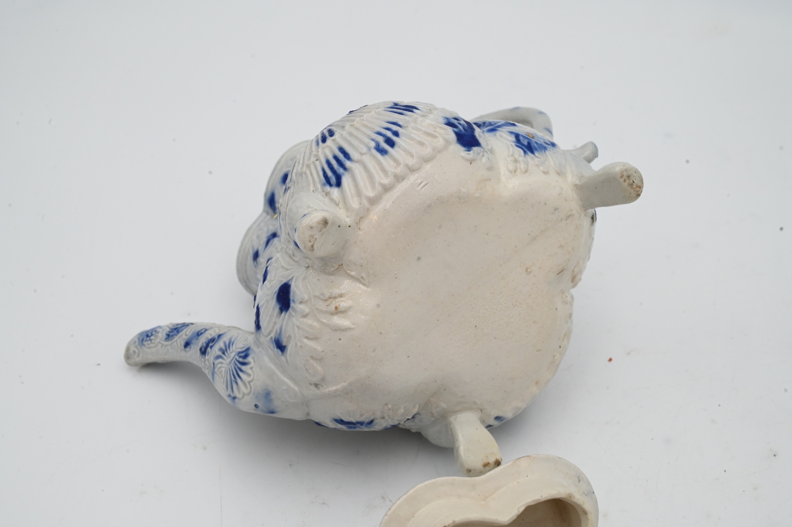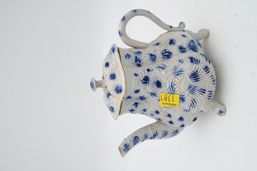 Staffordshire White and Blue Salt Glazed Stoneware, to include a shell teapot with cover, 18th century with molded spout, set on claw feet, cracks in making, chip on spout, height 6 inches.