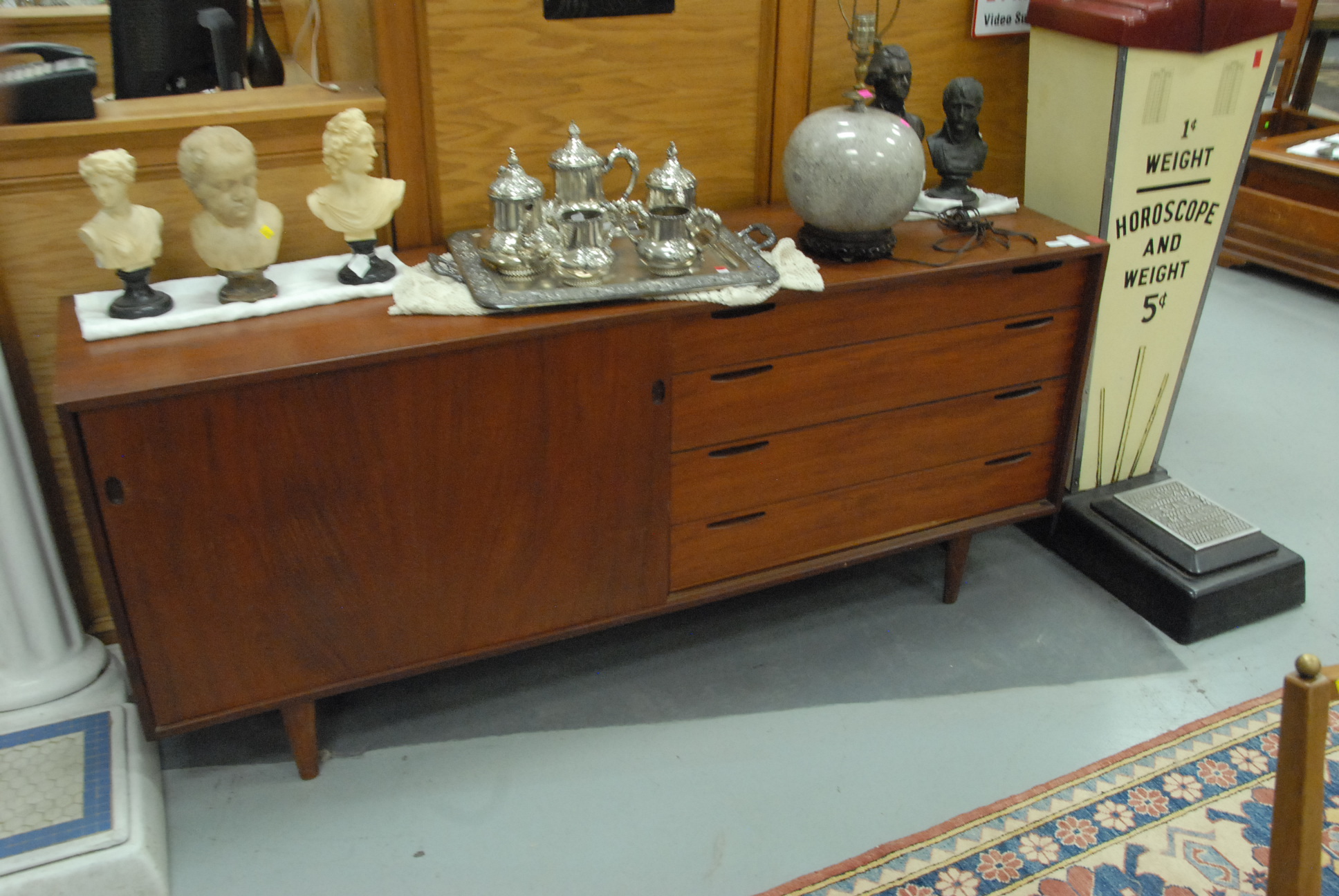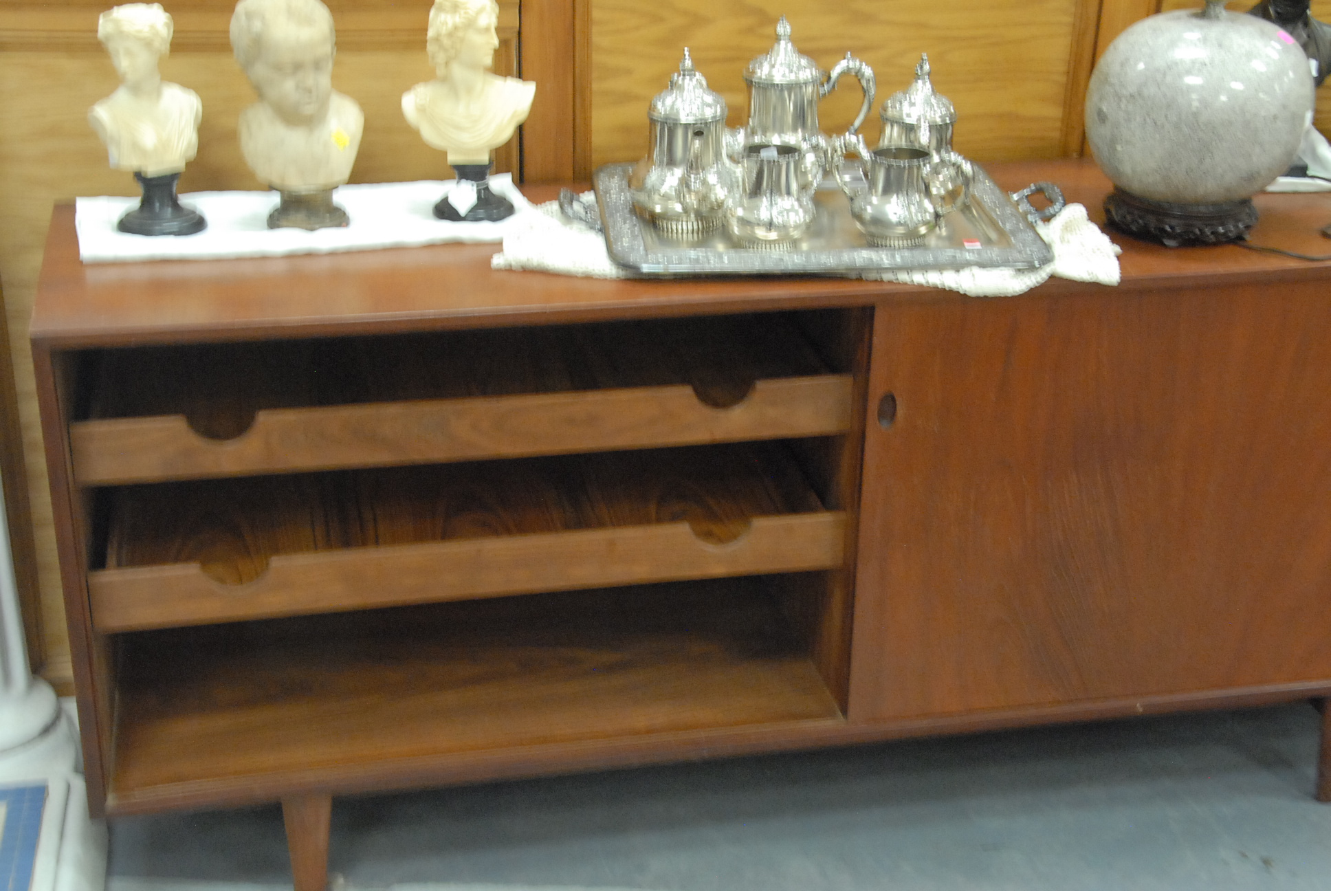 Lot 319: Teak buffet / sideboard made in Denmark and designed by Jorgen Clausen set on short wooden dowel legs with the cabinet consisting of…