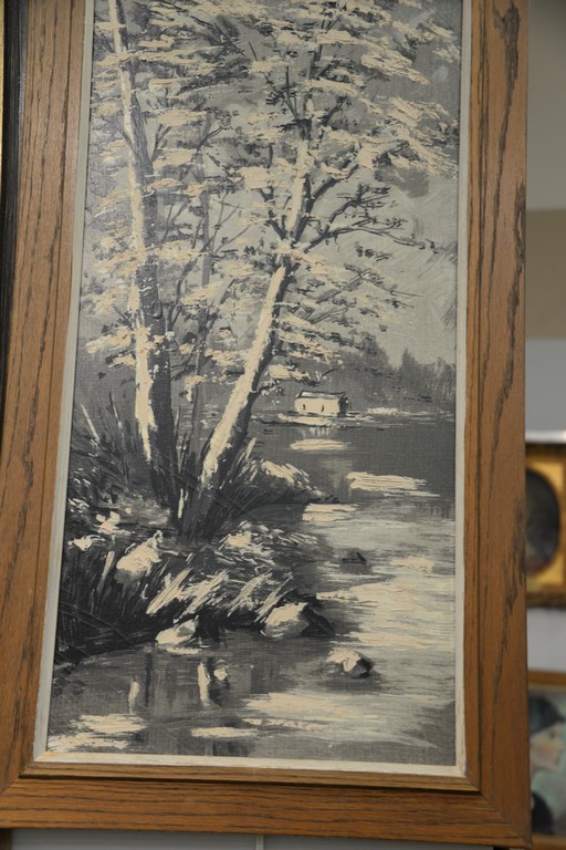 Three paintings including Moshe Gat 1935, watercolor wash on paper with two boys, signed lower right: Moshe Gat 64′ and two oil on canvas winter landscapes having Escuela Bella artes, label on verso. 10 x 25 1/4 to 30 x 15 Provenance: Estate of Arthur C. Pinto, MD
