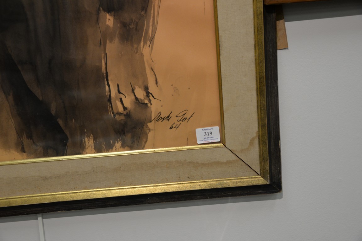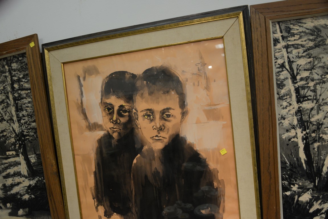 Lot 319: Three paintings including Moshe Gat 1935, watercolor wash on paper with two boys, signed lower right: Moshe Gat 64′ and two oil on…