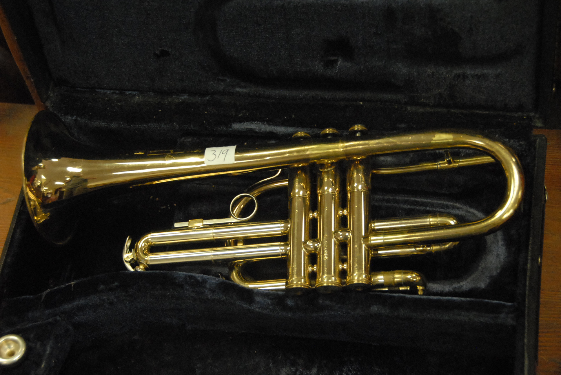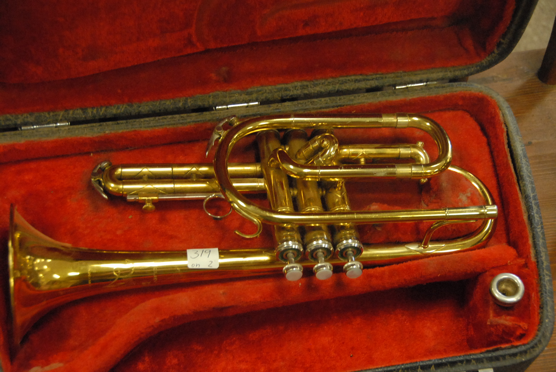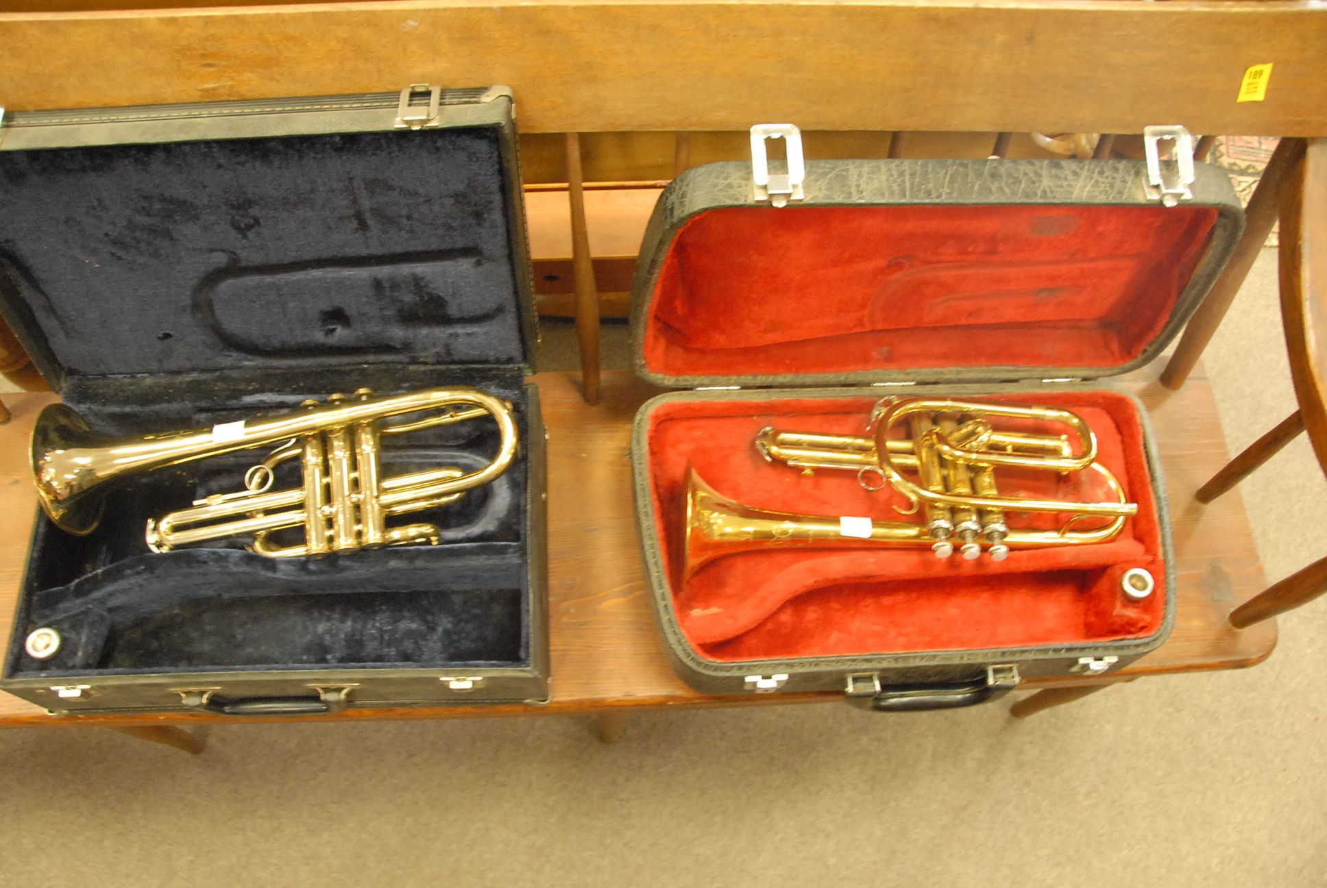Two brass trumpets, one marked Conn USA in blue fitted case other marked Cleveland 602 King Musical Instruments in red fitted case.