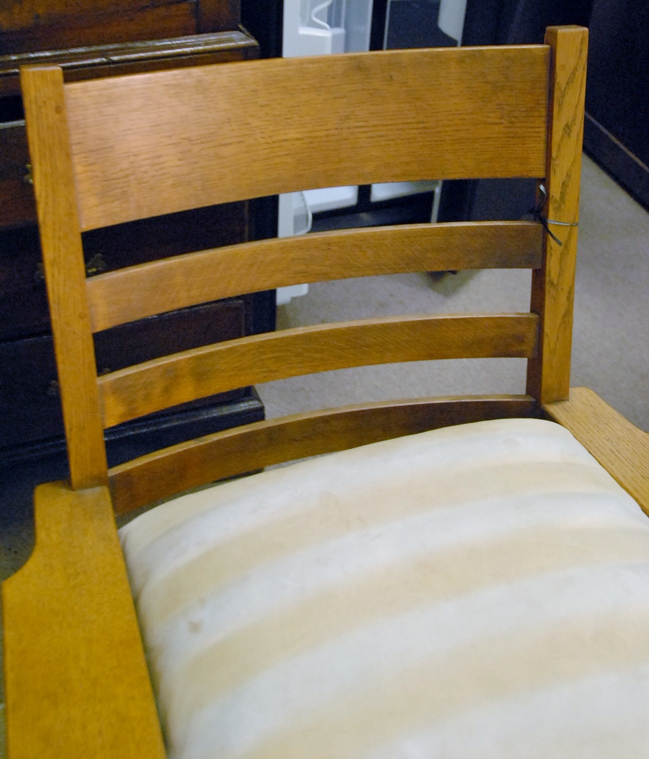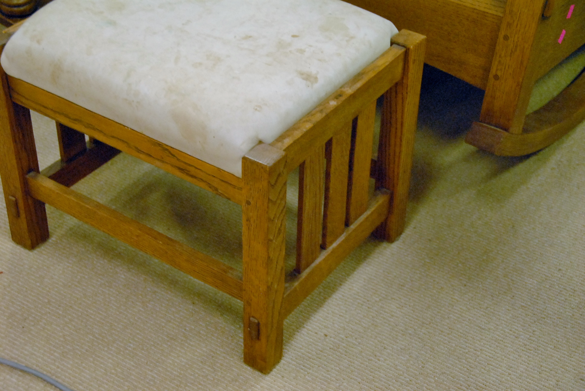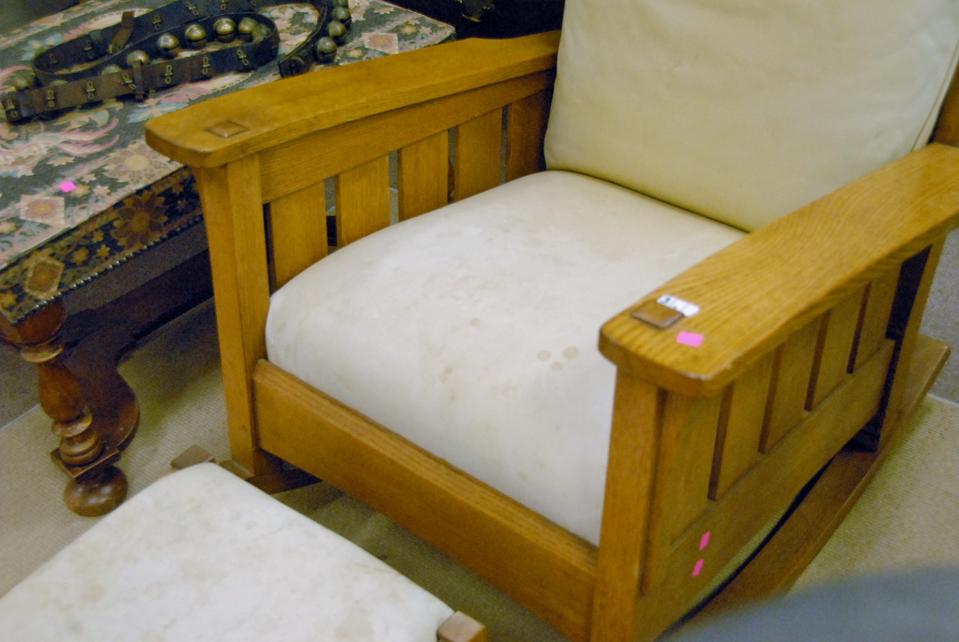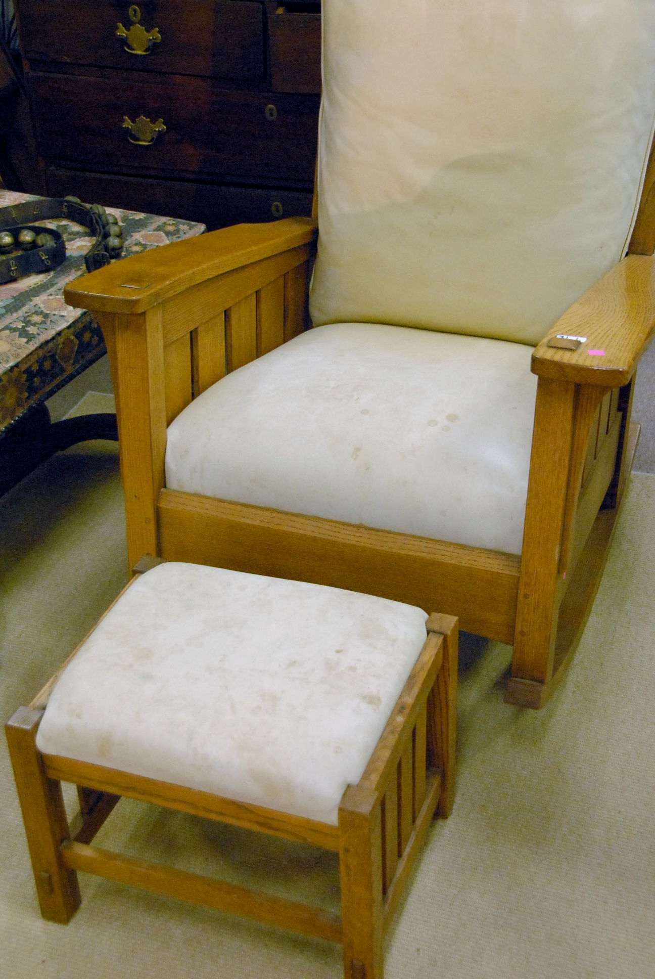 Stickley rocker with Stickley footstool having leather upholstered seat and back.
