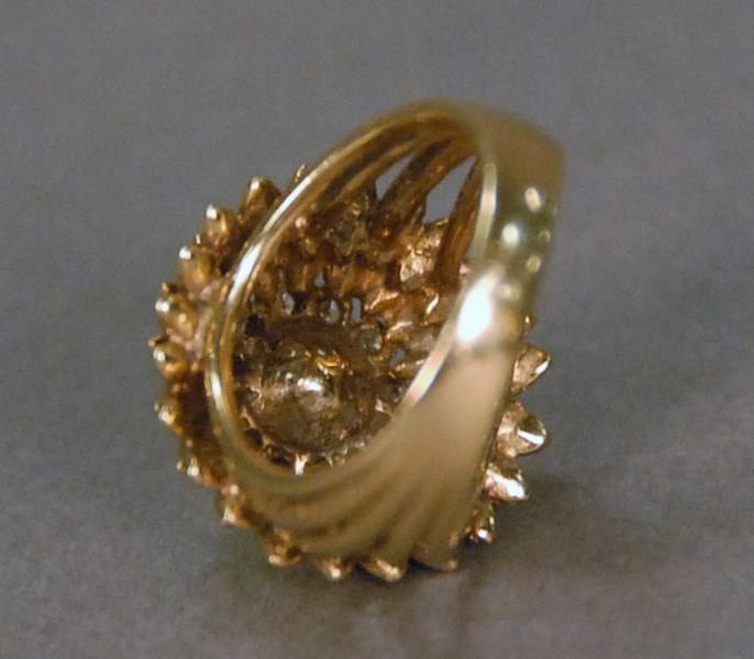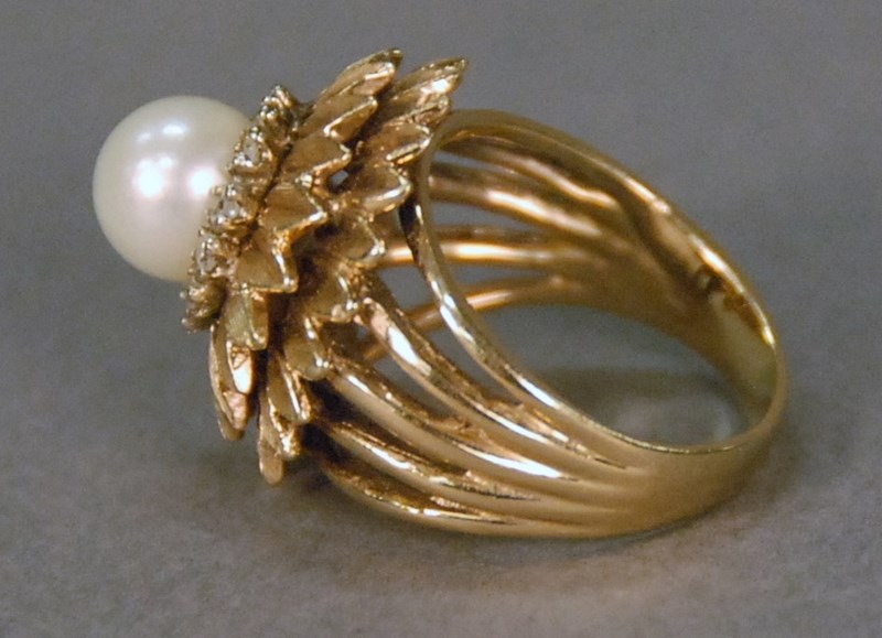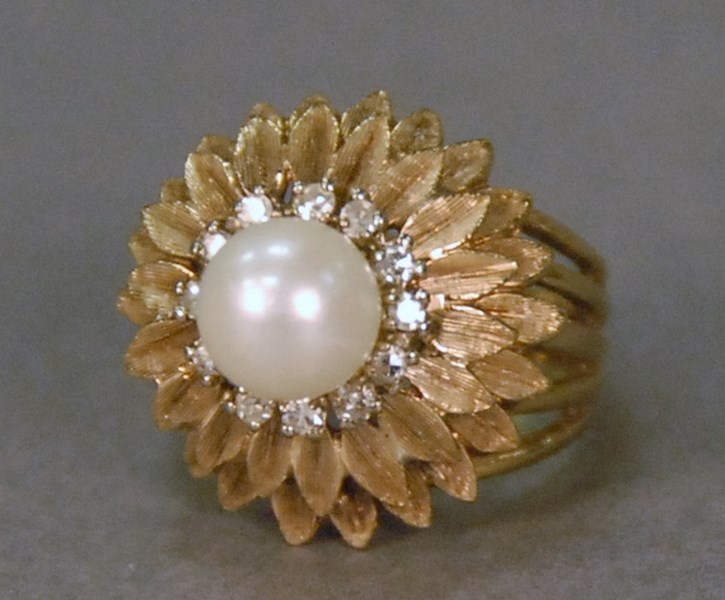 Lot 32: 14K gold ring set with center pearl surrounded by twelve small diamonds. 9.9 grams size 6 1/2