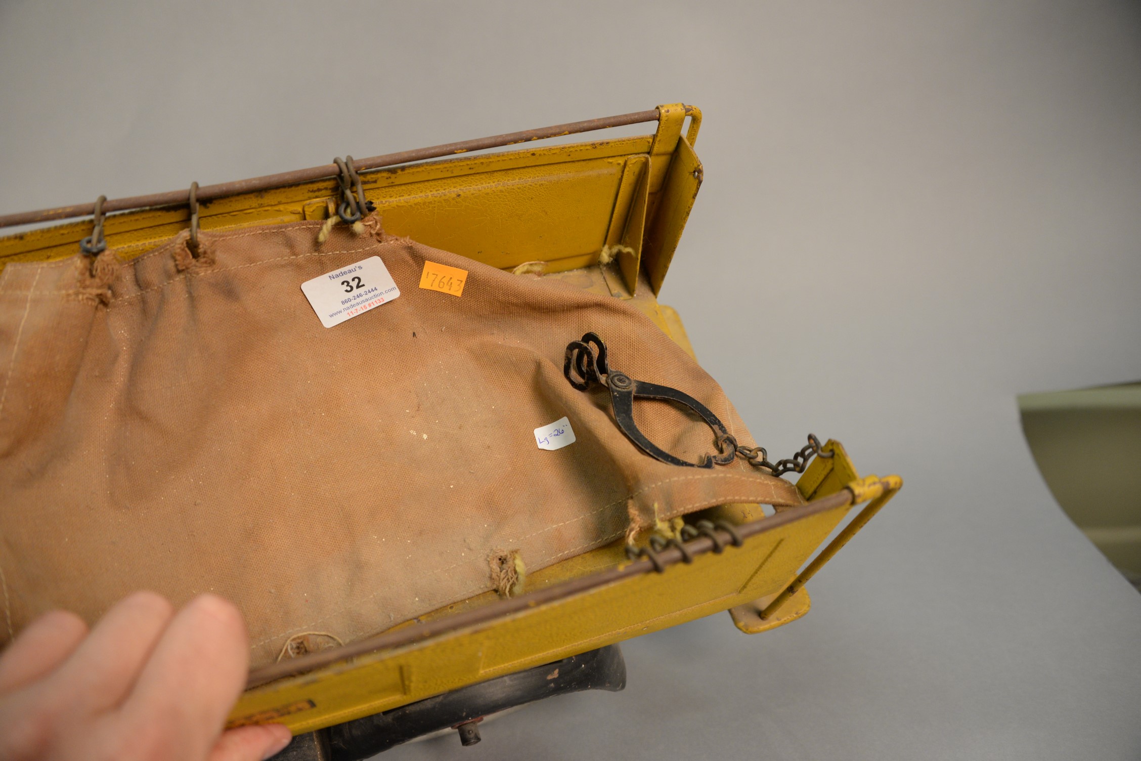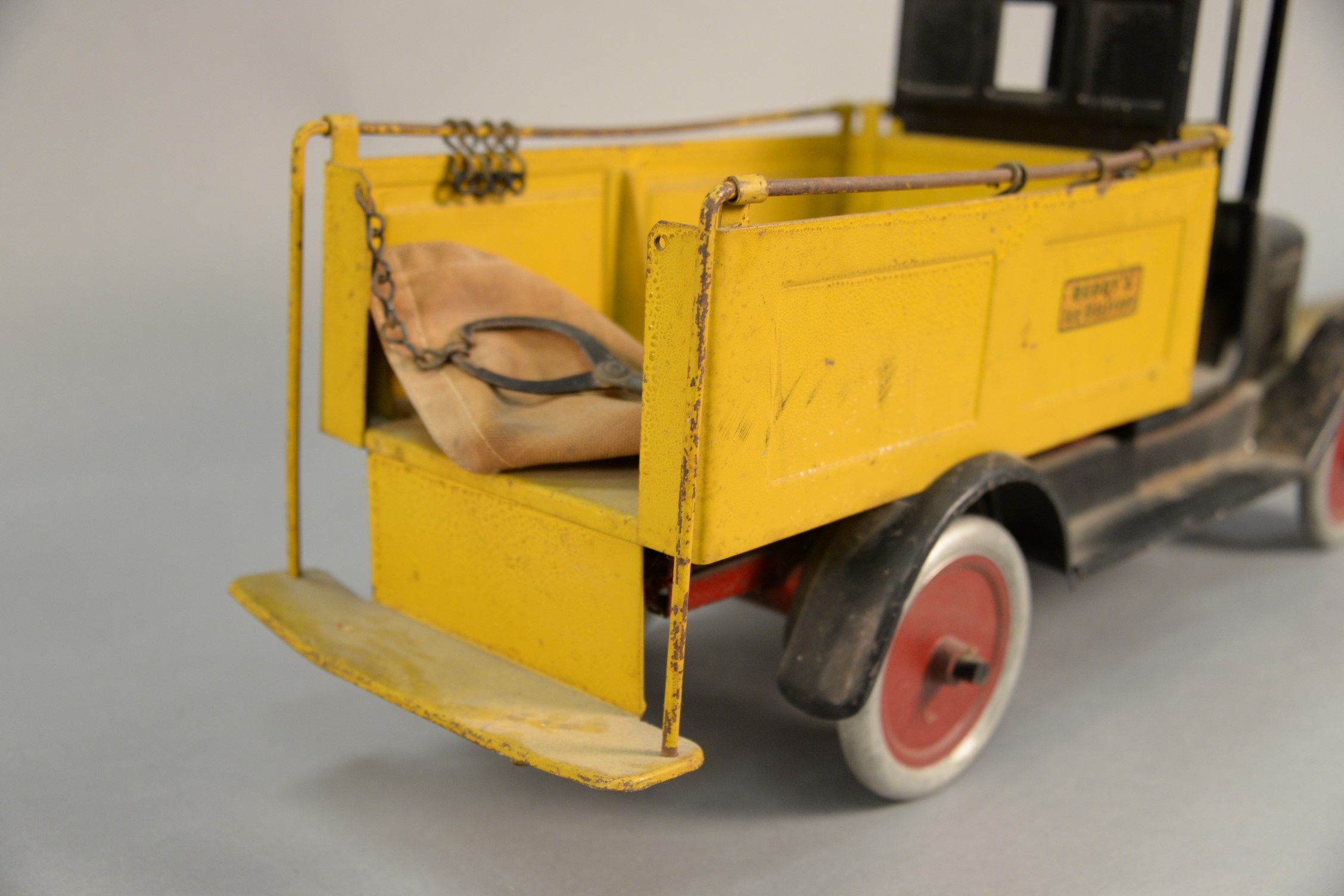 Lot 32: Buddy L Ice Delivery truck, classic 1920’s model truck with black open cab and yellow bed covered with sliding cloth cover for bed…
