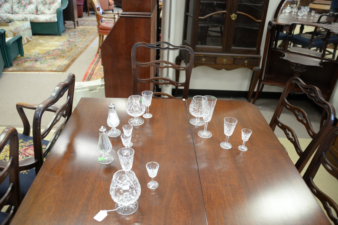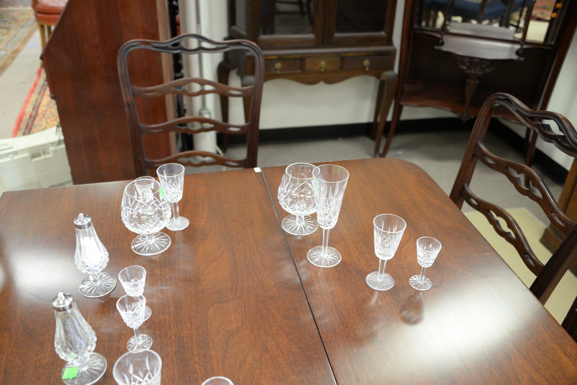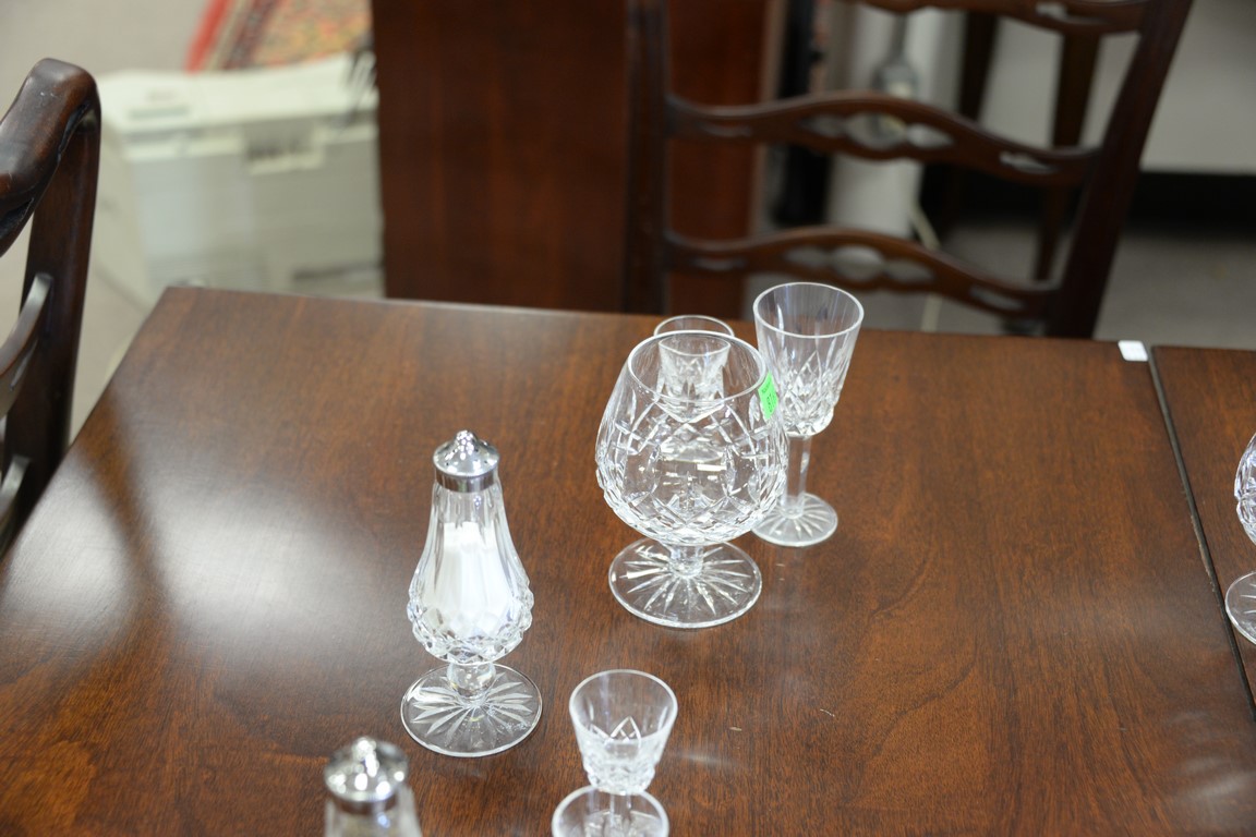 Eighteen Waterford crystal pieces including set of six stemmed cordials, set of four stemmed brandy glasses, set of four large water or cognac stames, pair of stemmed champagnes, and a salt and pepper shaker. ht. 3 1/2in, 5in., 5 1/2in, & 7 1/4in.