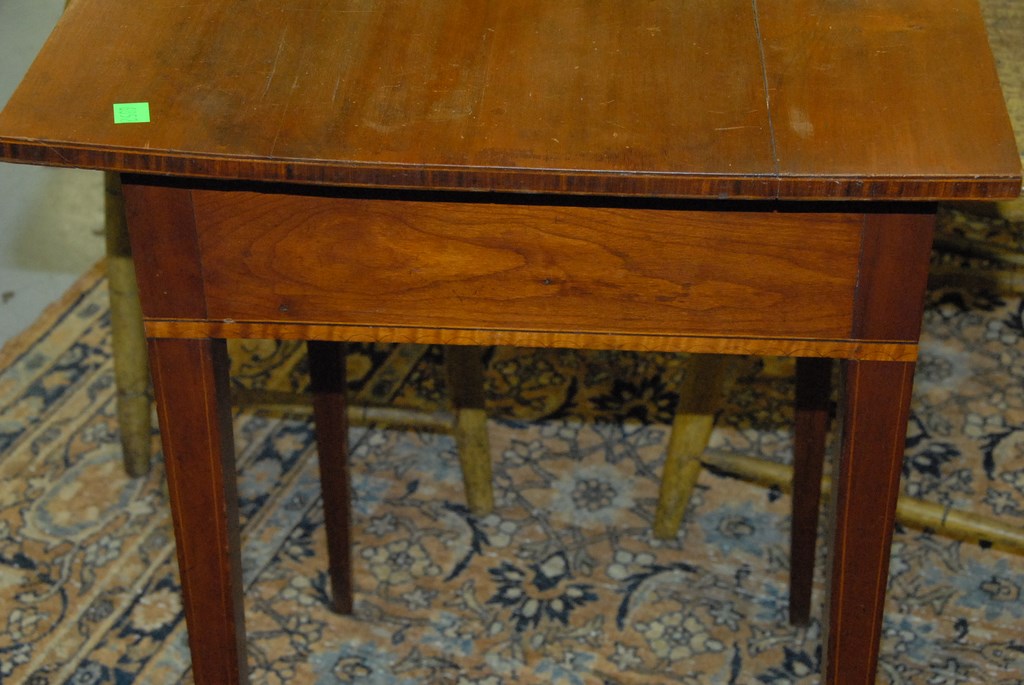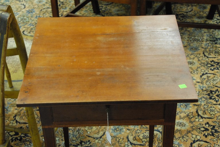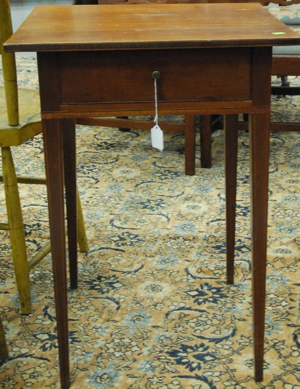 Lot 32: Federal cherry stand with drawer and band and line lunette type inlay, circa 1790-1810. top: 8 x 9