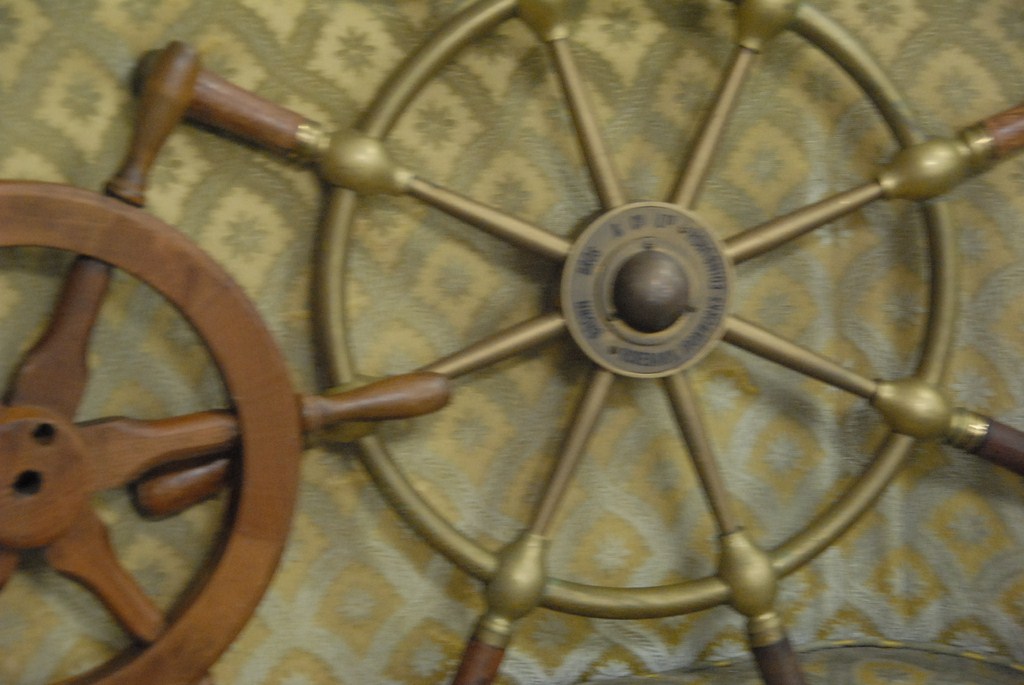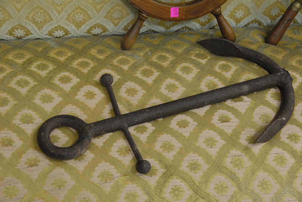 Lot 32: Four piece nautical lot two brass ship’s wheels with wood trim, wooden boat wheel, and iron small anchor.