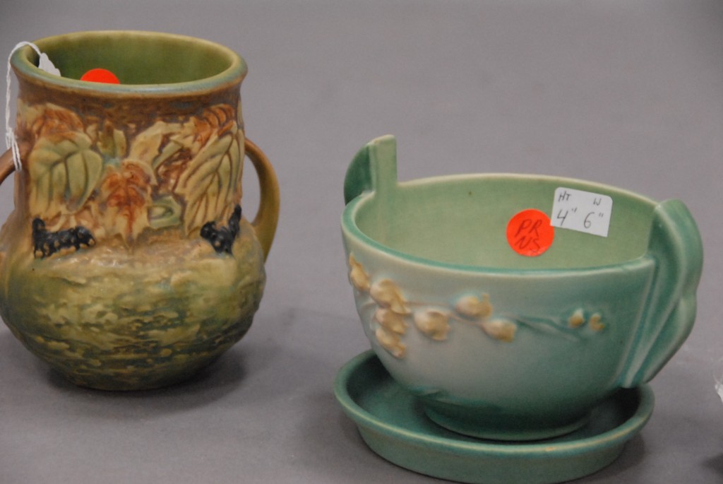 Four pieces of Roseville pottery including a flowerpot with underplate.