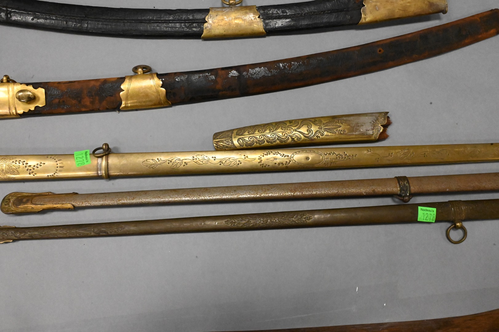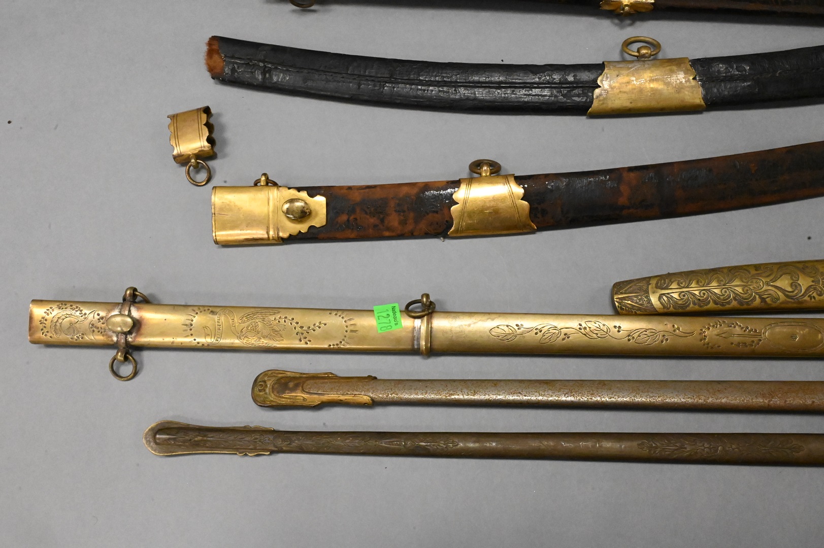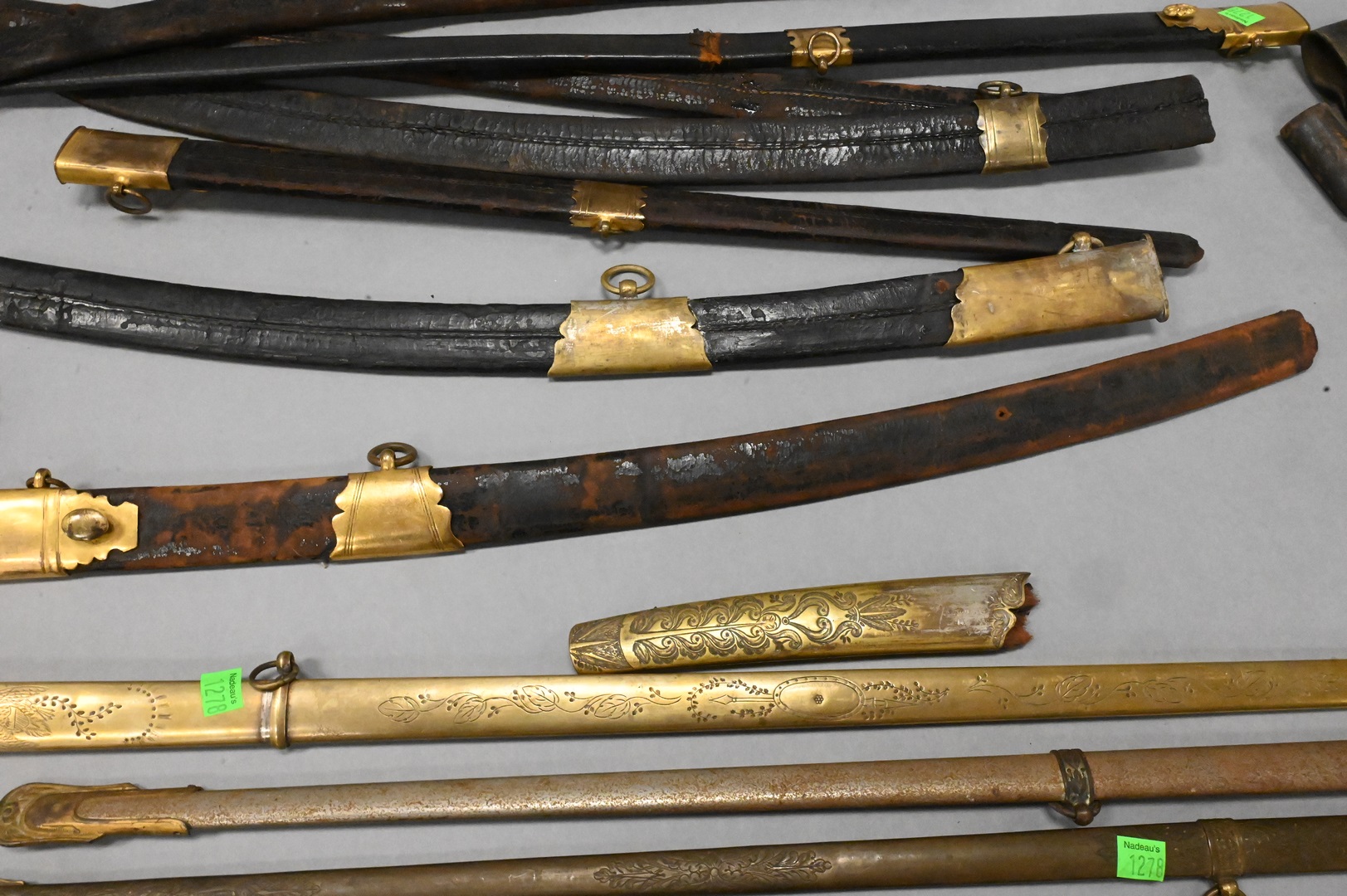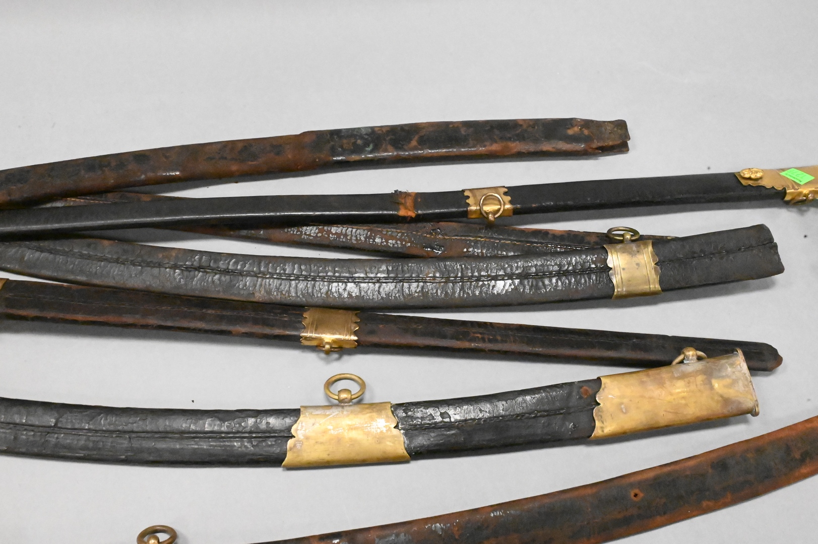 Group of 11 Leather and Brass Bayonet and Sword Scabbards, pluribus brass scabbard, 7 leather and brass, 2 metal sword scabbards, along with a bayonet scabbard; longest 32 1/2 inches. Provenance: Estate of Peter Tillou, Litchfield, Connecticut.