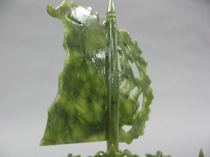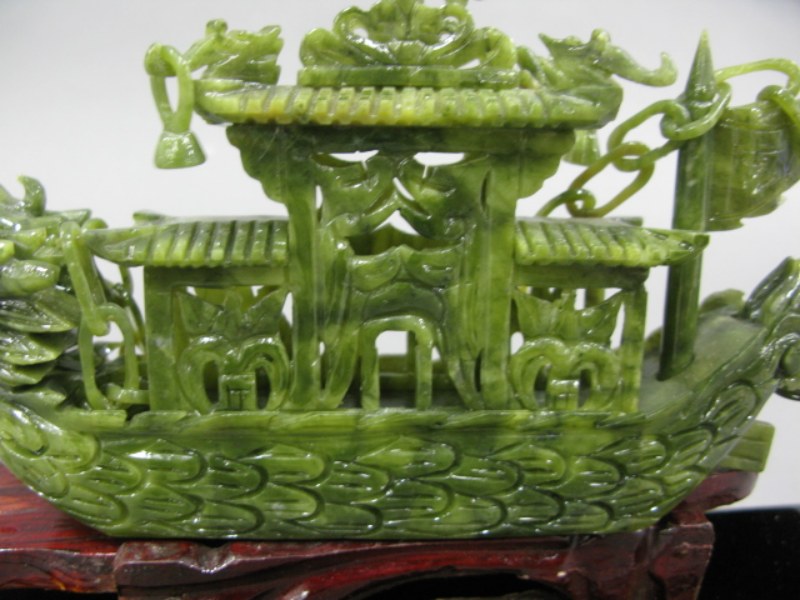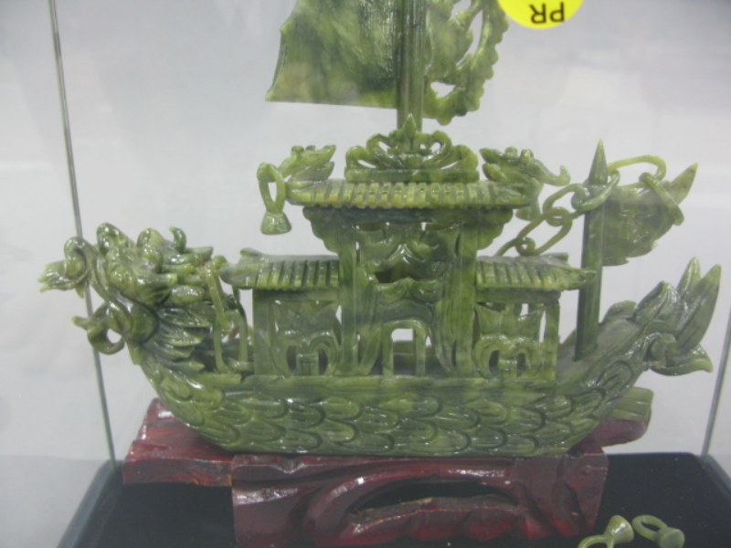 Hardstone carved Chinese Junk boat in glass case.