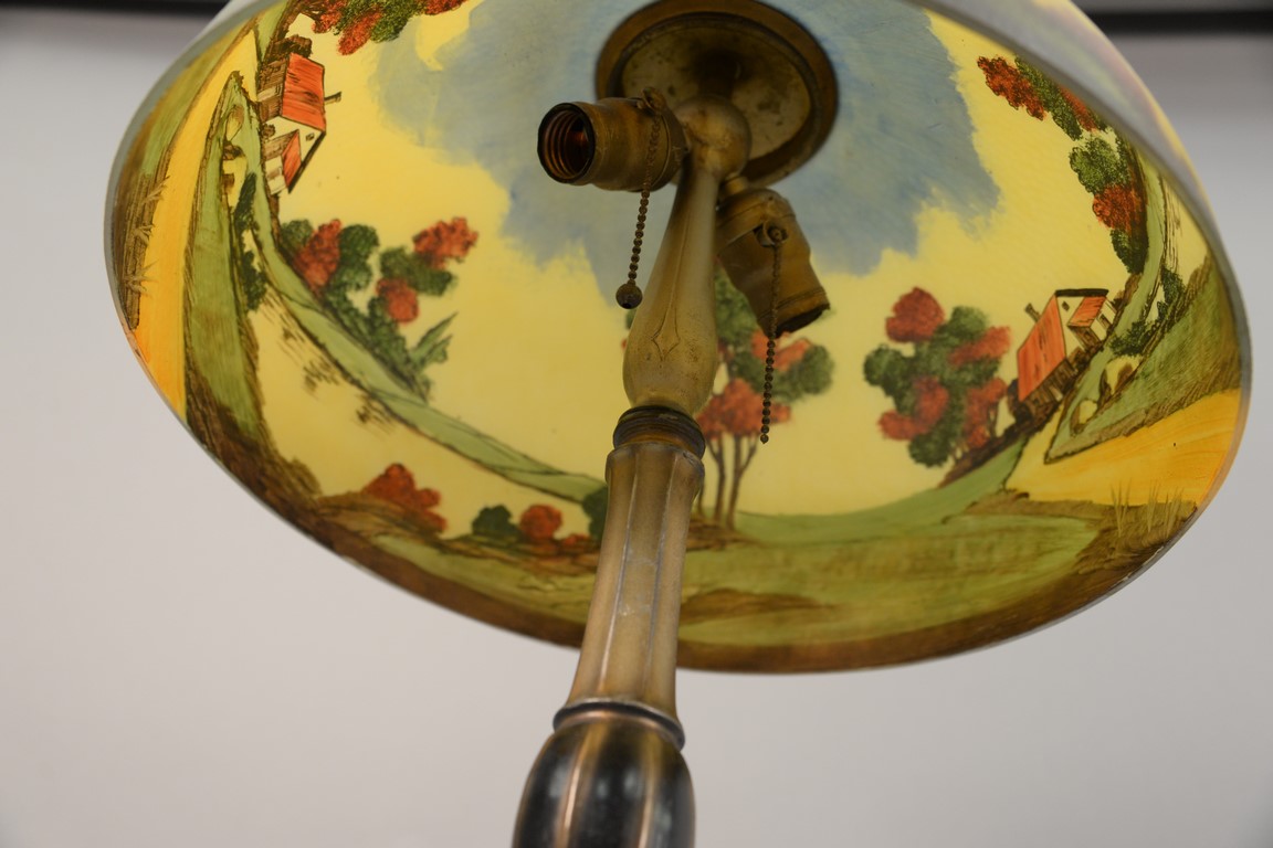 Lot 32: Jefferson table lamp with reverse hand painted glass shade, signed. ht. 22in.
