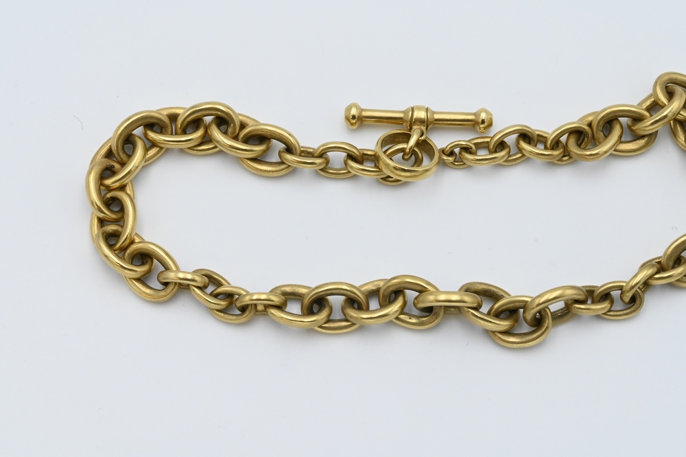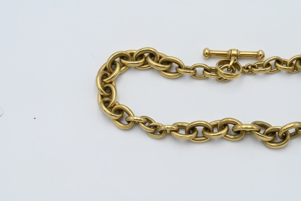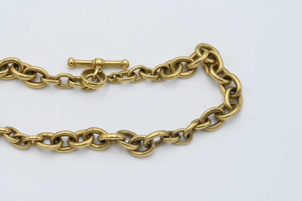 Lot 32: Kieselstein-Cord 18 Karat Gold Large Link Necklace, having t-bar and bar closure, length 18 inches, 200 grams.