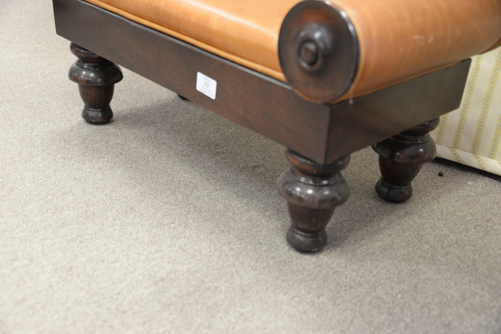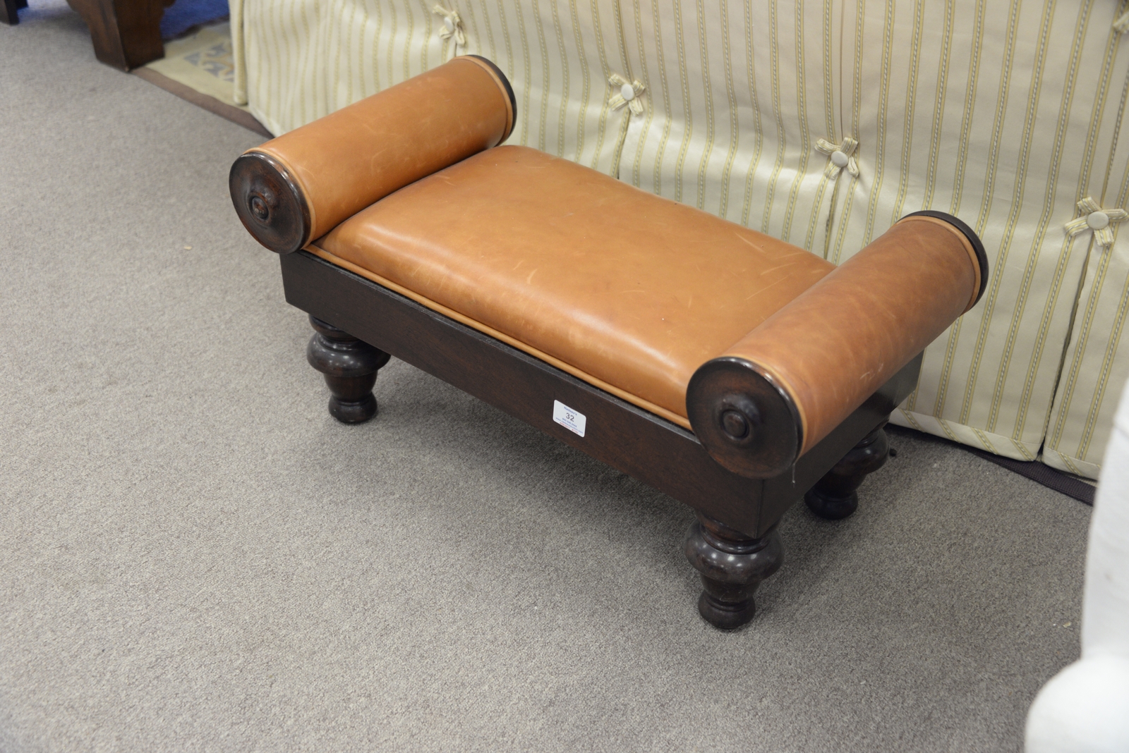 Leather upholstered diminutive bench. ht. 13 1/2 in., wd. 24in., dp. 13 1/2 in.