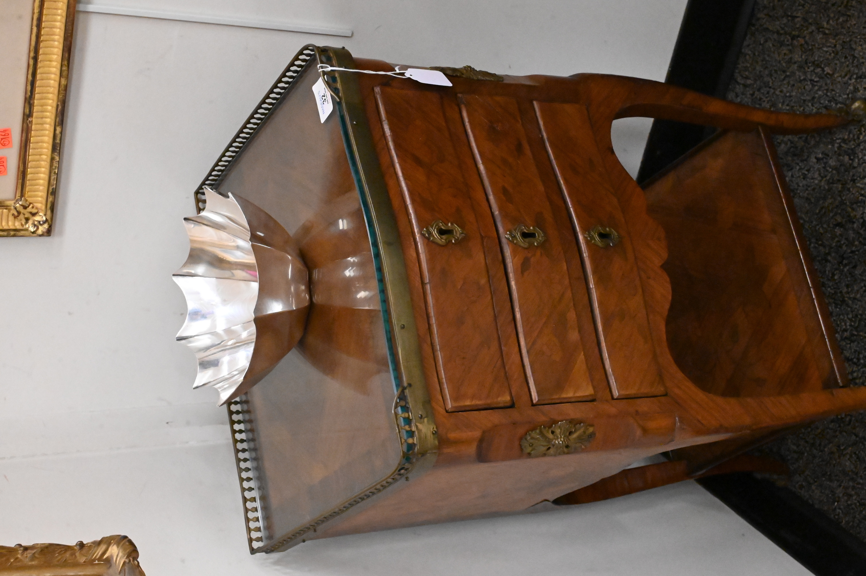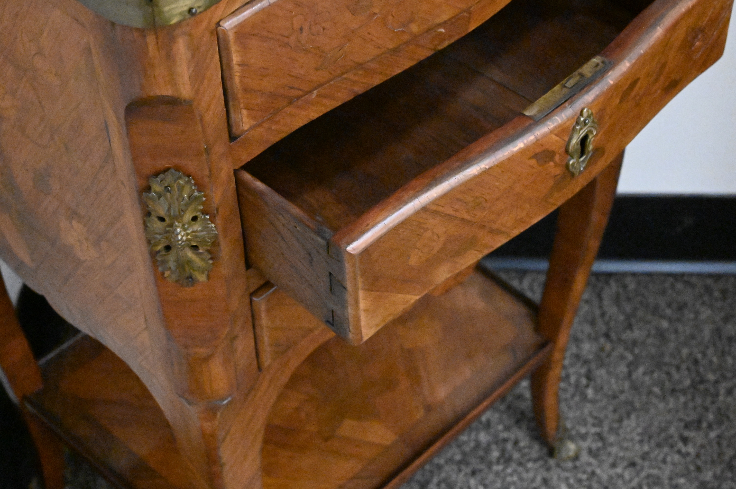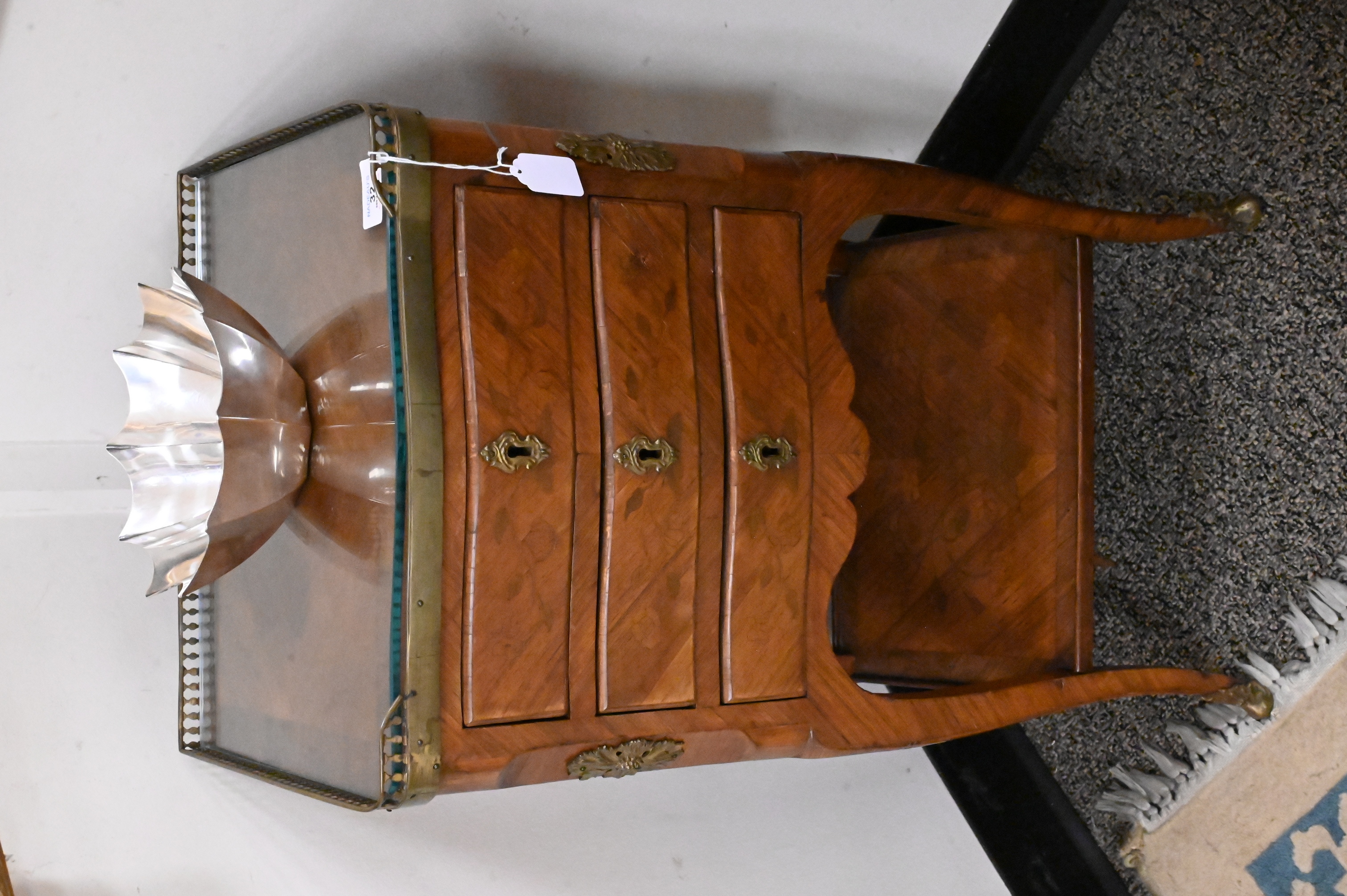 with parquetry top mounted with a fitted glass top and pierced brass gallery, above three drawers with floral inlay and ormolu mounts, the sides and lower shelf also inlaid with floral motifs, raised on cabriole legs ending in gilt-bronze sabots, 19th century