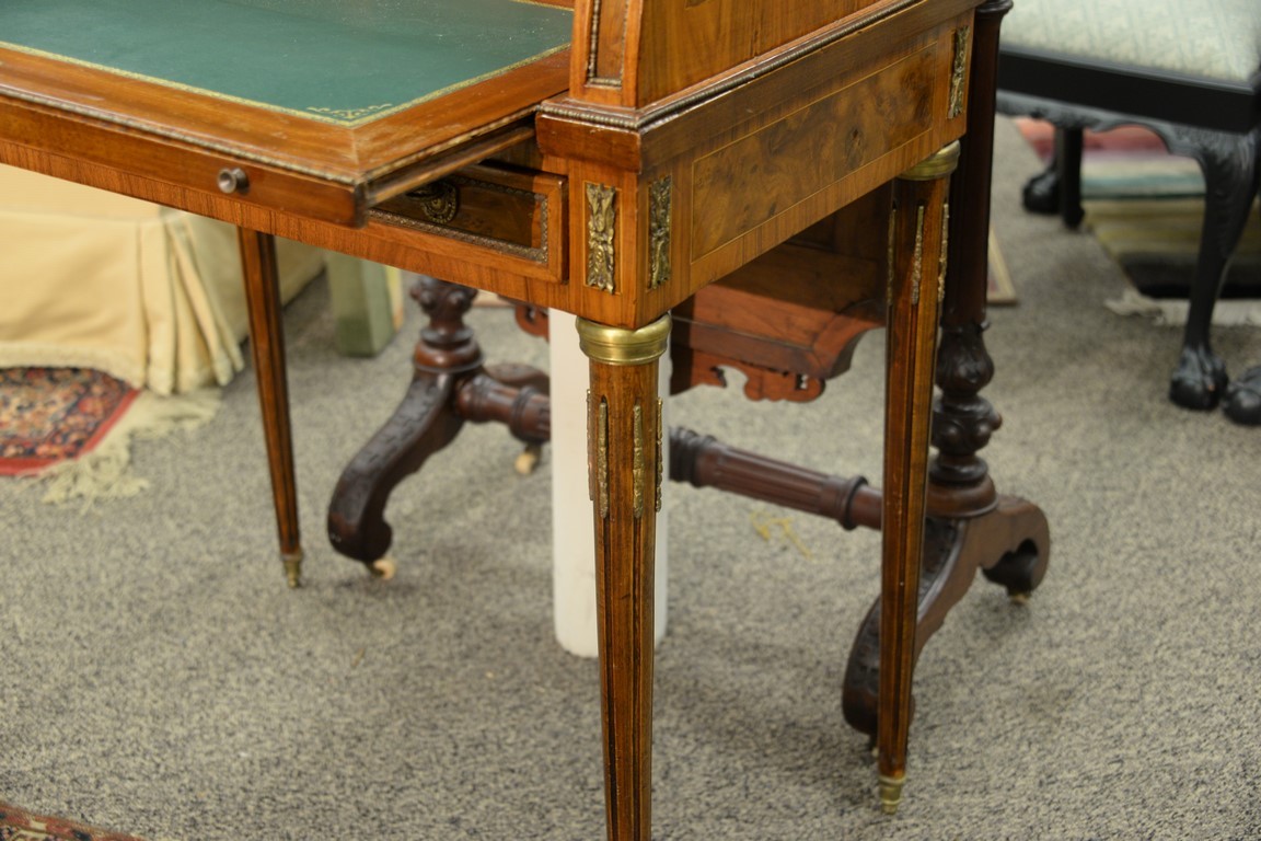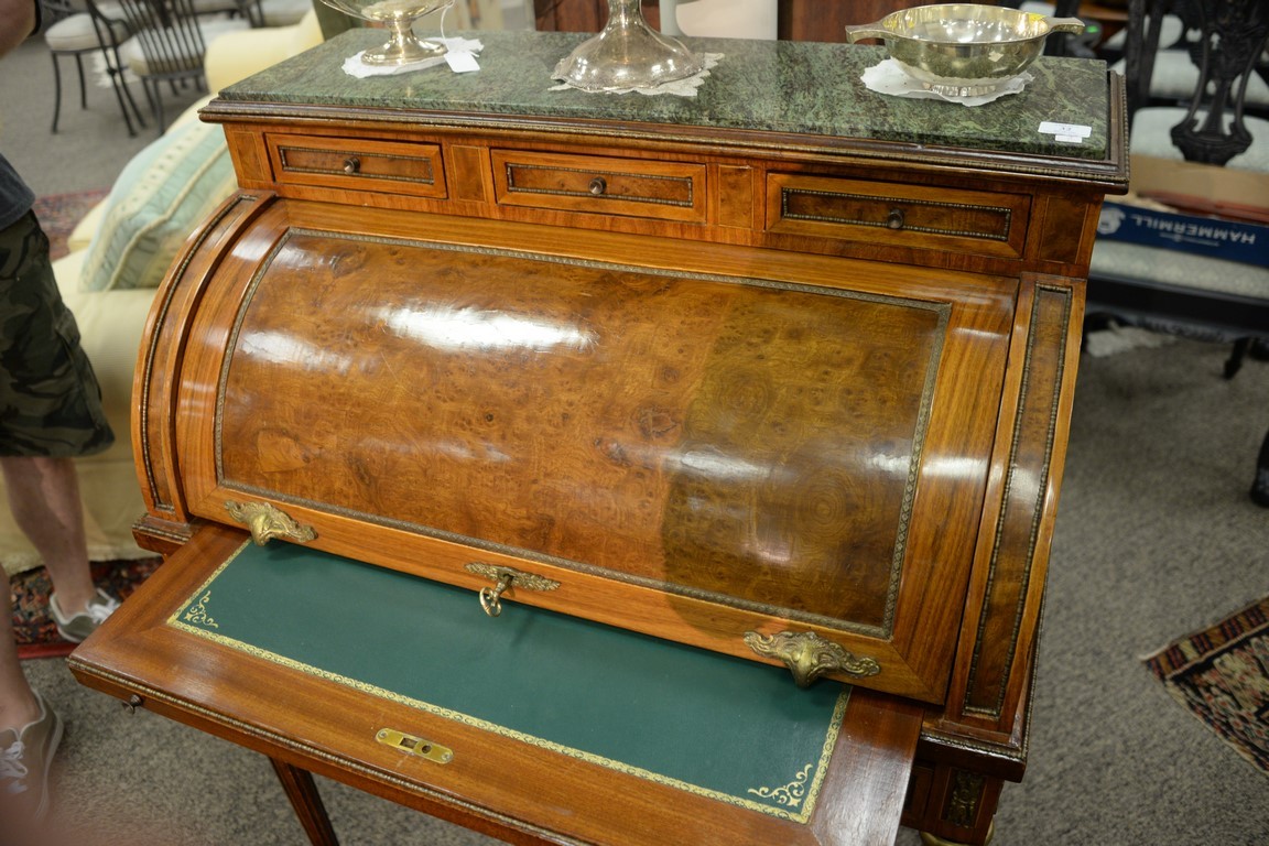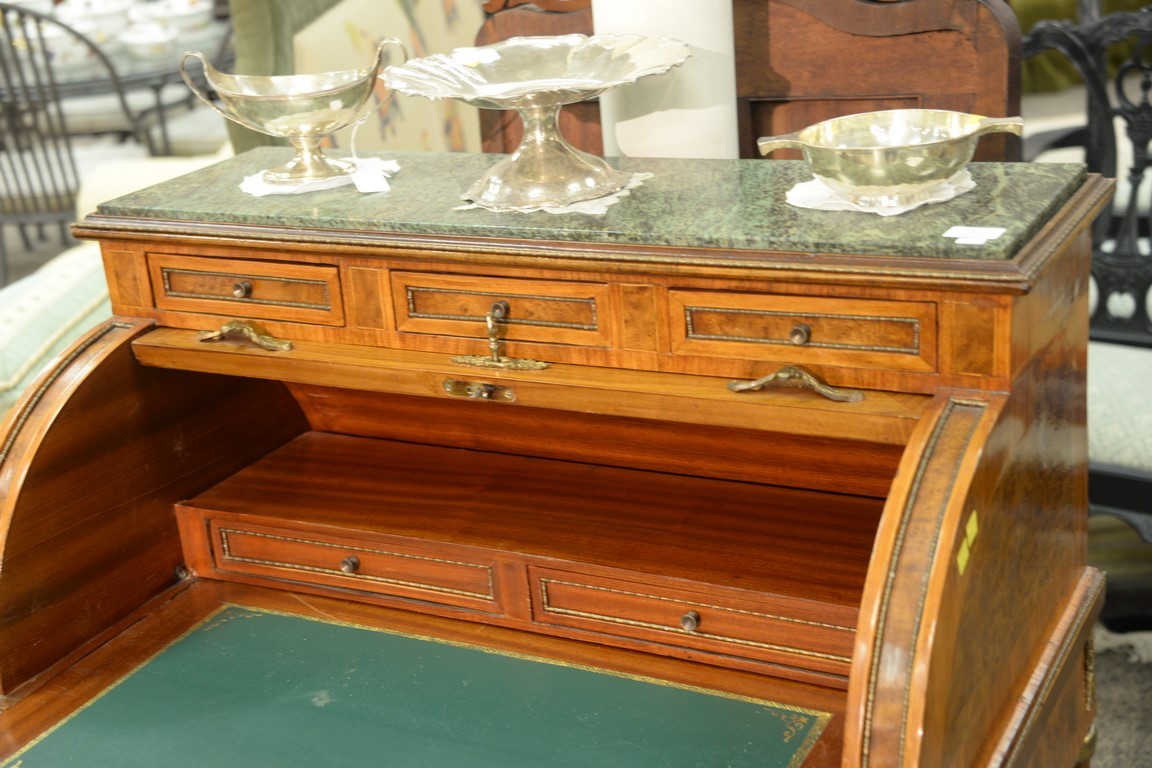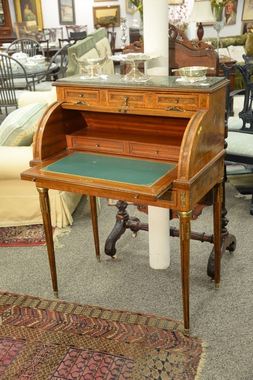 Louis XVI style roll top desk with marble top. ht. 48in., wd. 34in., dp. 21in.