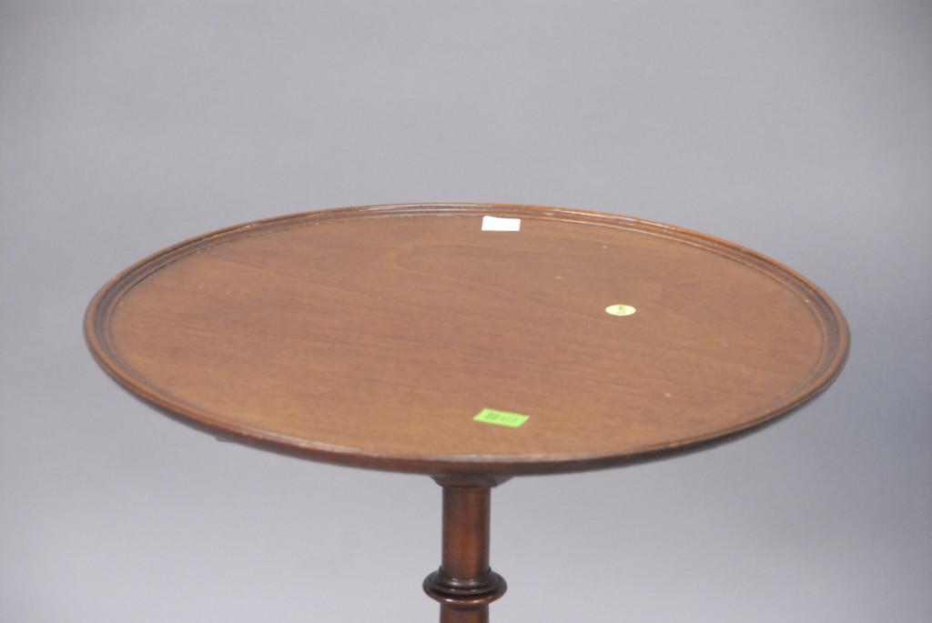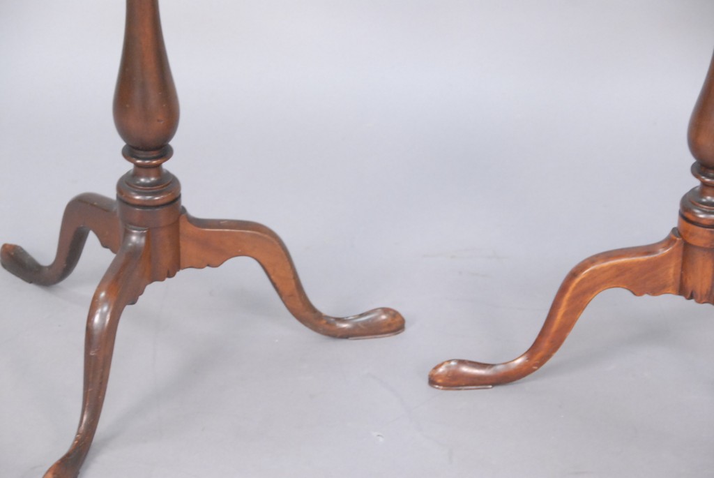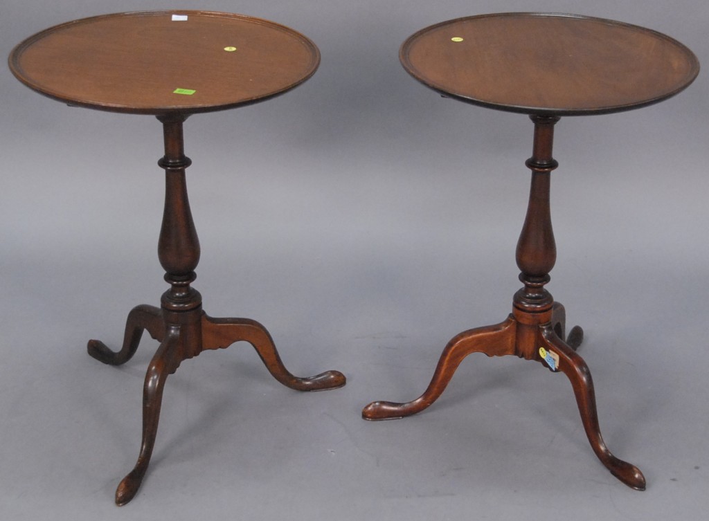 Pair of custom mahogany round tip tables, one foot repaired, dia. 19in.