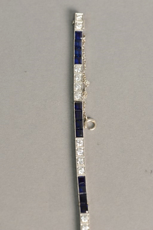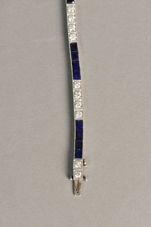 Platinum diamond and sapphire in line bracelet having twenty round cut diamonds and twenty emerald cut sapphires safety chain as is. lg. 7 in. 19.7 grams total with stones