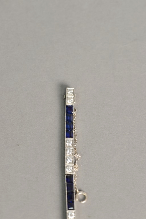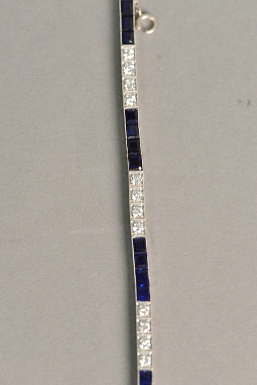 Lot 32: Platinum diamond and sapphire in line bracelet having twenty round cut diamonds and twenty emerald cut sapphires safety chain as is…