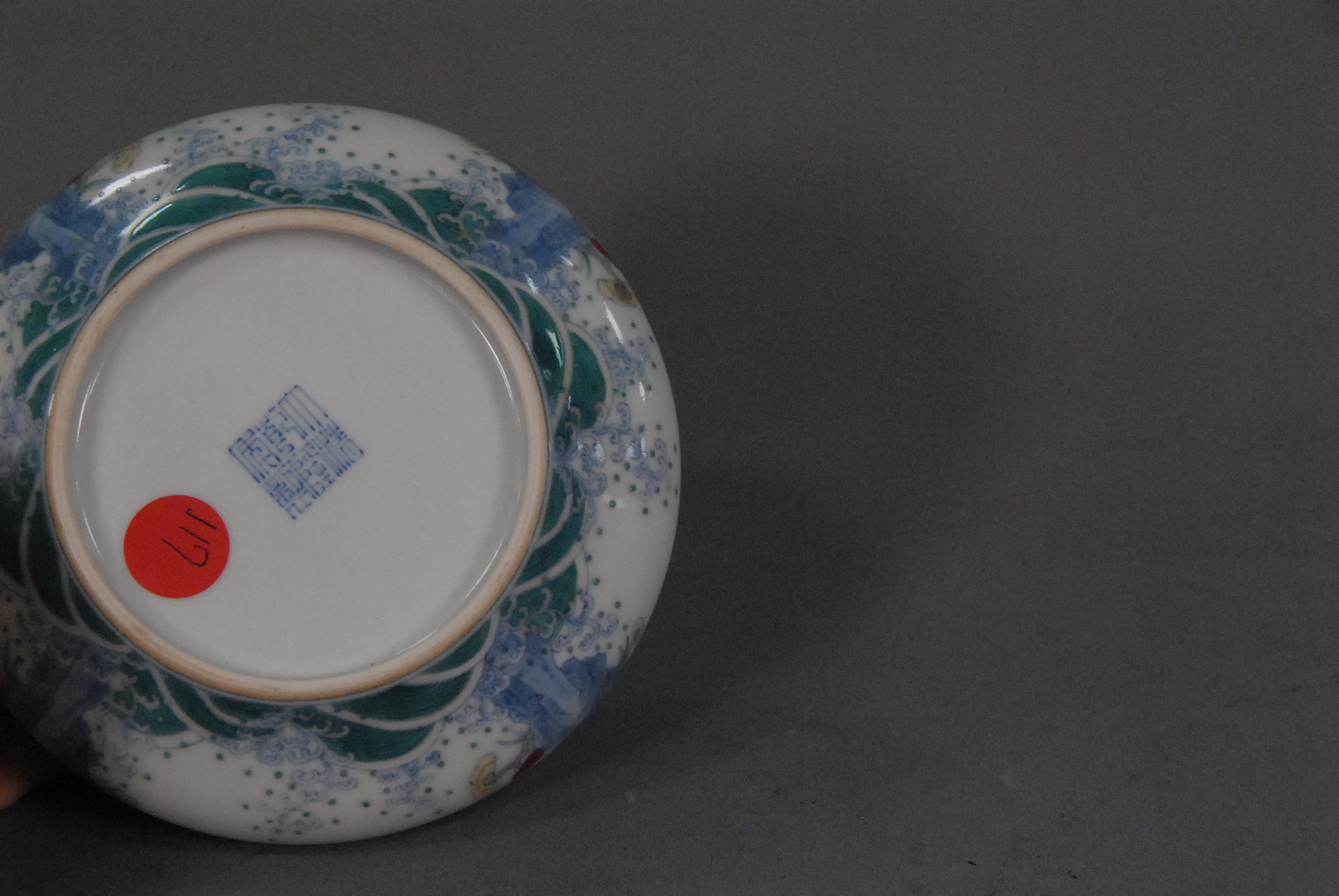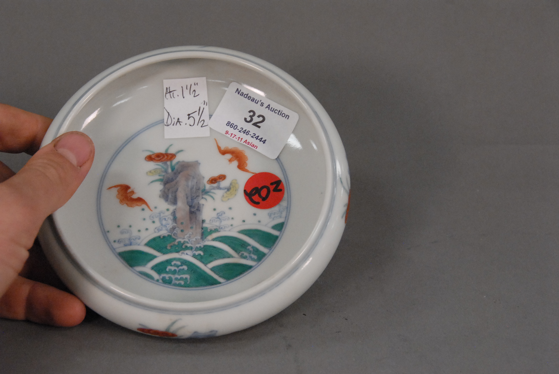 Porcelain bat brush washer with two flying bats on interior, seal mark on bottom.