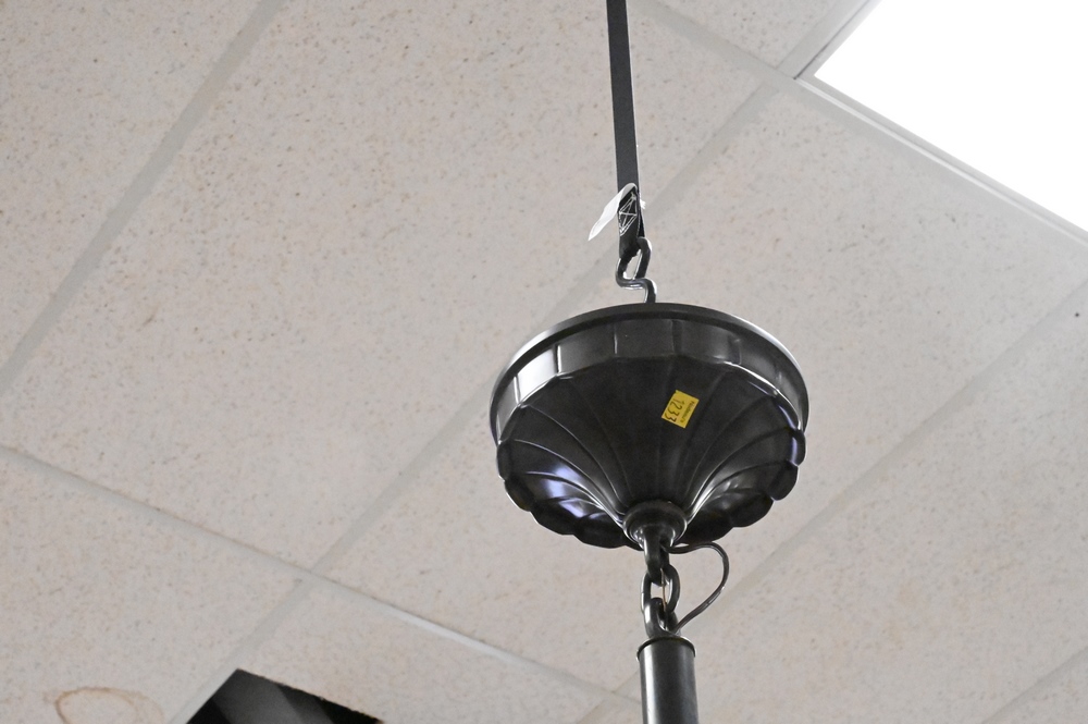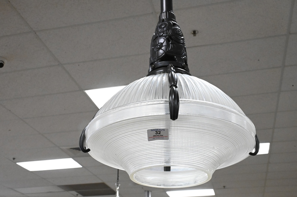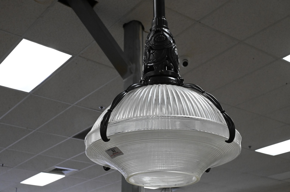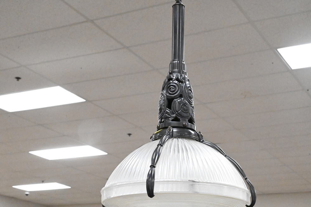 Lot 32: Ruhlmann-Brandt Pendant Hanging Light, having glass shade, height 32 inches, receipt for $2,675, shade sold by Urbanarchaeology for $3,000 retail.