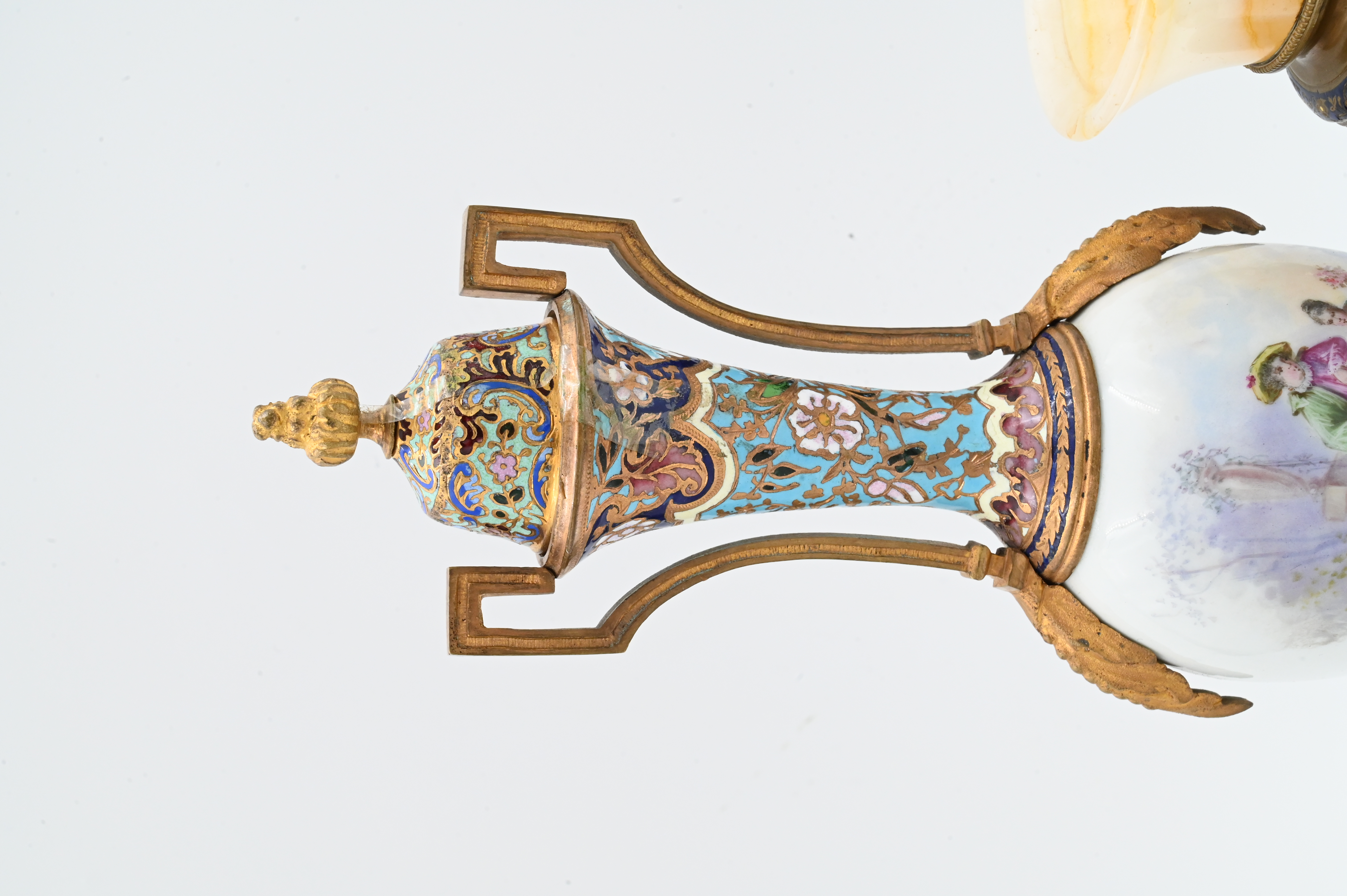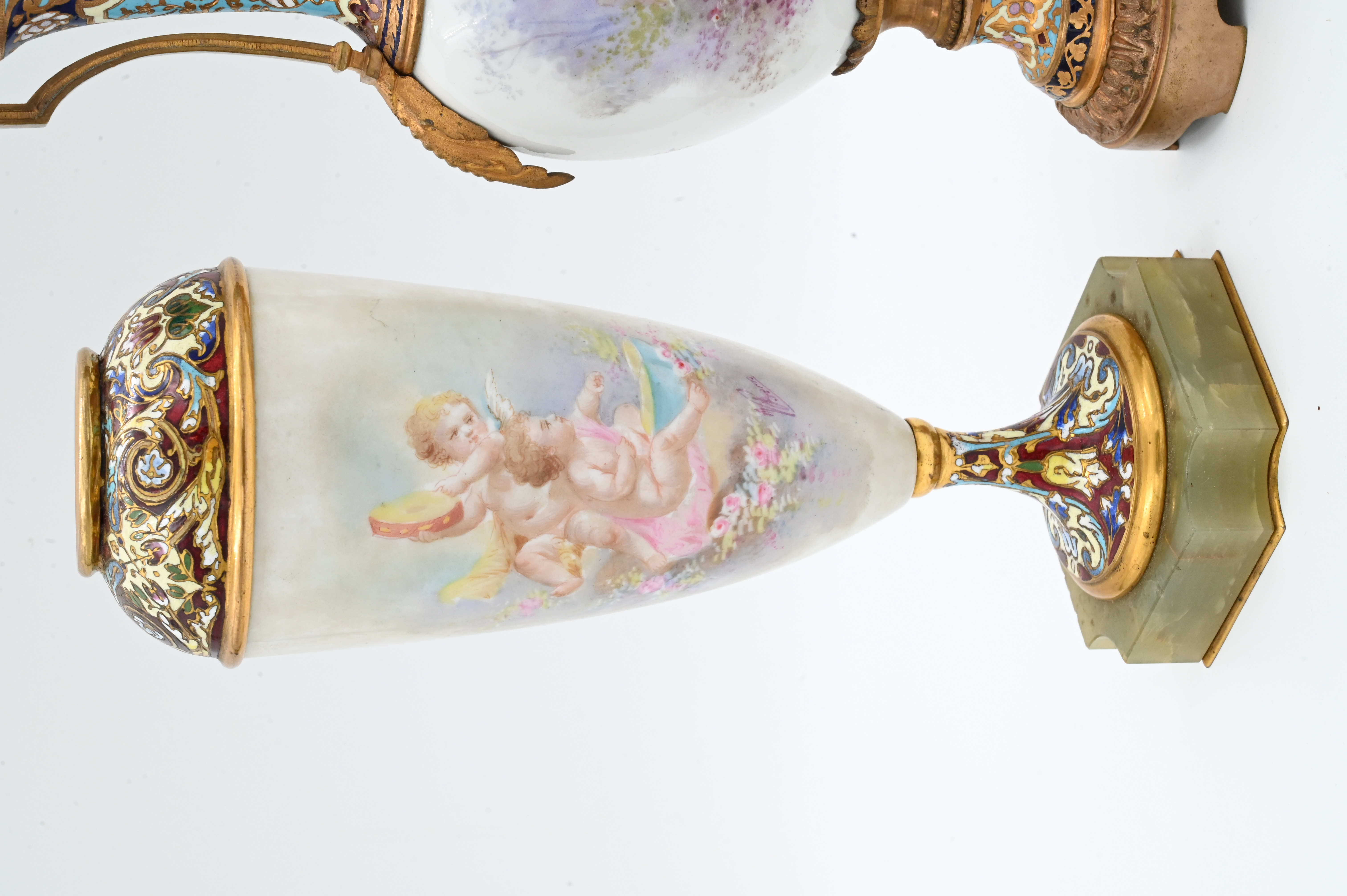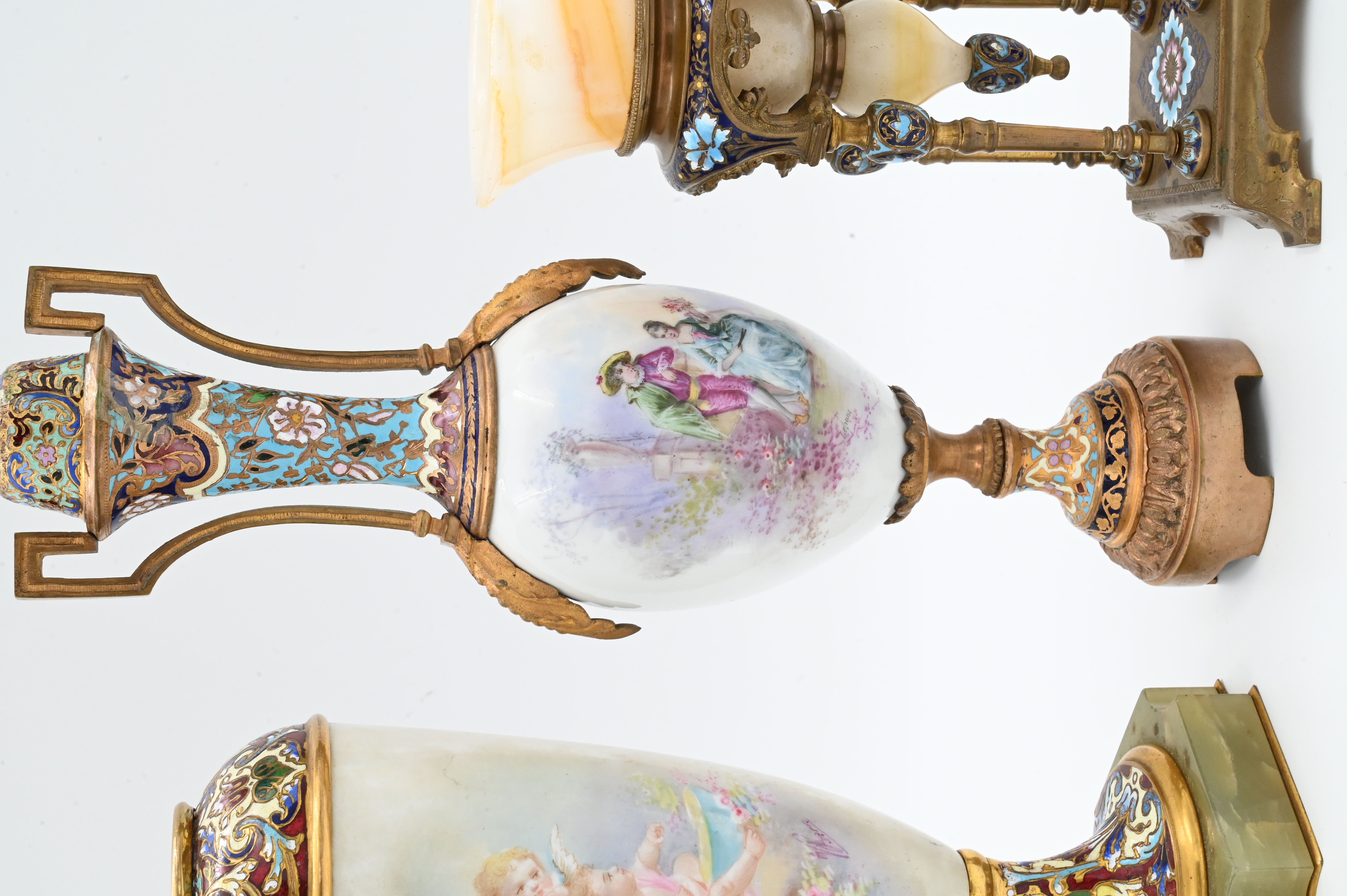 lidded urn having bronze mounts depicting a romantic scene surmounted by acorn finial and signed, urn mounted on onyx base having scene depicting putti/cherubs and signed, champleve enamel and onyx centerpiece having tapering onyx supported by four gilt legs and set on a platform base