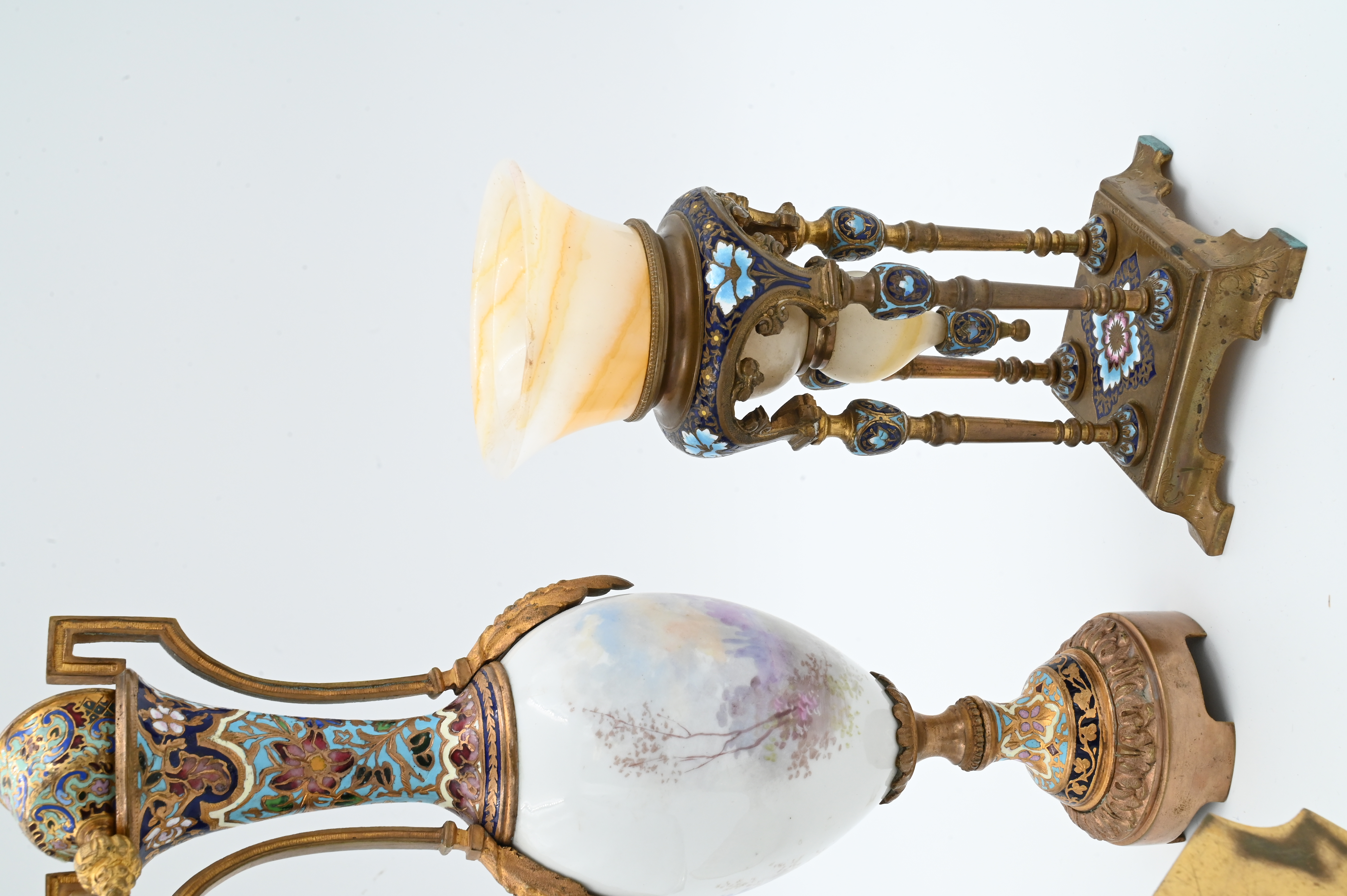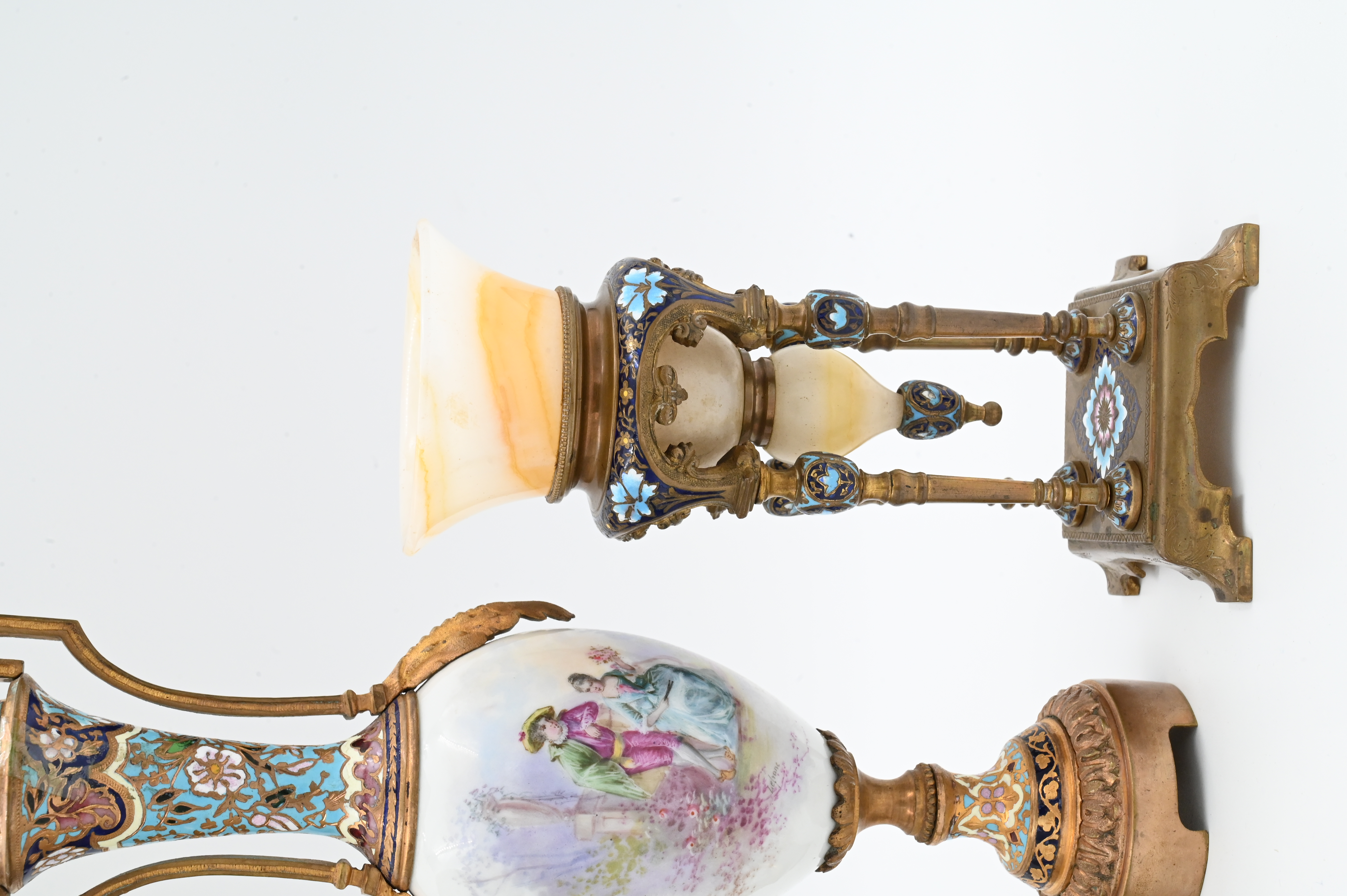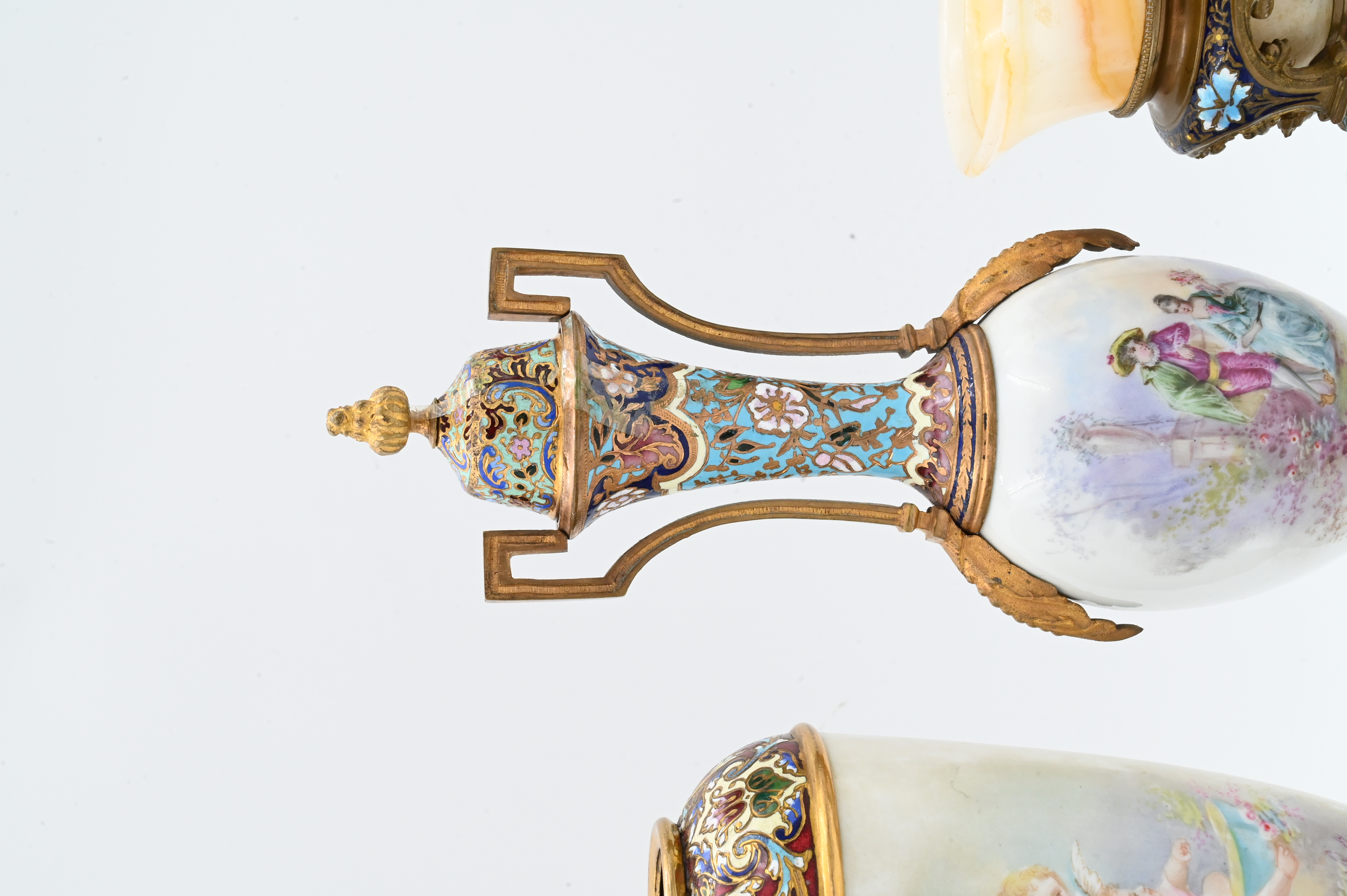 lidded urn having bronze mounts depicting a romantic scene surmounted by acorn finial and signed, urn mounted on onyx base having scene depicting putti/cherubs and signed, champleve enamel and onyx centerpiece having tapering onyx supported by four gilt legs and set on a platform base