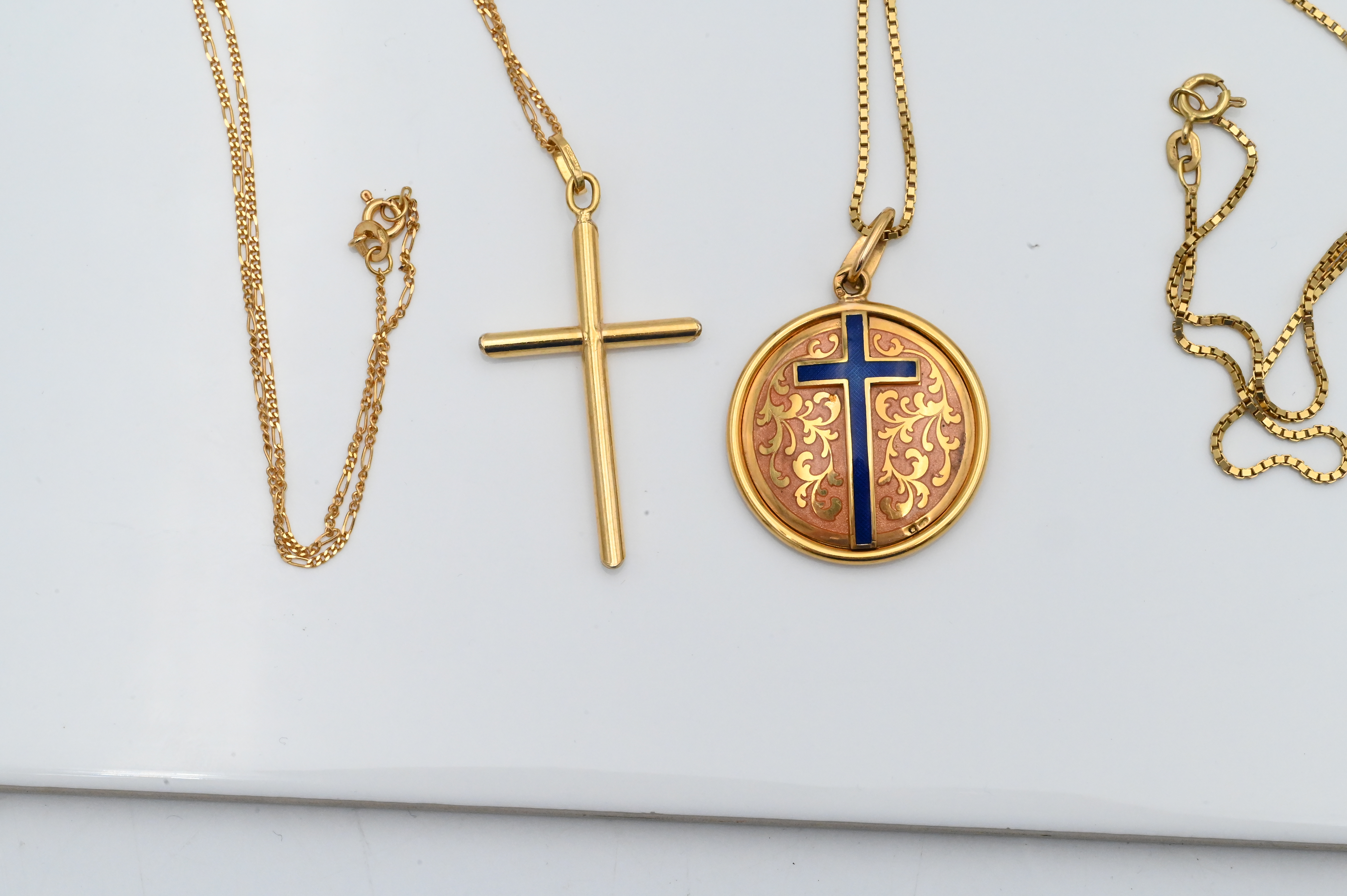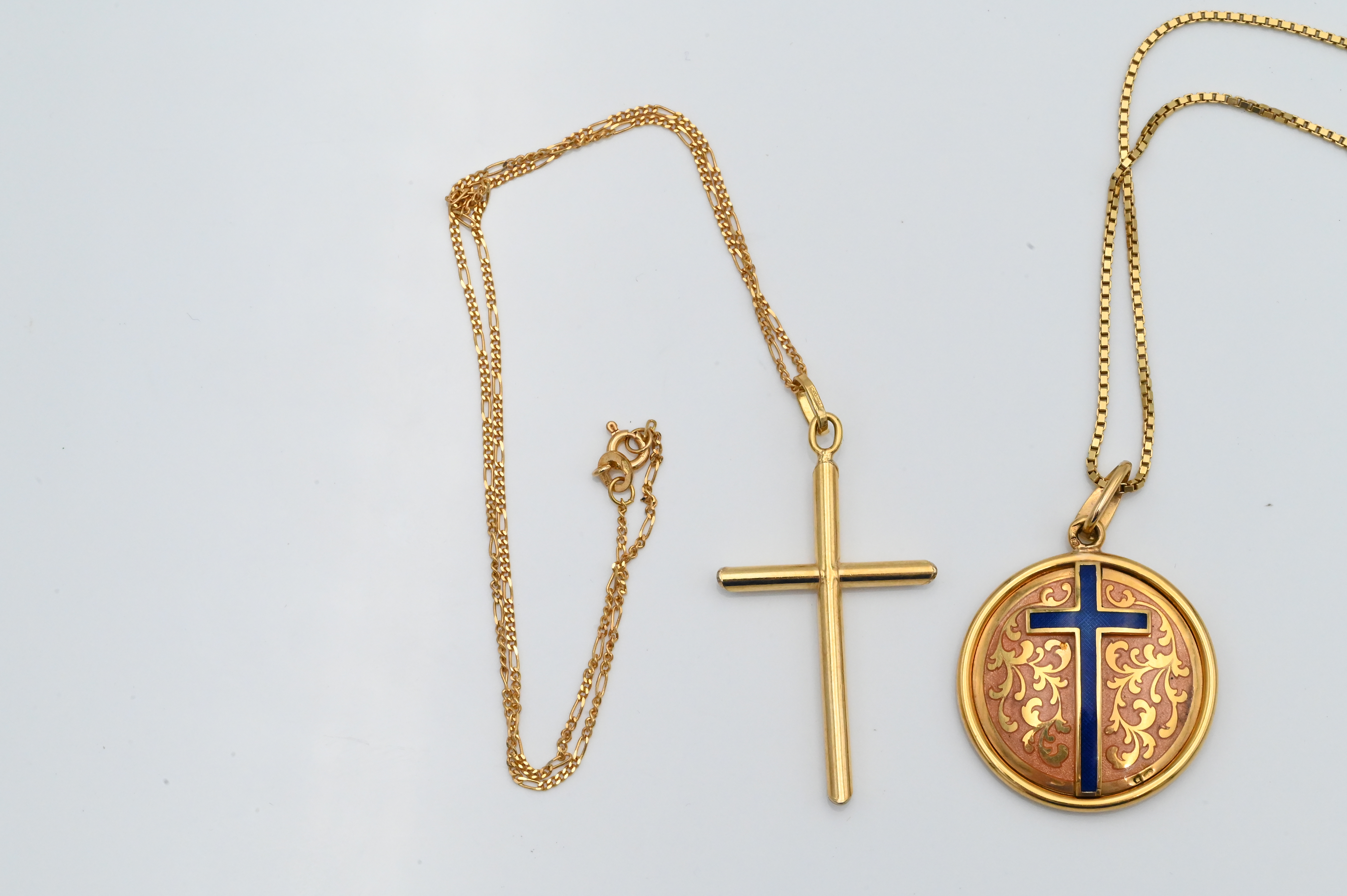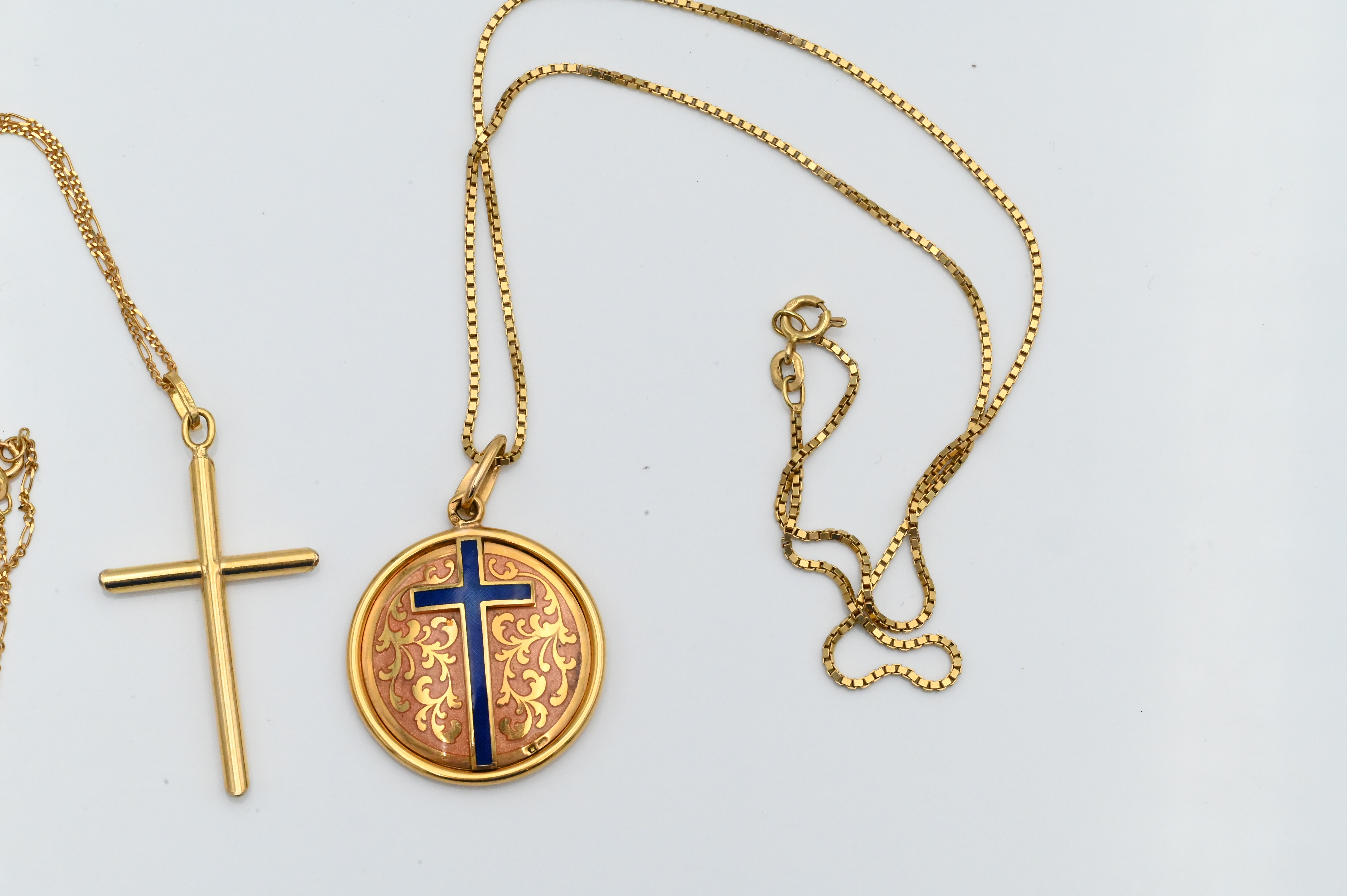 Two 18 Karat Gold Cross and Chains, one having blue enameling, total weight 22.1 grams.