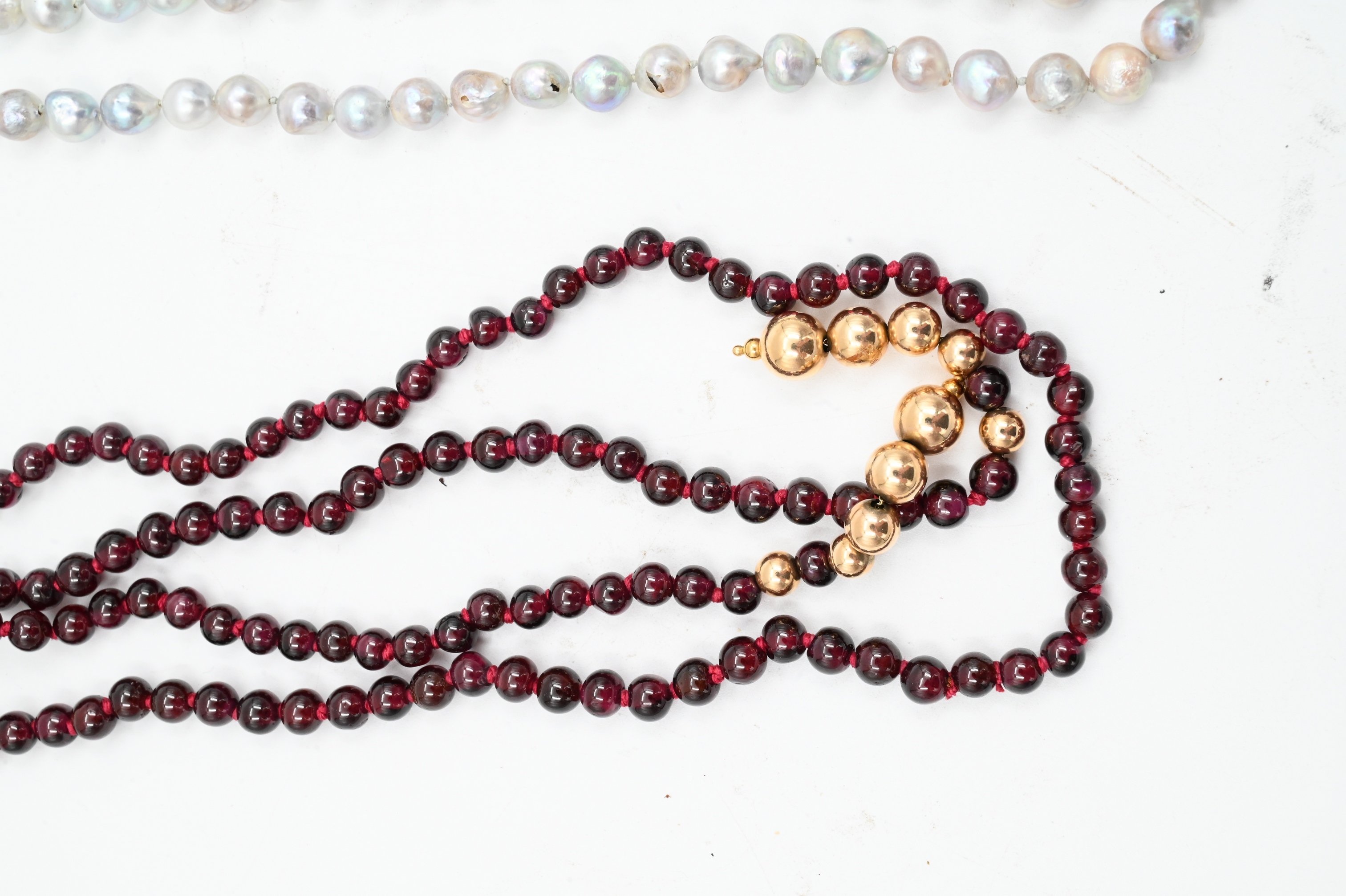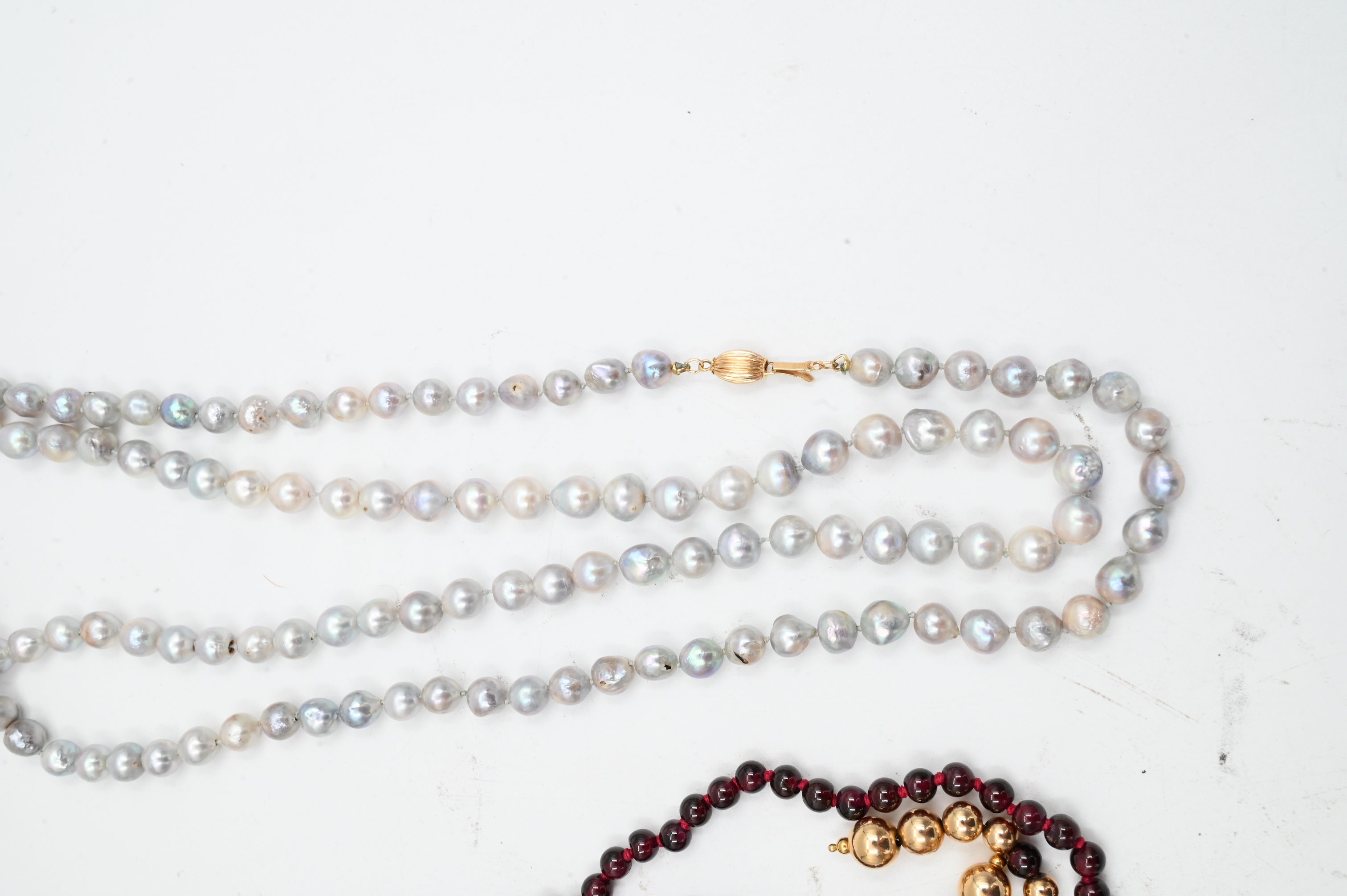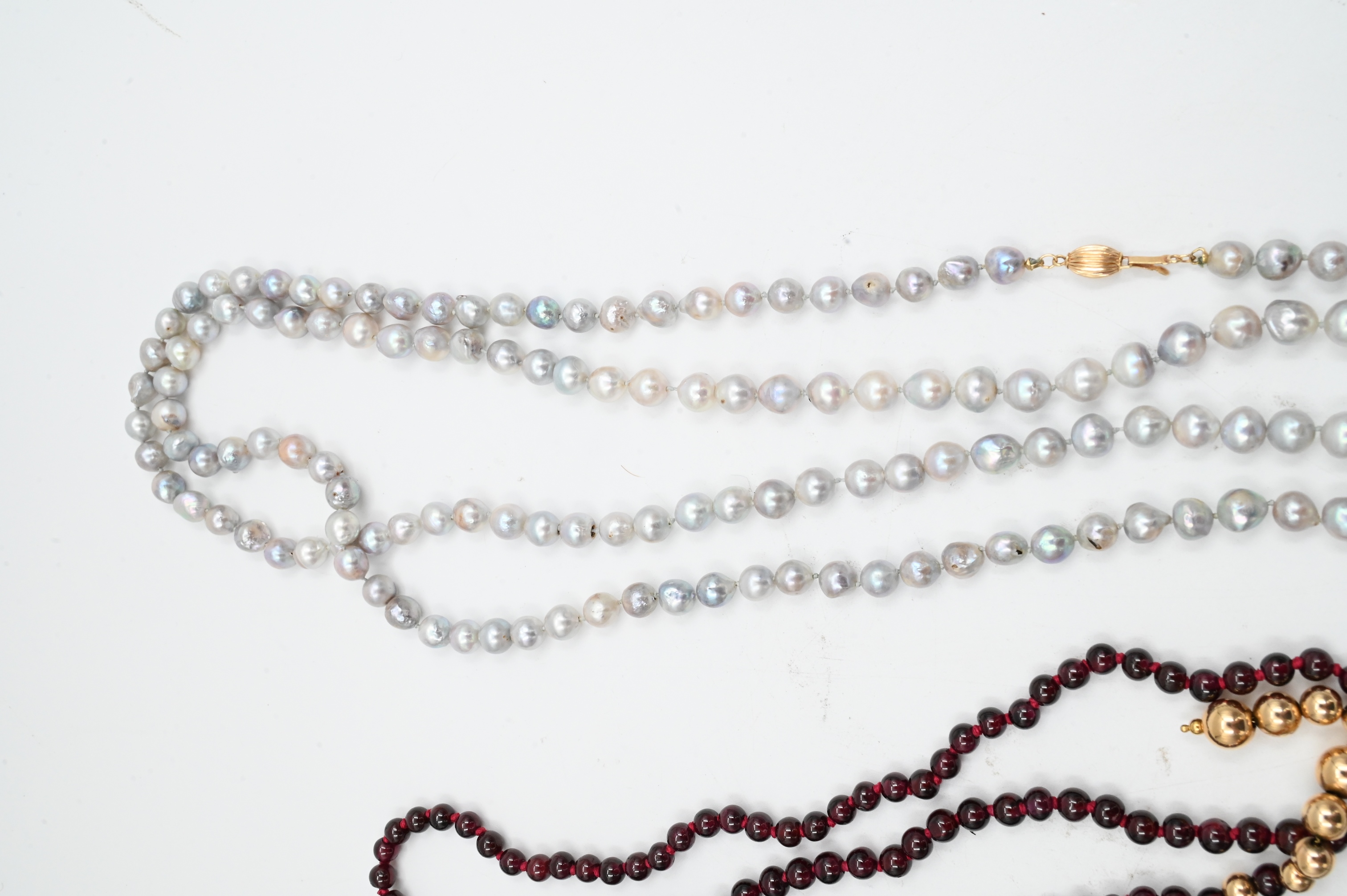 one amethyst and gold bead necklace no clasp length 40 inches Tahitian grey pearl single strand necklace several with hole in side