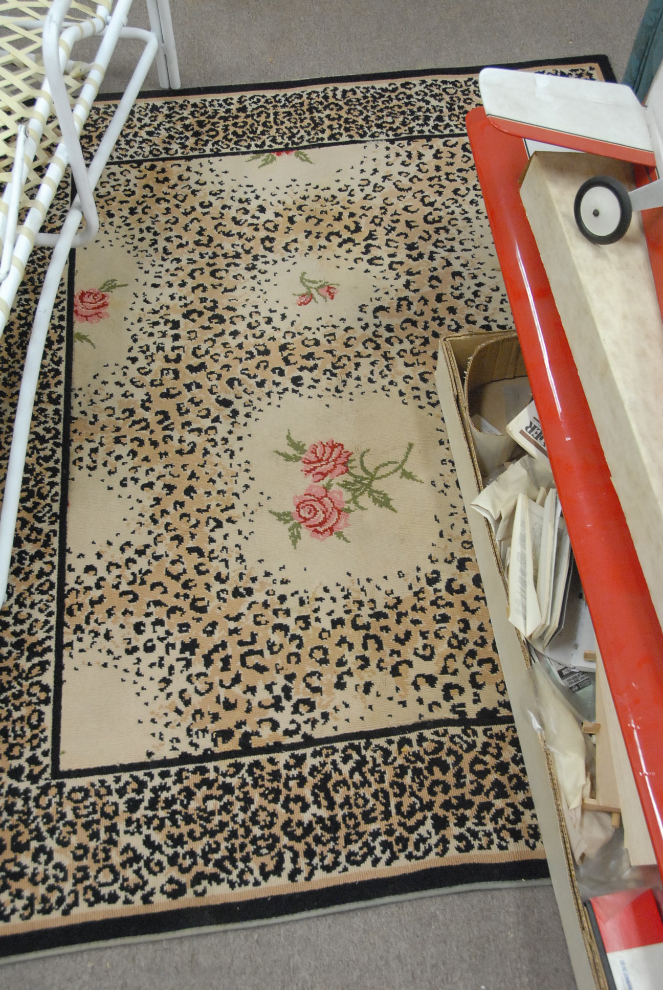 Two rugs one is black and white woven rug, and a leopard print scatter rug.