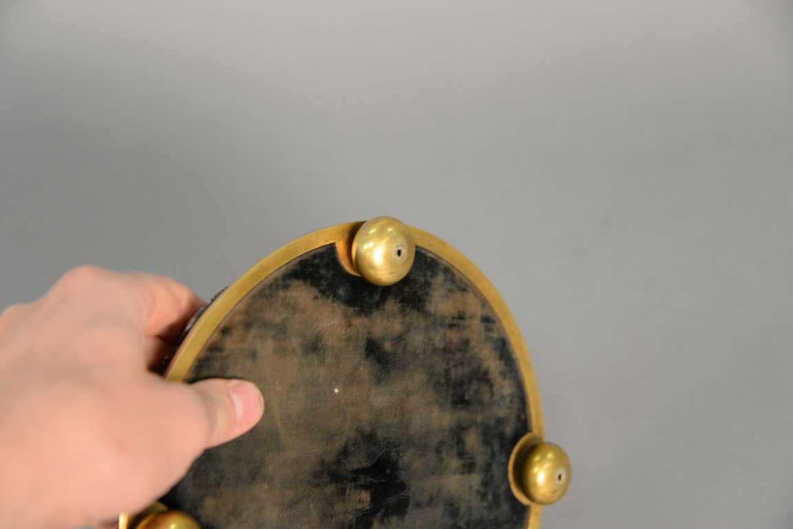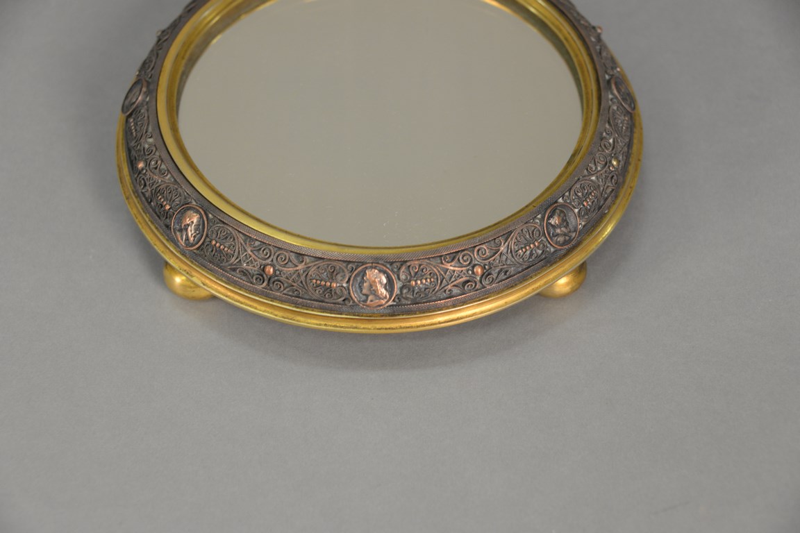 Lot 32: Victorian copper and bronze mirror plateau with scroll border and eight medallions. ht. 2 in. dia. 9 in.