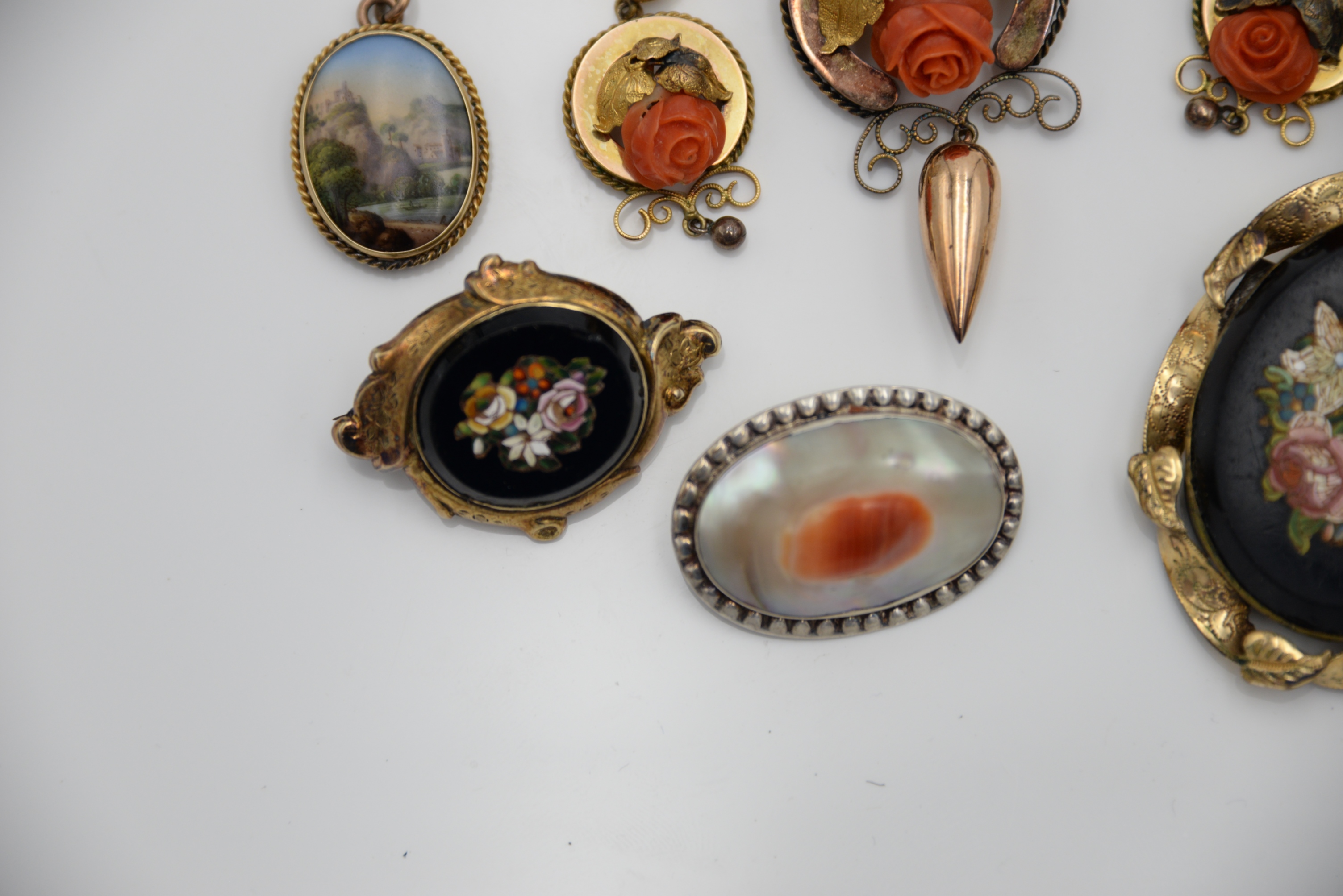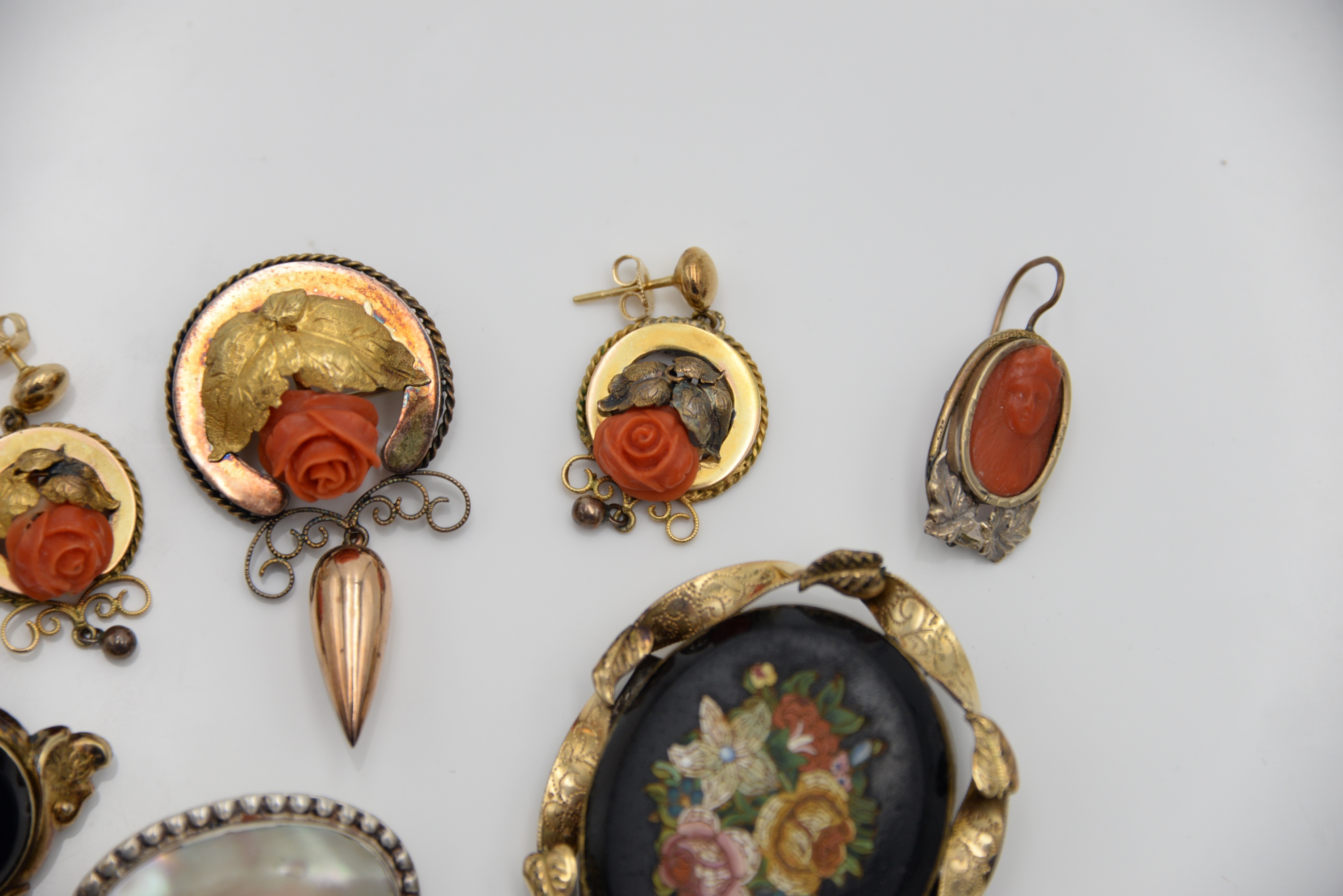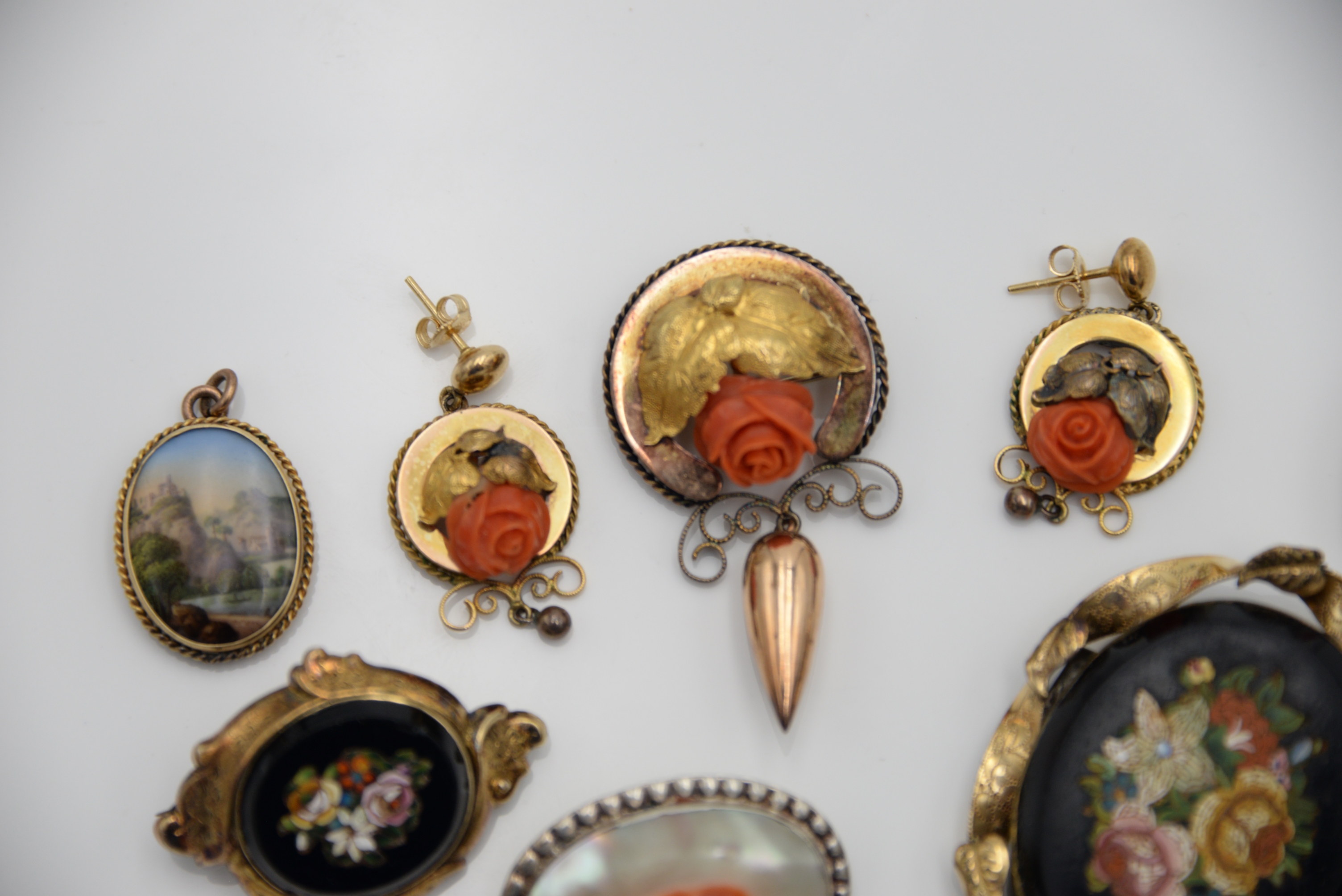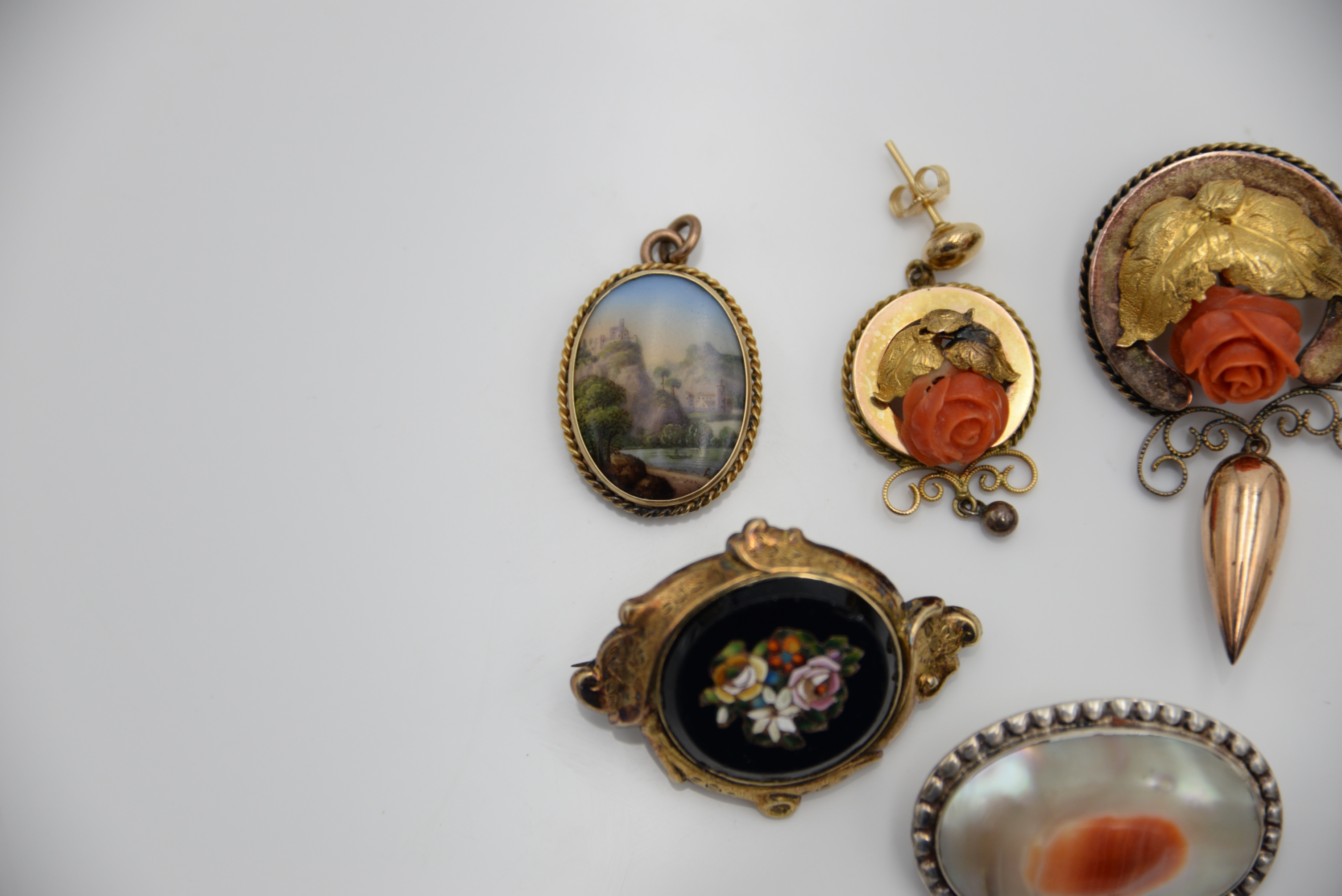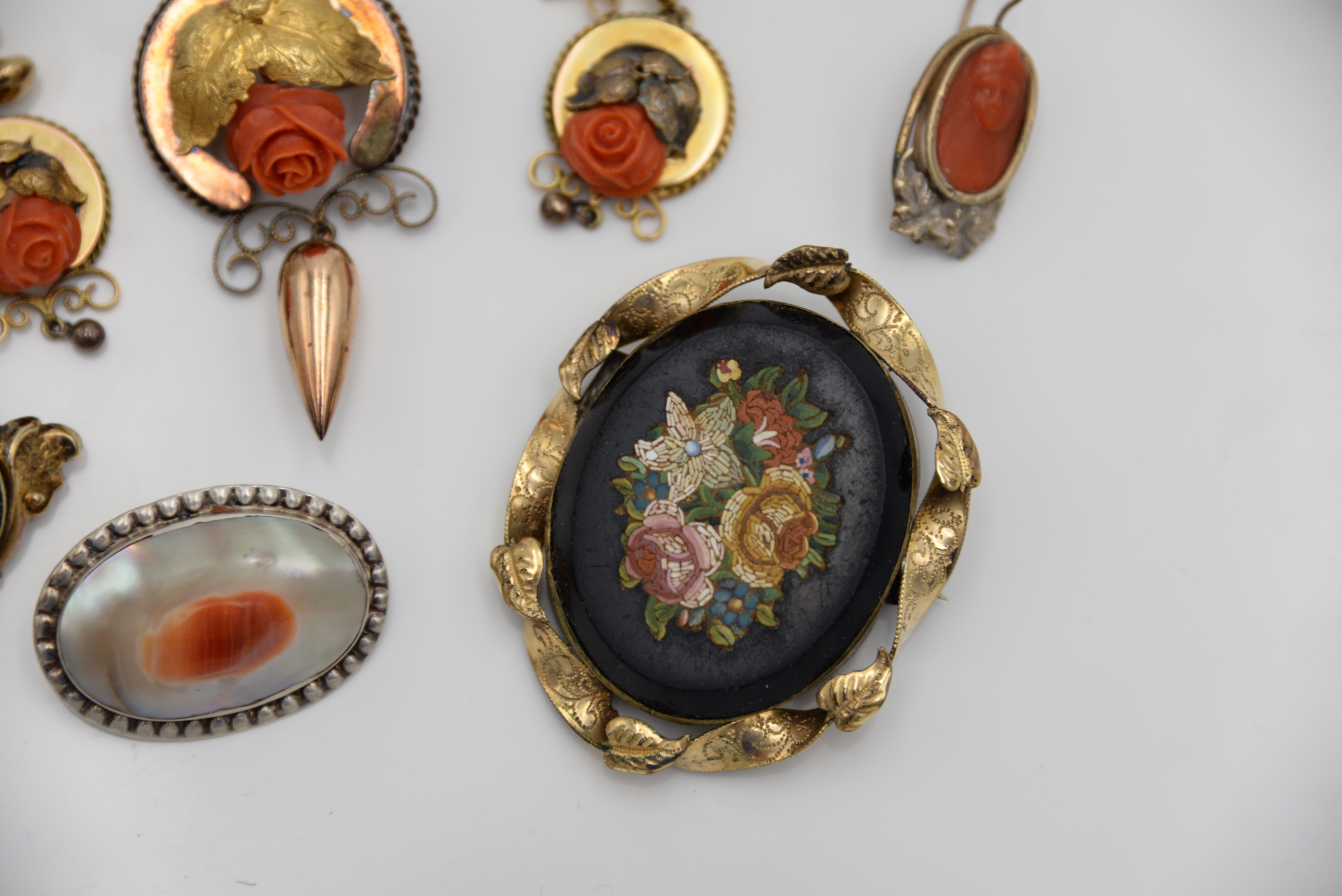 Victorian Jewelry Lot to include two micromosaic brooches three piece lot of Victorian gold and floral a single coral earring along with a silver mounted mother of pearl brooch.