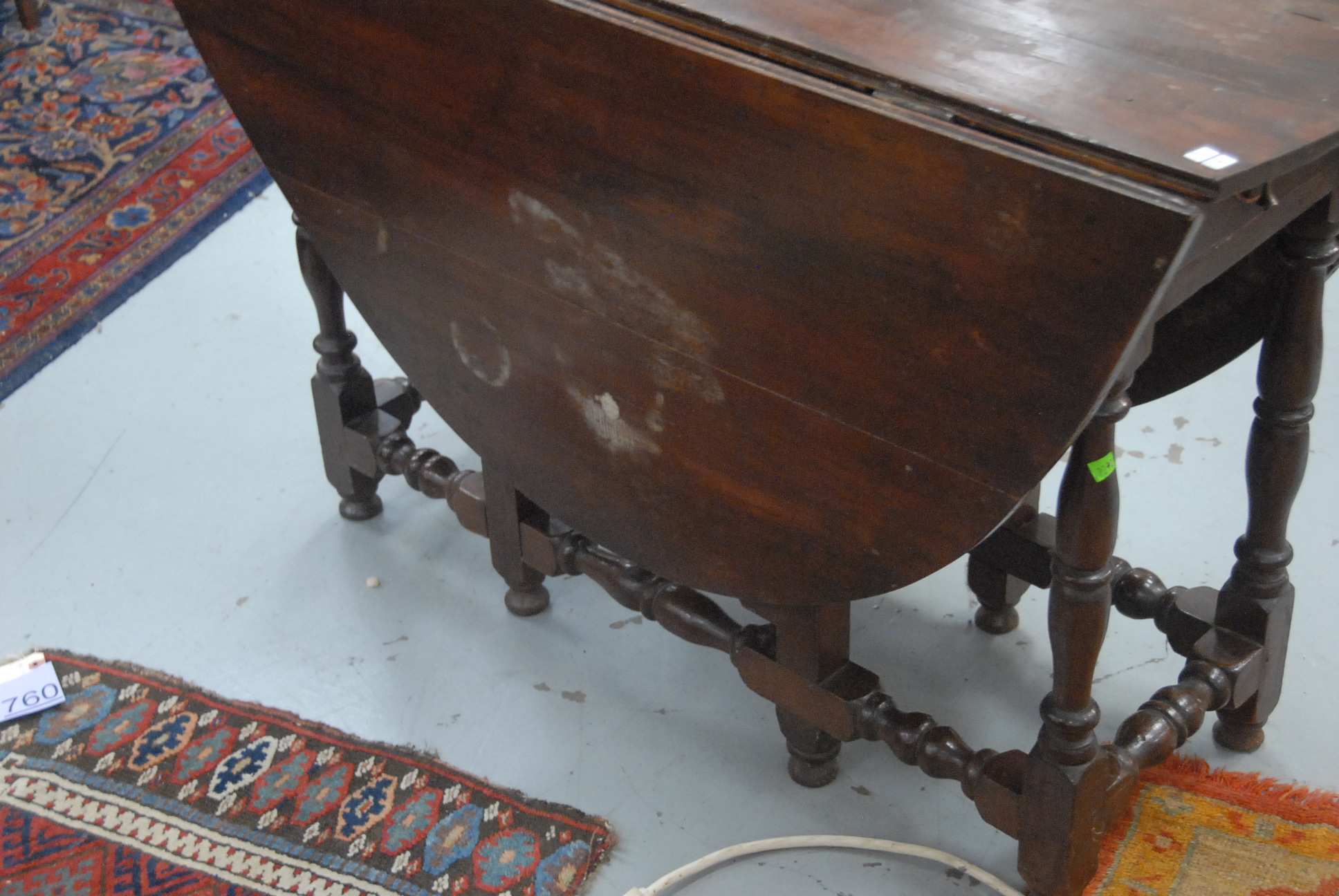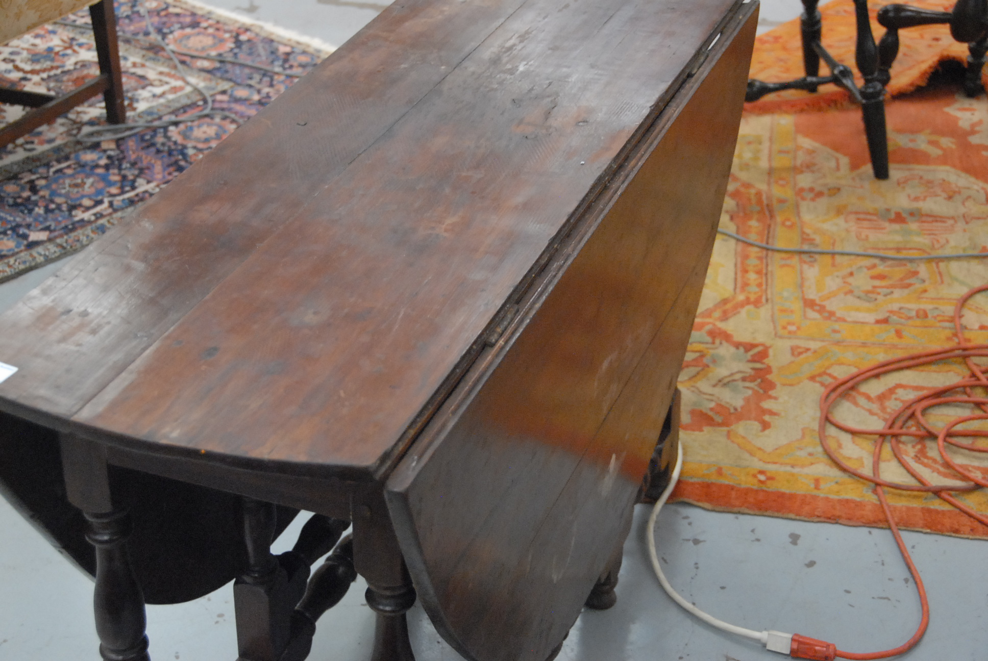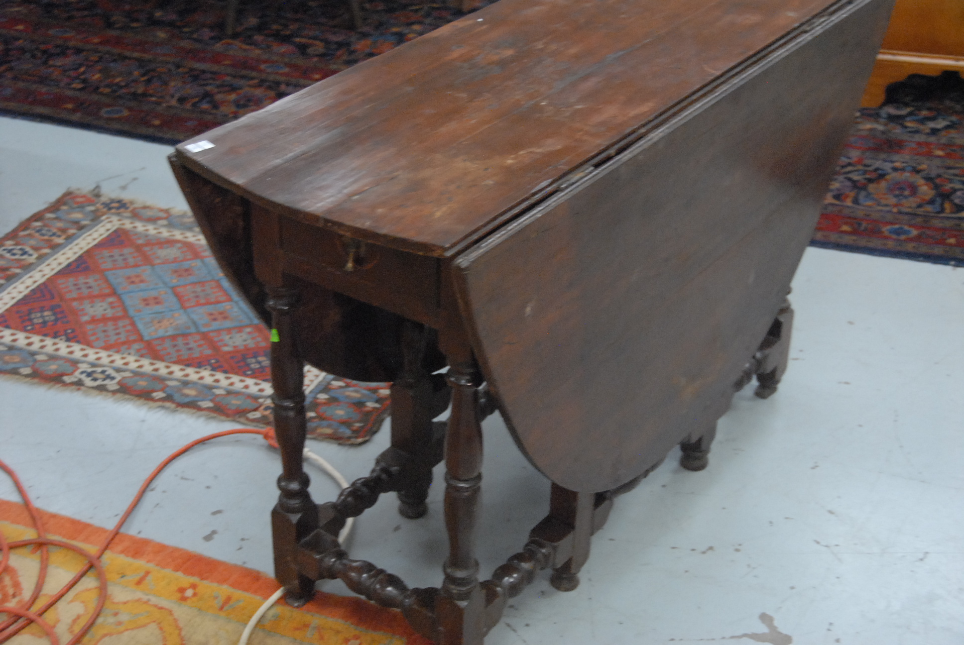 Lot 32: Walnut gateleg table having oval drop leaves and one drawer, on block and turned legs. ht. 29 in. wd. 15 1/2 in. lg. 46 in. opens to 58 in.