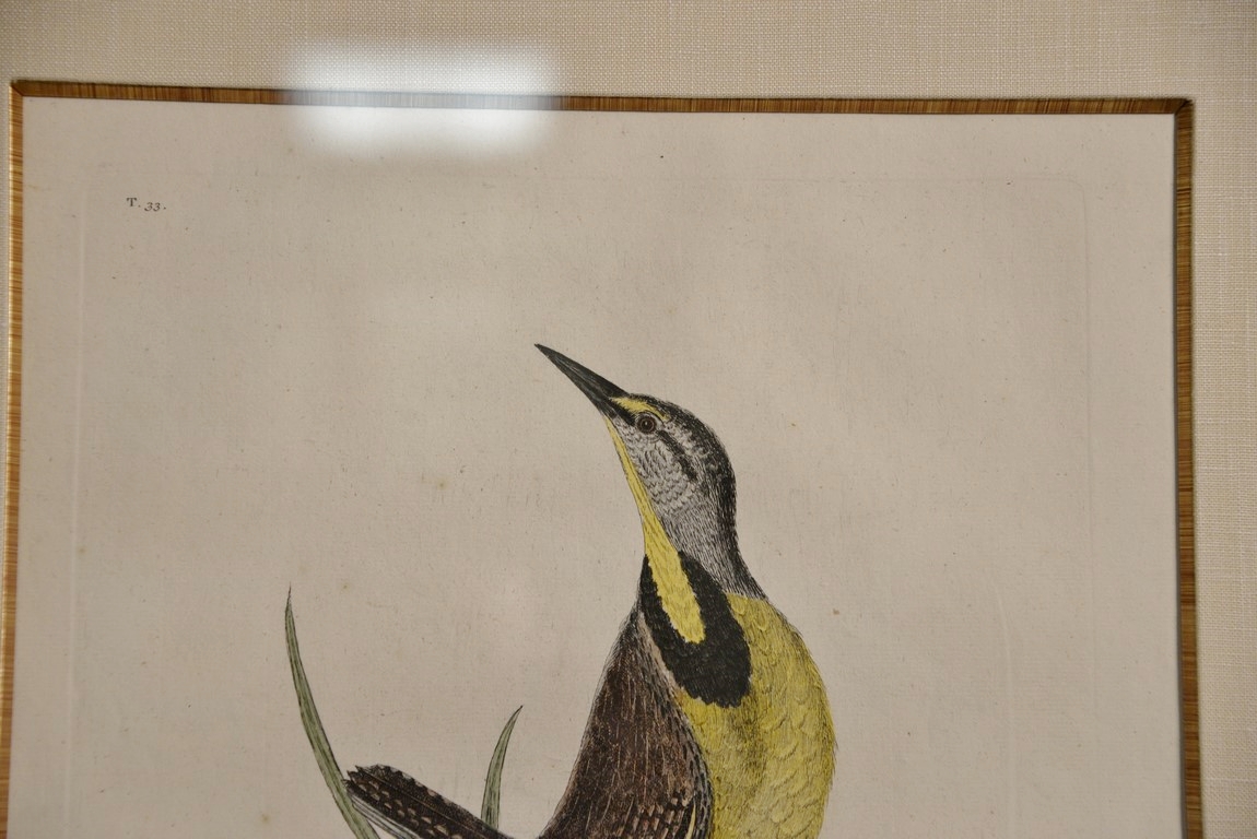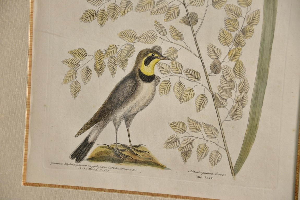 After Mark Catesby 1679-1749 pair of hand colored copper plate engravings The Large Lark, Alauda Magna Plate #T33 and The Lark, Alauda Gutture Flavo Plate #T32 From The Natural History of Carolina, Florida and the Bahama Islands framed by W. Graham Arader III sight size: 15 x 11 1/2 Provenance: Property from Credit Suisse’s Americana Collection