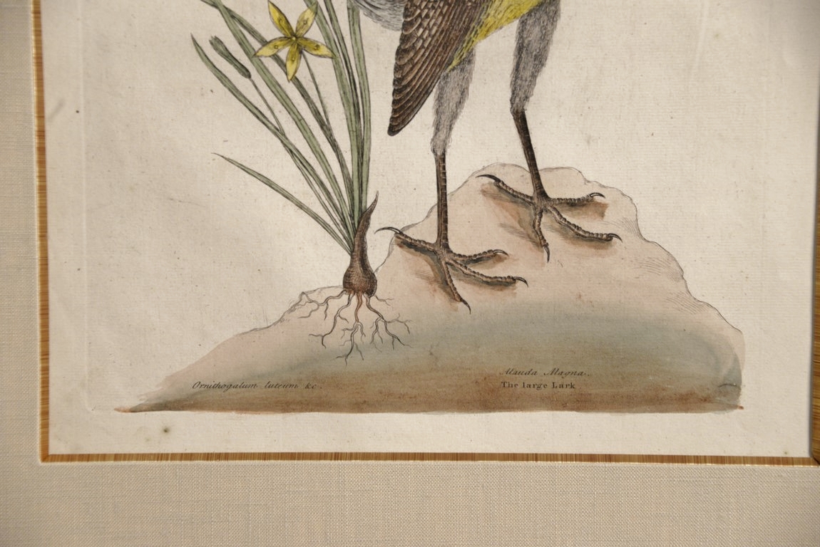 Lot 320: After Mark Catesby 1679-1749 pair of hand colored copper plate engravings The Large Lark, Alauda Magna Plate #T33 and
