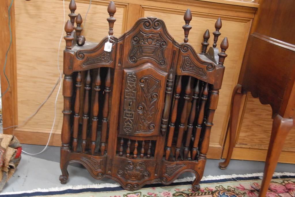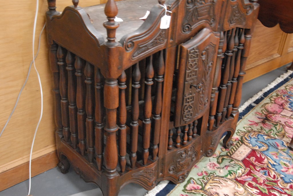 Lot 320: Continental panetiere bread cabinet with carved front and turned supports on cabriole legs. ht. 41in. wd. 31in.