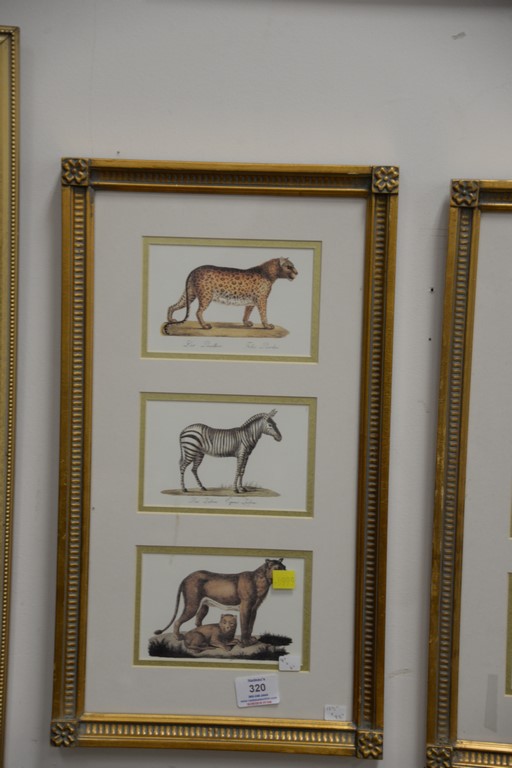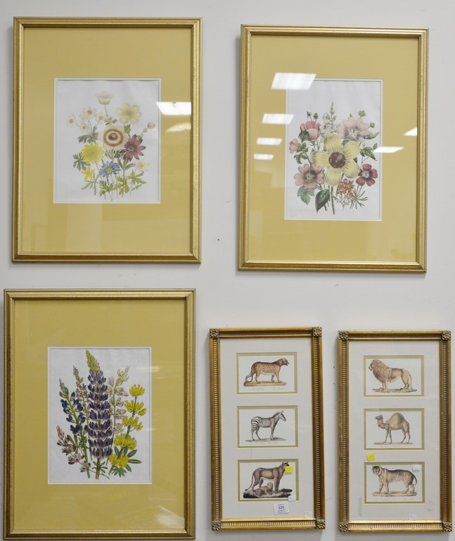 Lot 320: Group of six prints including a porch scene, three flower prints, and two triptic animal prints. 18 1/2 x 9 1/2 to 28 x 38