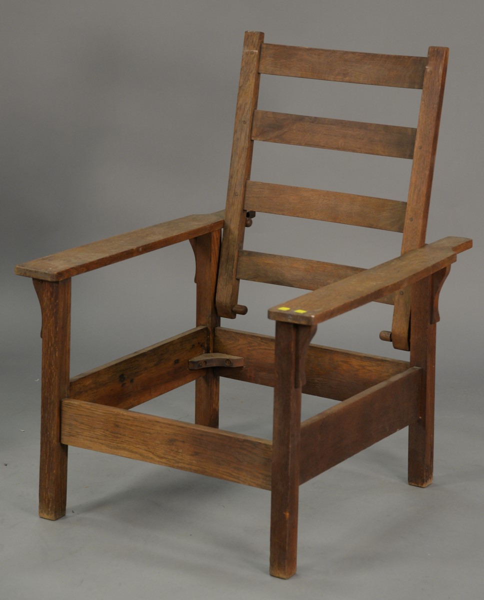 Gustav Stickley oak Morris chair marked with red mark no cushion.