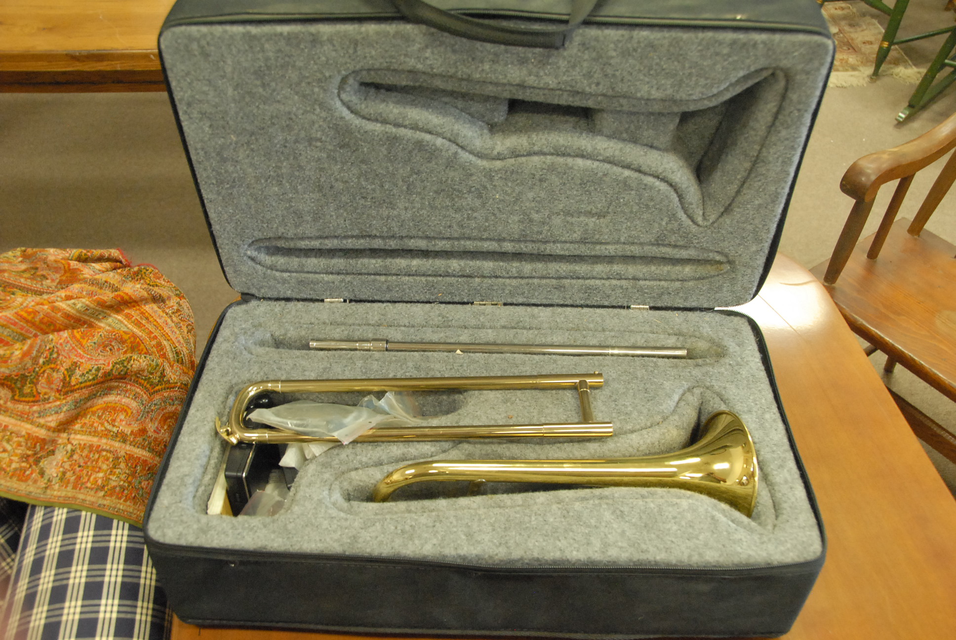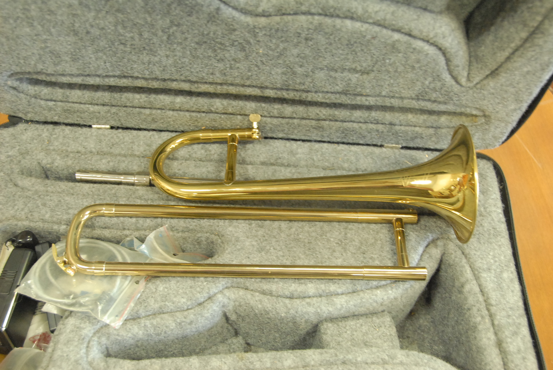 LA Sax brass trumpet in contemporary fitted case.