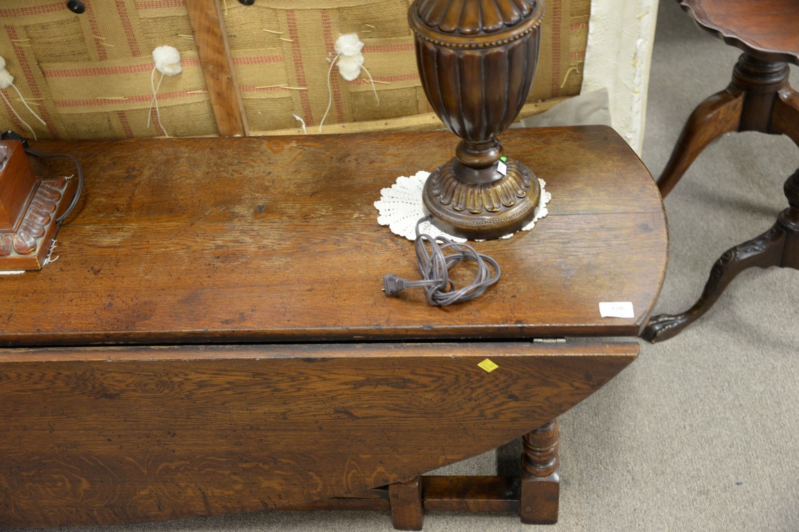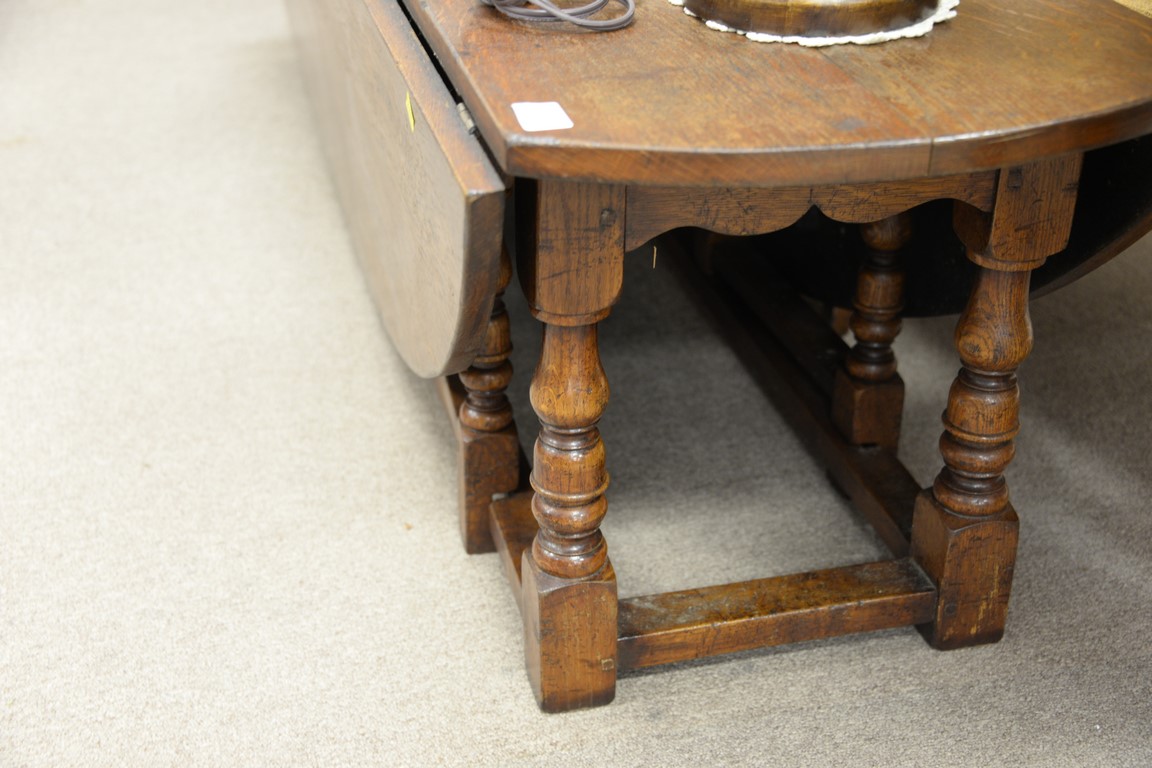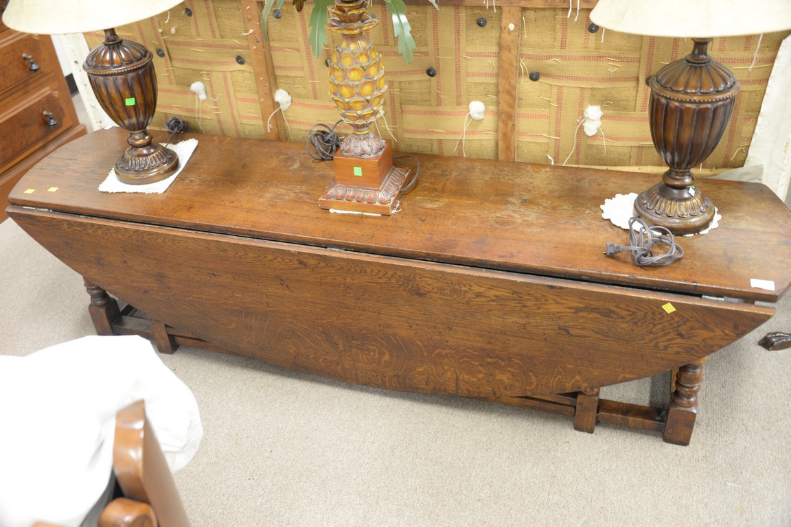 Lot 320: Large oak drop leaf gate leg coffee table low. ht. 18in., top: 16 x 72