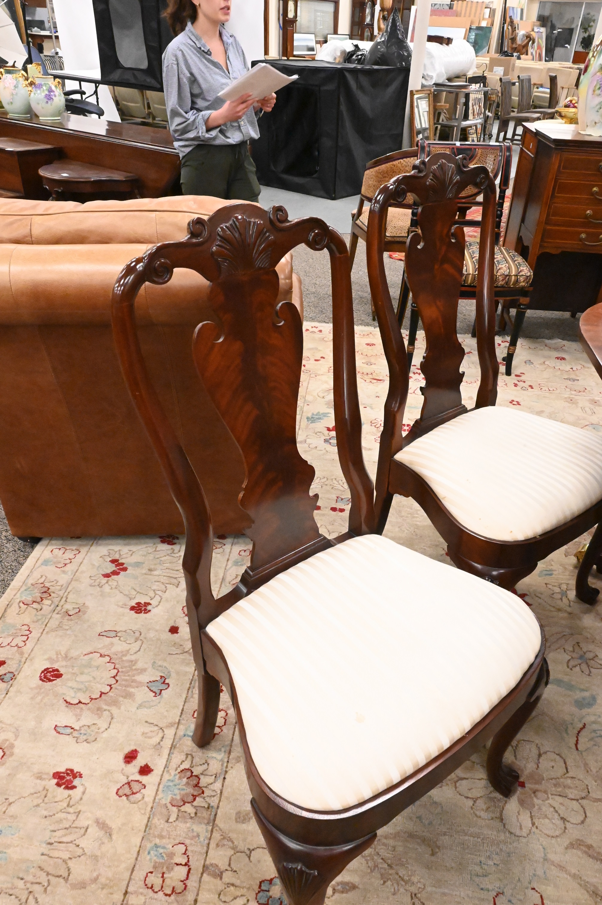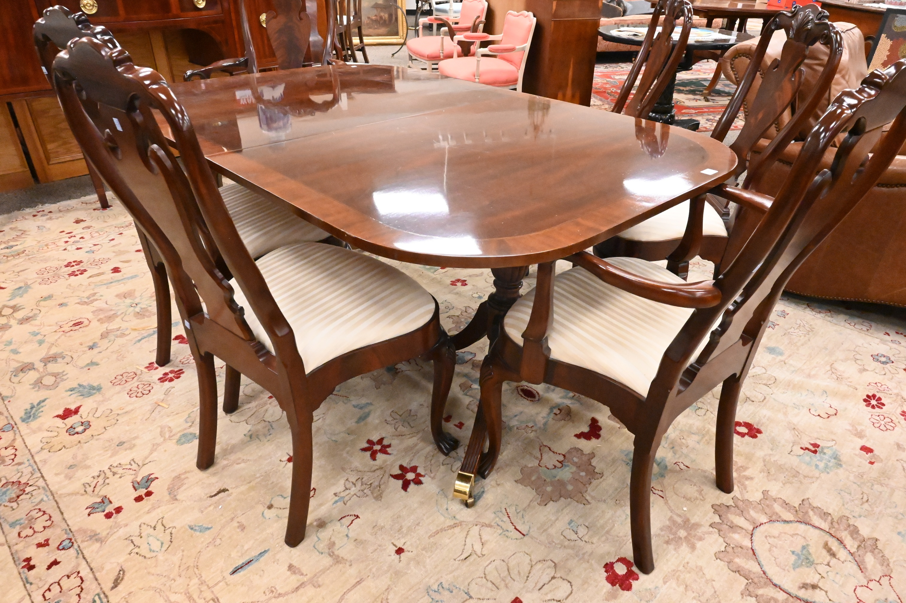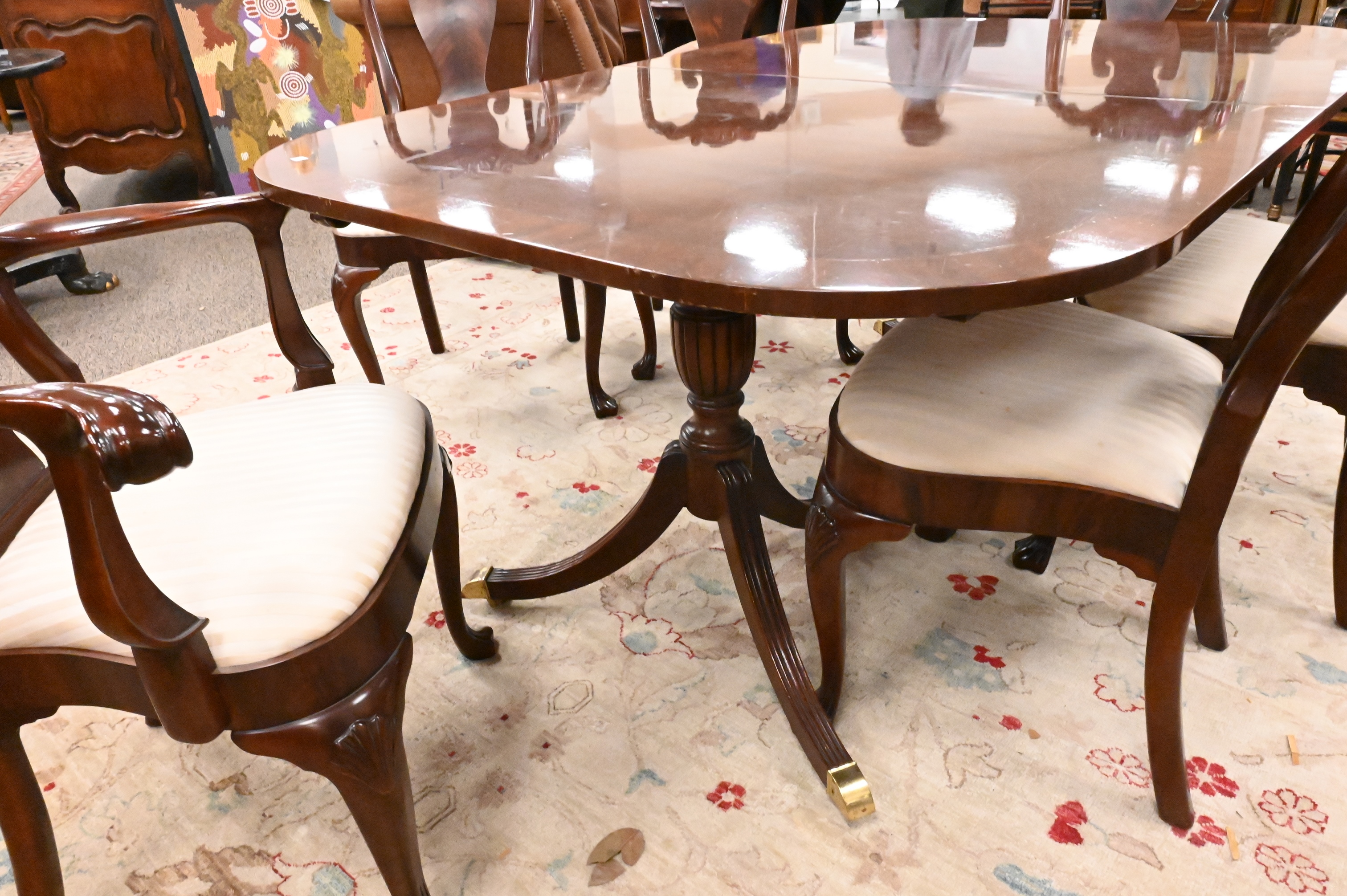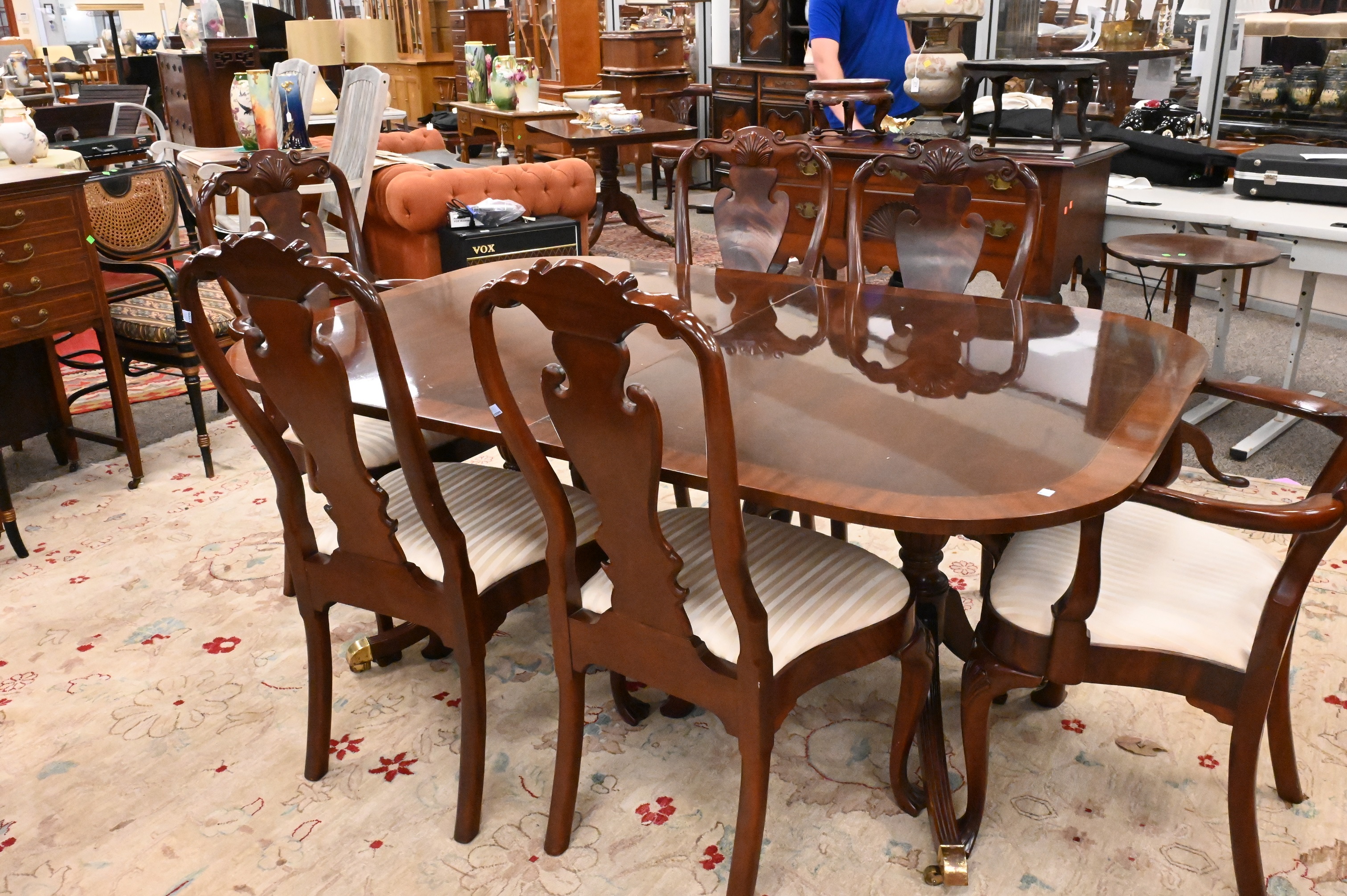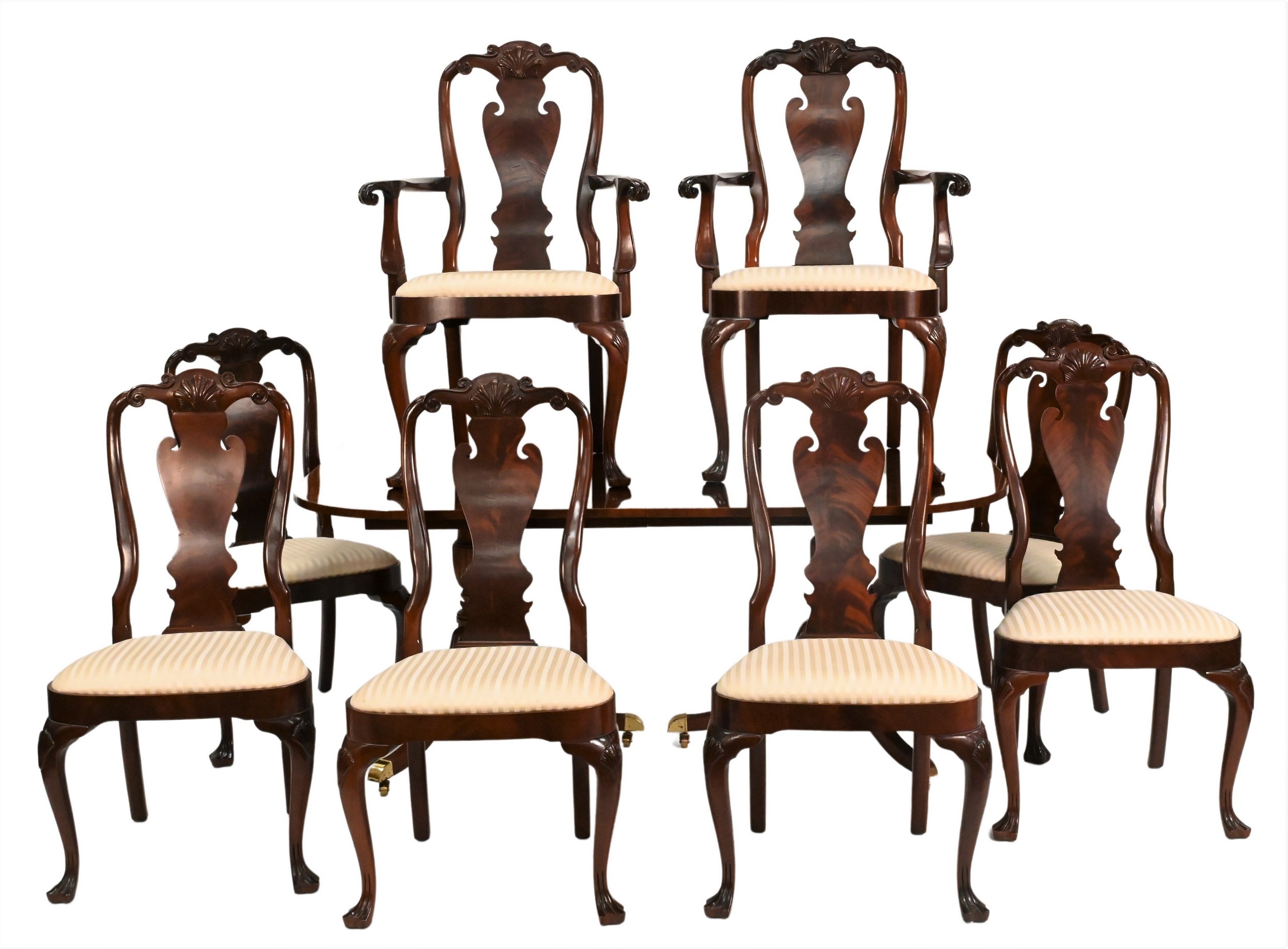 Nine Piece Queen Anne Dining Set, to include two arm and six side, along with banded inlaid mahogany double pedestal dining table, two leaves, open top 45″ x 116″, top 45″ x 68″, height 30 inches.