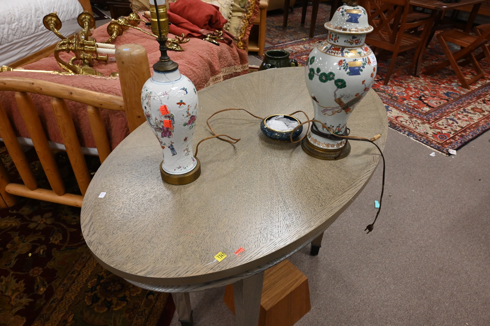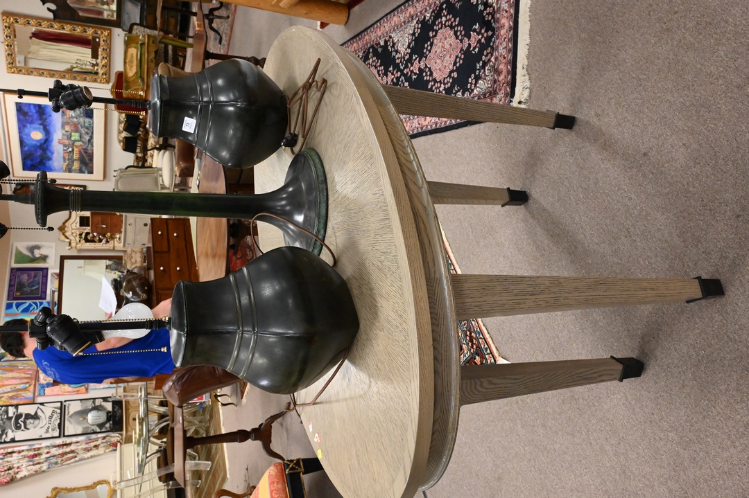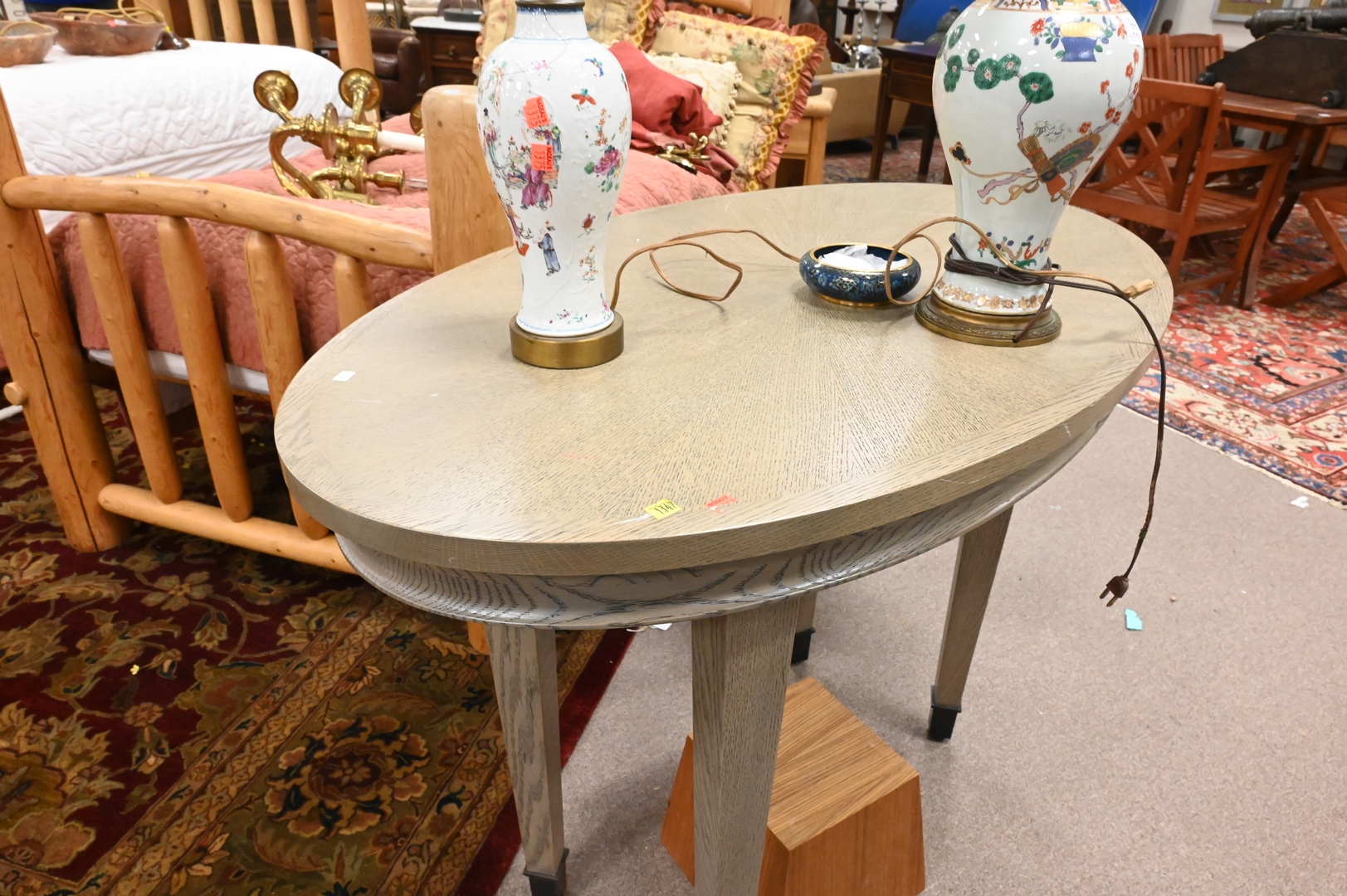 Pair of Oak Contemporary Oval Tables, having pickled grey finish, paint loss and chips, height 34 1/2 inches, top 28″ x 48″.