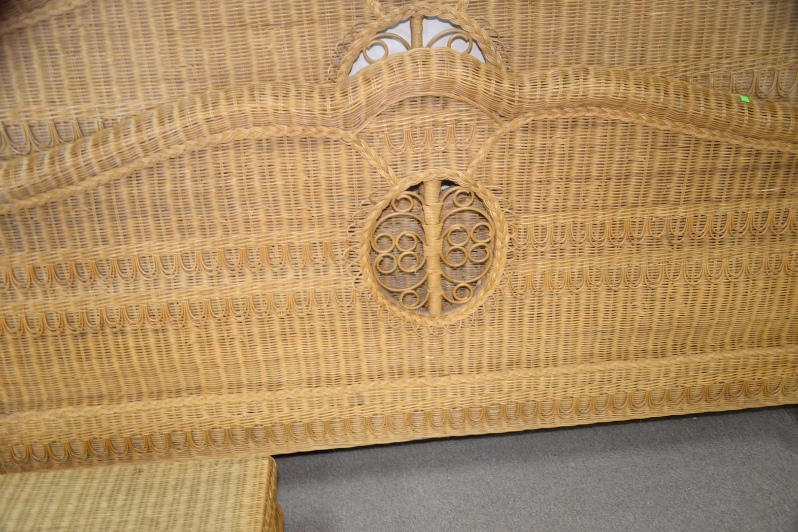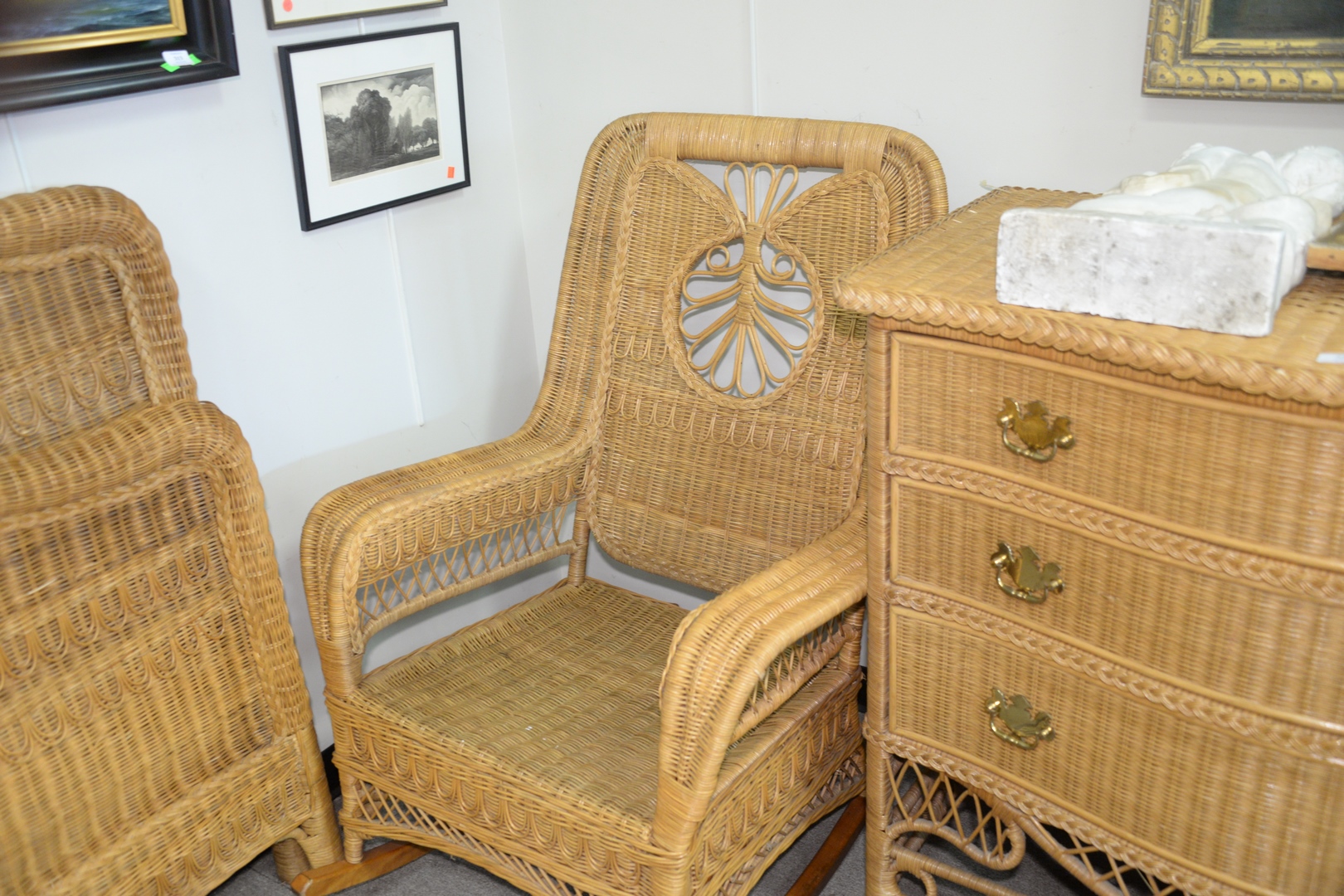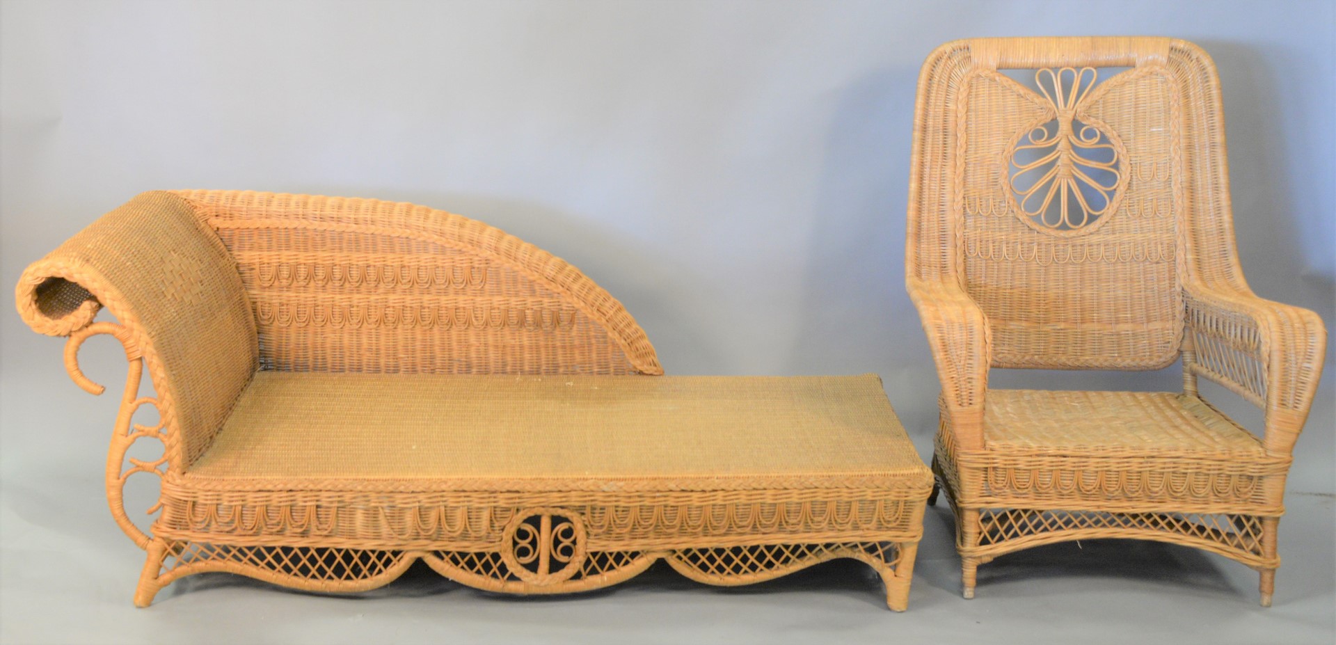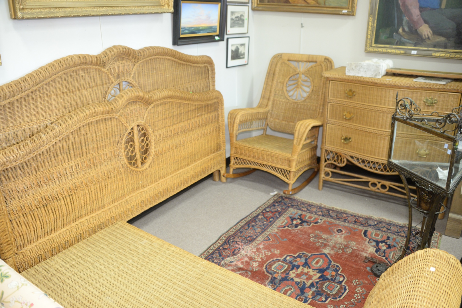 Lot 320: Ralph Lauren Four Piece Wicker Lot to include chest, rocker, king bed with rails and lounge chest height 42 inches, width 44 inches…