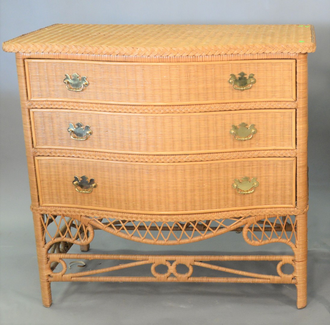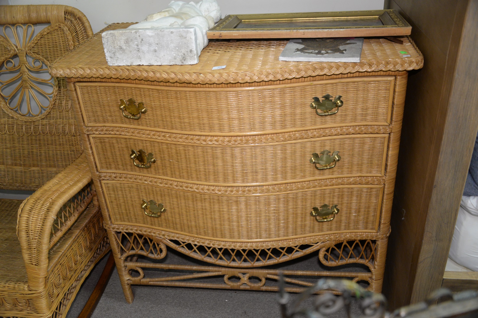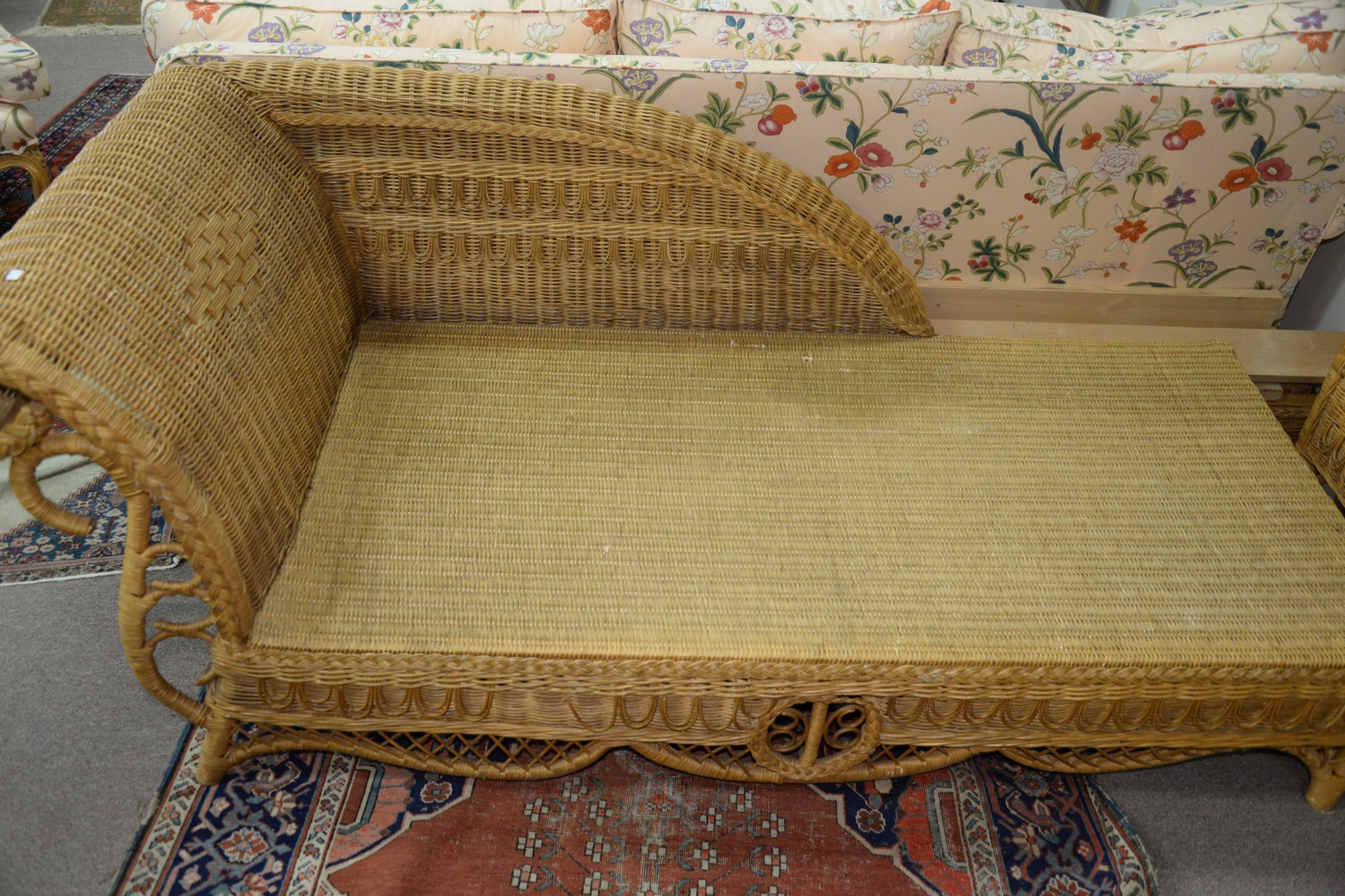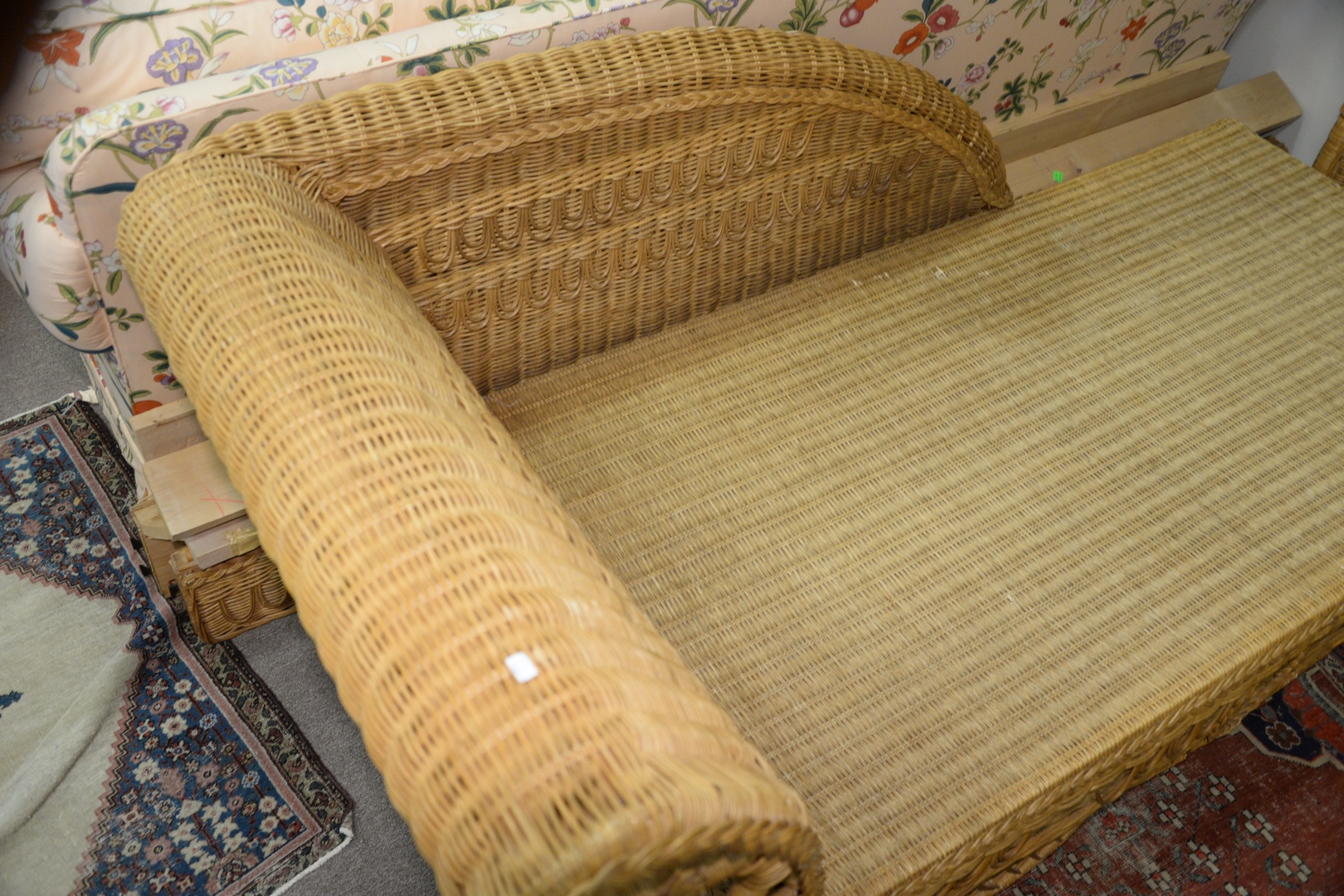 Lot 320: Ralph Lauren Four Piece Wicker Lot to include chest, rocker, king bed with rails and lounge chest height 42 inches, width 44 inches…