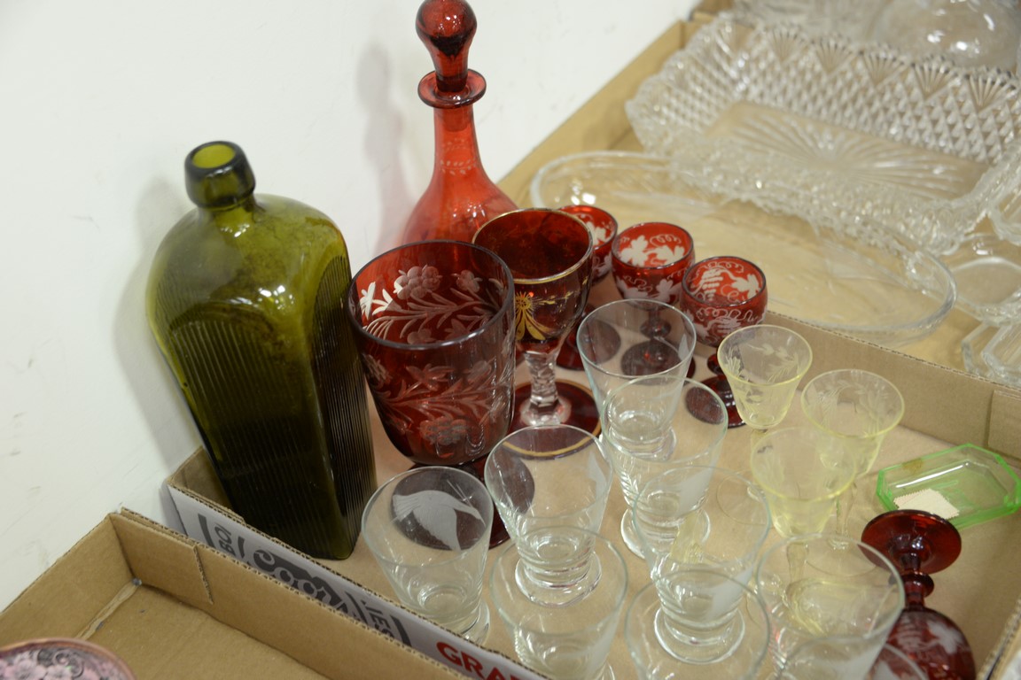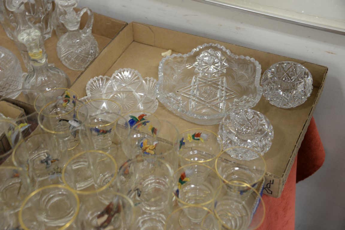 Six box lots of crystal and glass to include three large decanters, cut glass dishes, sandwich glass, Bohemian glass, etc.