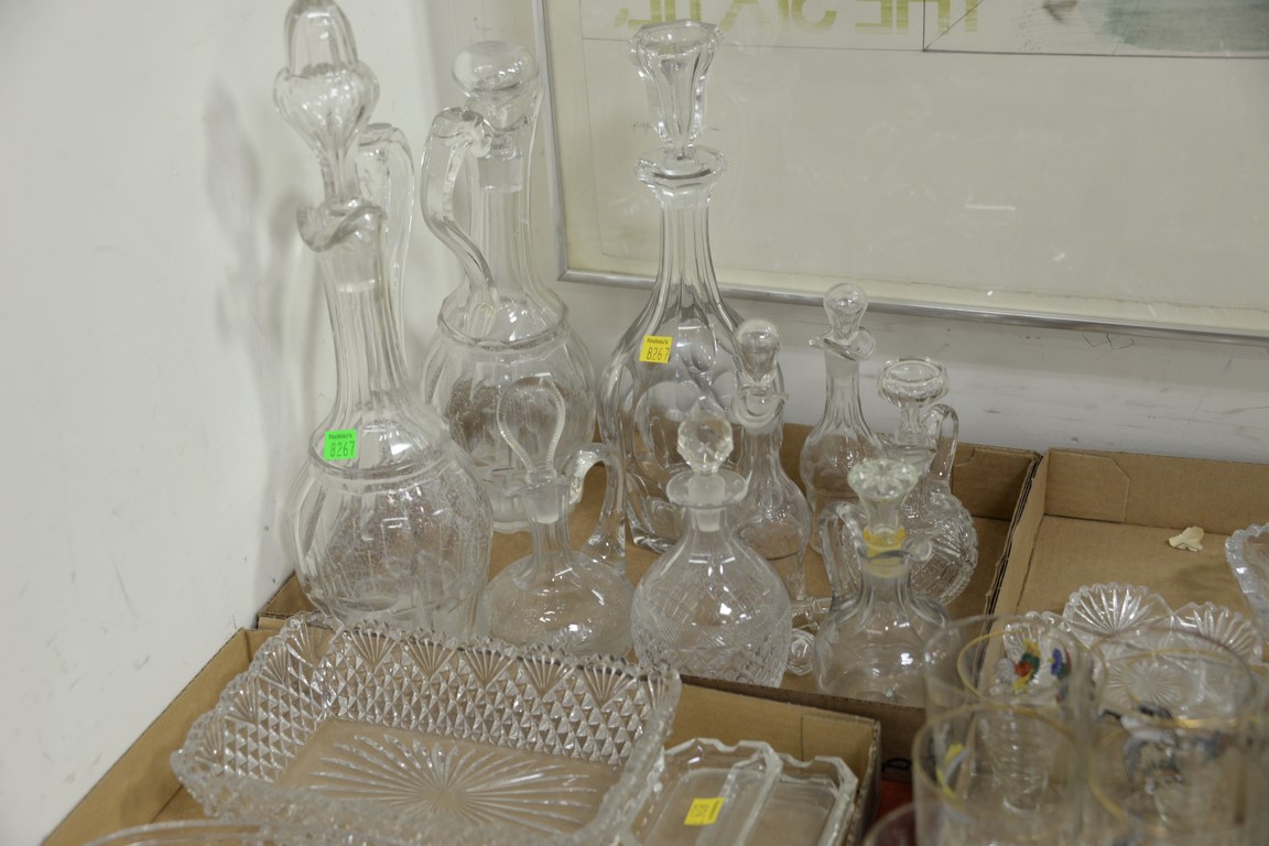 Lot 320: Six box lots of crystal and glass to include three large decanters, cut glass dishes, sandwich glass, Bohemian glass, etc.
