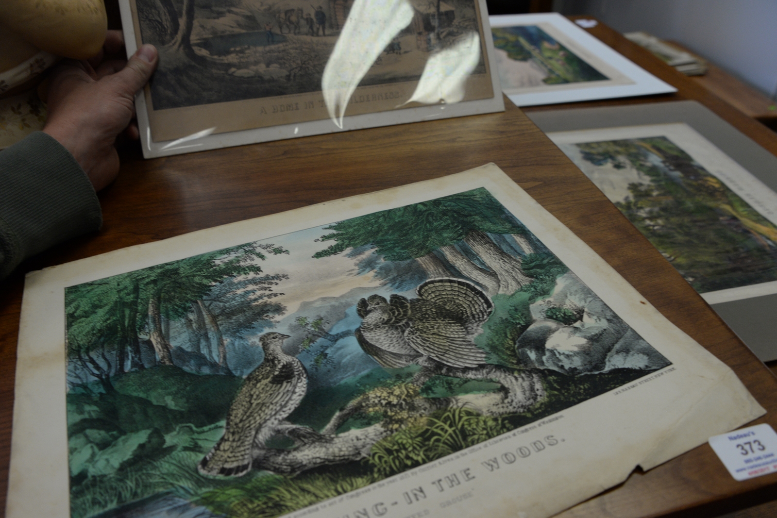 Six Currier & Ives colored lithographs, small folio to include Landing Trout, Summer Morning, Summer Afternoon, The Snow Storm, A Home in the Wilderness, and Mating in the Woods. image sizes 9 1/4 x 12 3/4 to 9 1/4 x 14